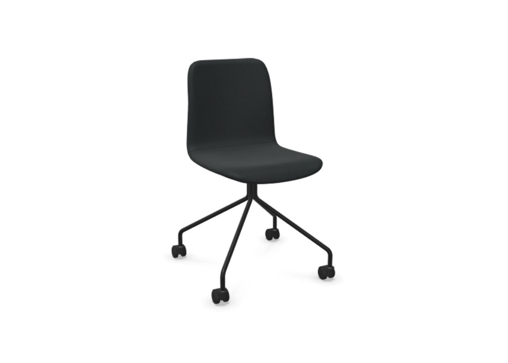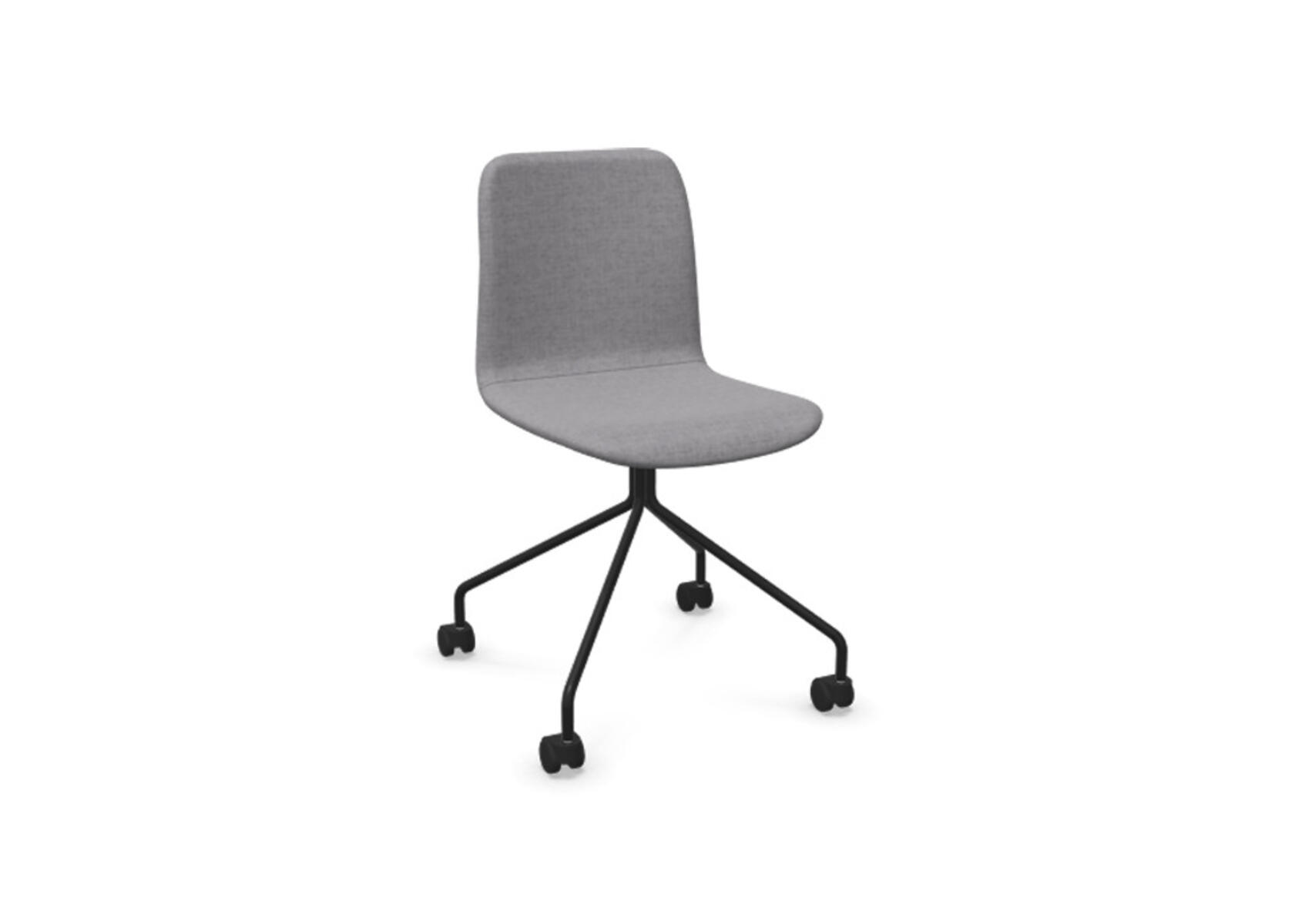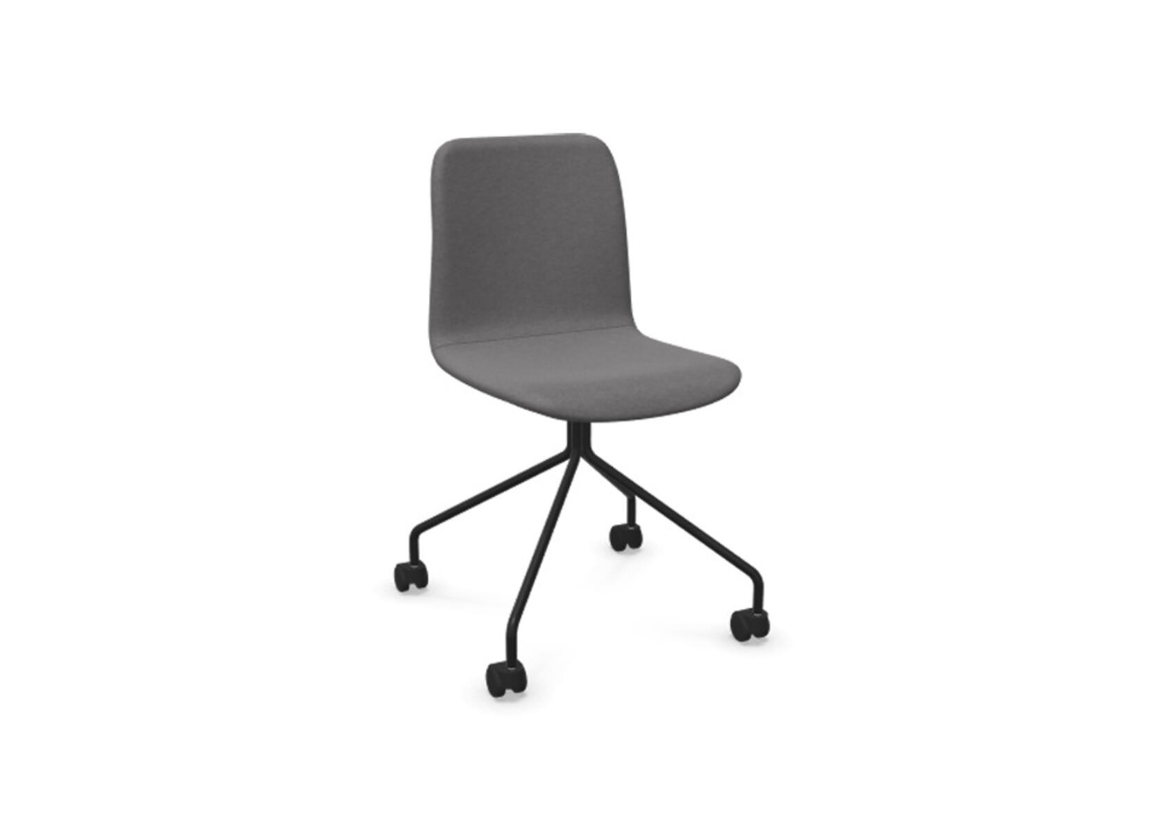 Seteskall i formpresset kryssfiner trukket med kaldskum, som gir både komfort og støtte. Stabilt pulverlakkert 4-kryss understell av 18 mm rør med hjul for harde gulv. Armlener finnes som tilvalg. Maksimal vekt: 110 kg. Stolen er verken høydejusterbar eller roterbar.