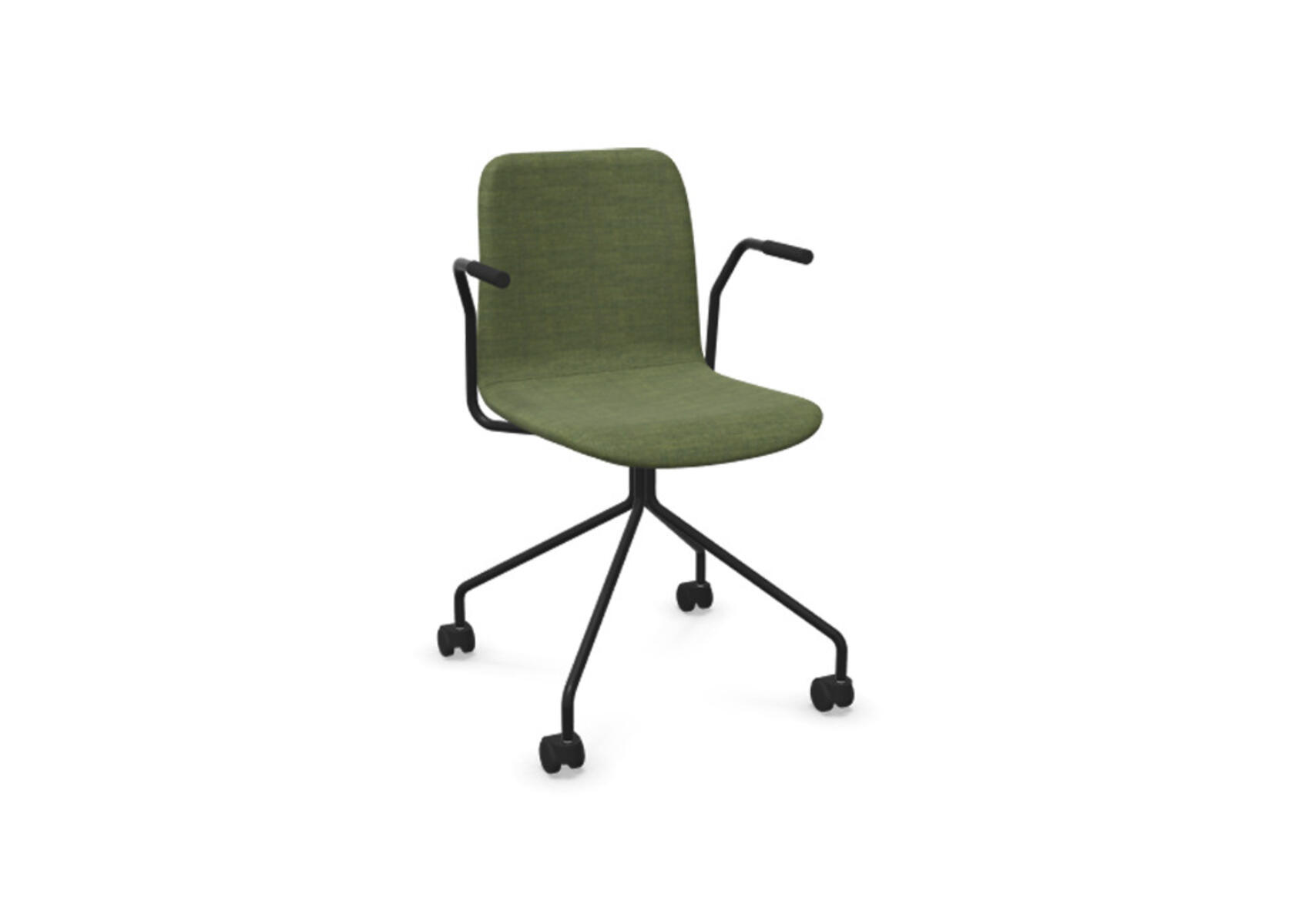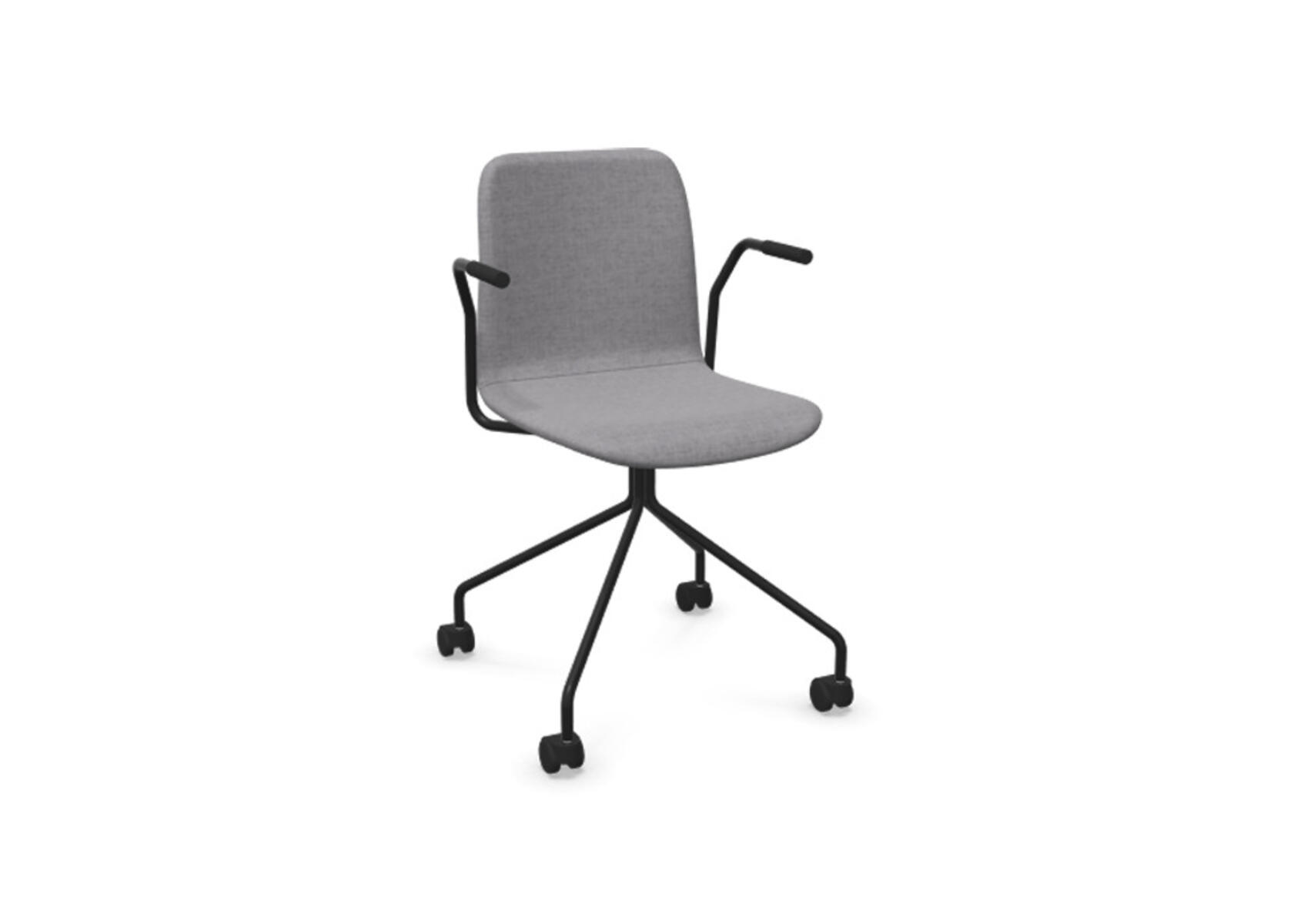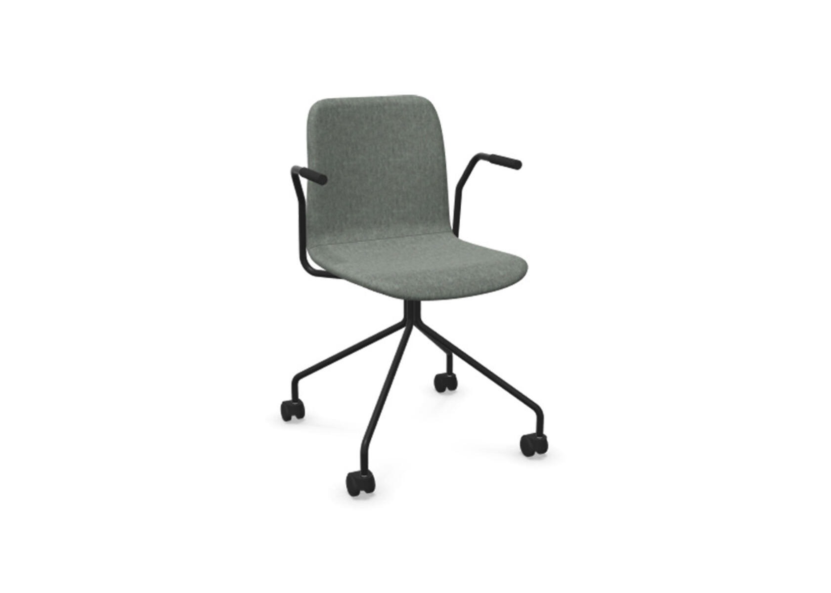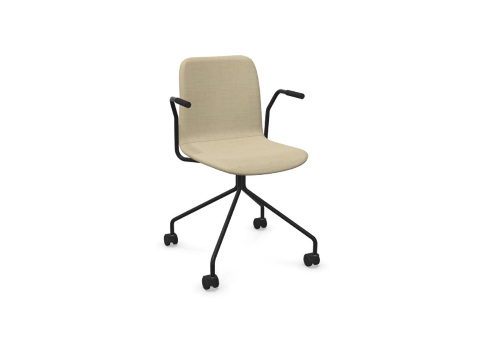 Seteskall i formpresset kryssfiner trukket med kaldskum, som gir både komfort og støtte. Stabilt pulverlakkert 4-kryss understell av 18 mm rør med hjul for harde gulv. Armlener finnes som tilvalg. Maksimal vekt: 110 kg. Stolen er verken høydejusterbar eller roterbar.