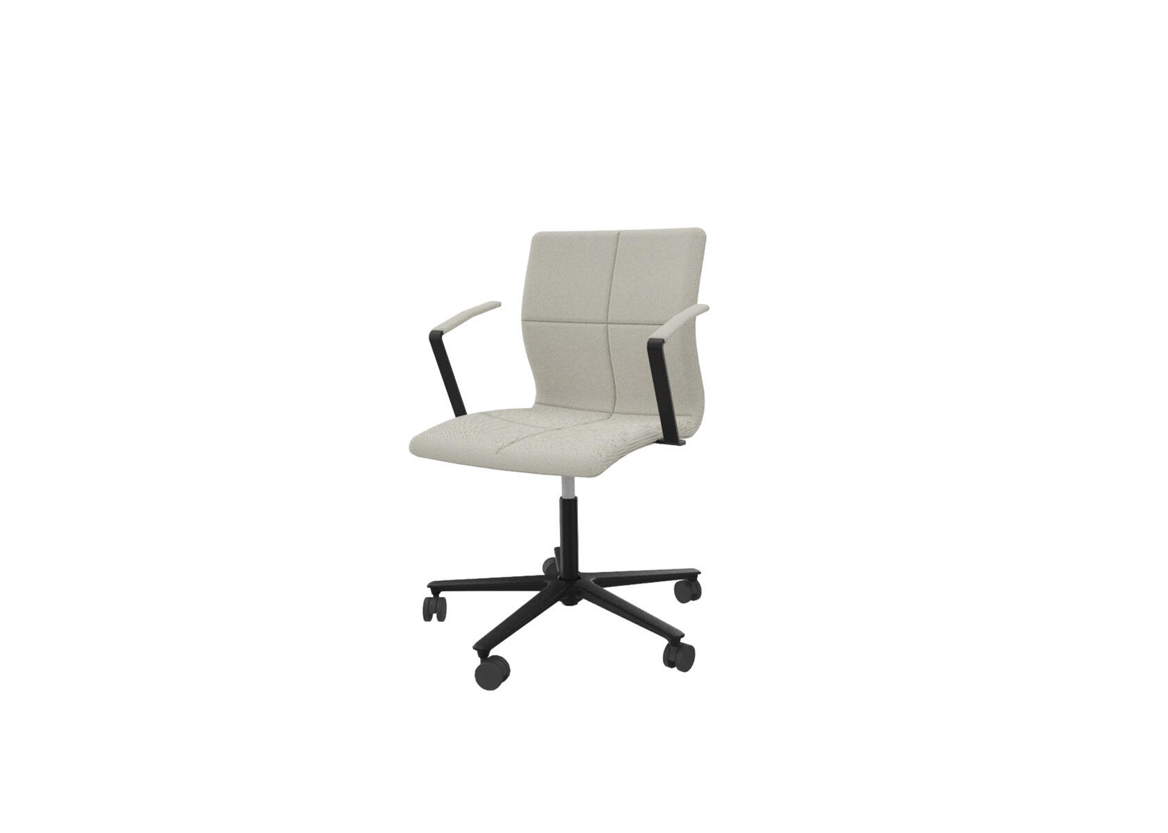 En tidløs, ergonomisk og komfortabel stol med quiltet, lav rygg og sete i formpresset finér polstret med kaldskum som gir både komfort og støtte. Vippemekanisme 7° bakover og 4° framover. Svart metallkryss med 5 harde hjul for myke gulv. Armlener finnes som tilvalg.