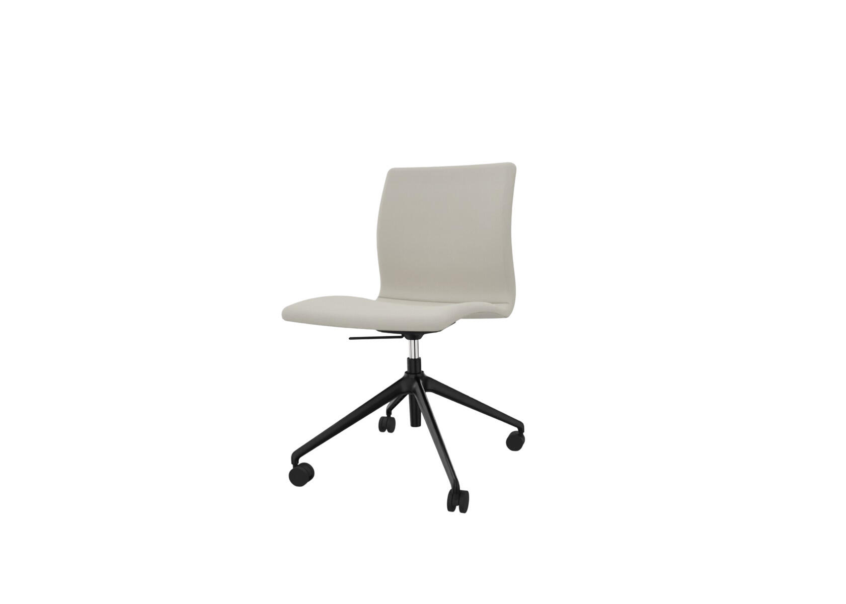 En tidløs, ergonomisk og komfortabel stol med quiltet, lav rygg og sete i formpresset finér polstret med kaldskum som gir både komfort og støtte. Vippemekanisme 7° bakover og 4° framover. Svart metallkryss med 4 hade hjul for myke gulv. Armlener finnes som tilvalg.