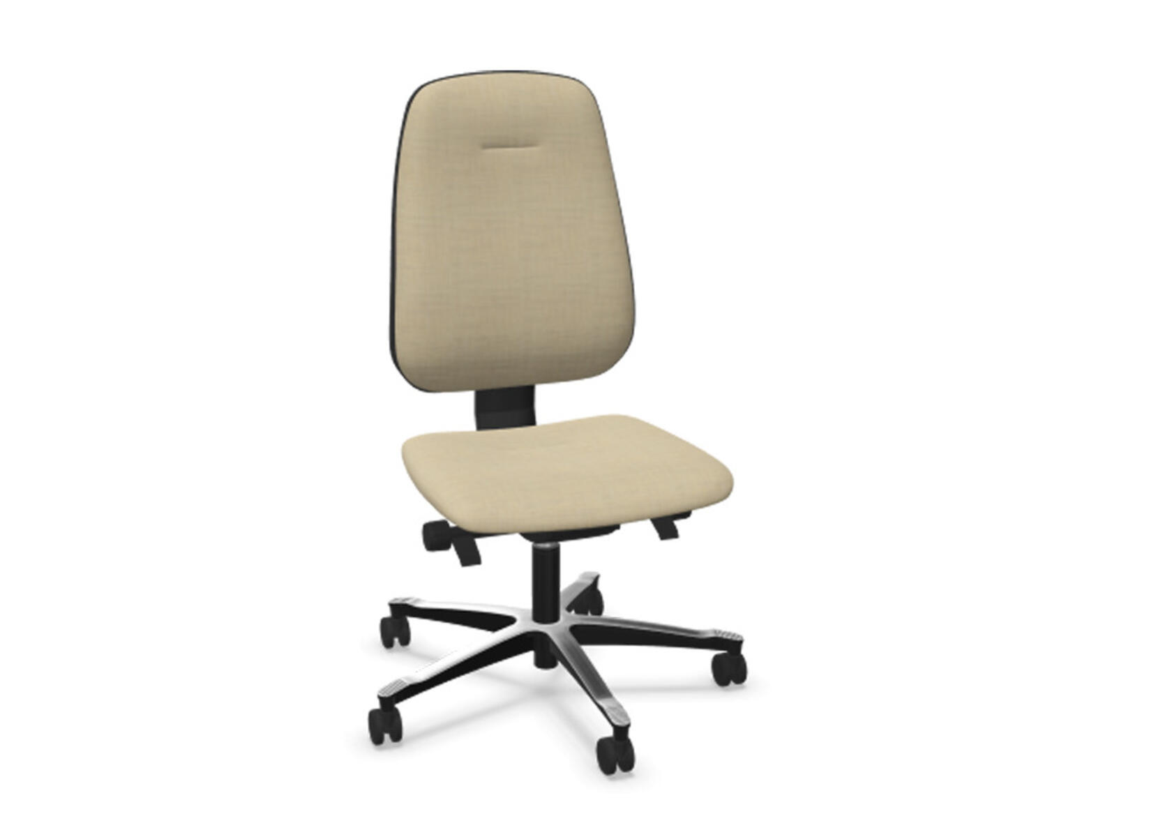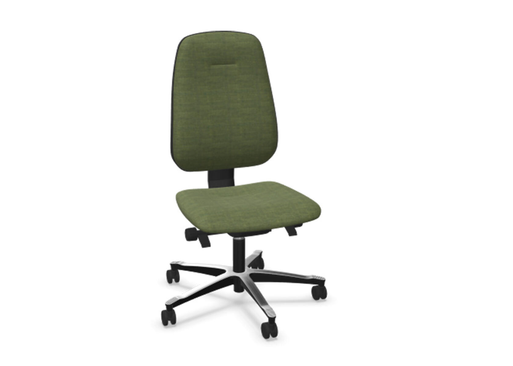 Ergonomisk kontorstol med delvis polstret høy rygg og synkronmekanisme, utformet for å gi støtte ved aktiv sitting gjennom hele arbeidsdagen. Den synkroniserte vinklingen mellom ryggstøtte og sete muliggjør en aktiv og komfortabel sittestilling. Ryggstøttens helningsvinkel er 20°, synkronisert med setets helningsvinkel på 11°. Ryggstøtten kan låses i 5 ulike posisjoner for individuell tilpasning, og motstanden i ryggstøtten justeres enkelt med et dreiehjul. Ryggstøtten er høydejusterbar innenfor et område på 75 mm med 13 låsbare trinn. Stolen har også Anti-Shock-funksjon som forhindrer at ryggstøtten slår tilbake når helningen låses opp. Velg mellom kryss i svart polyamid eller polert aluminium, samt selvbremsende hjul for myke eller harde gulv. Armlener i 2D, 3D eller 4D selges separat.