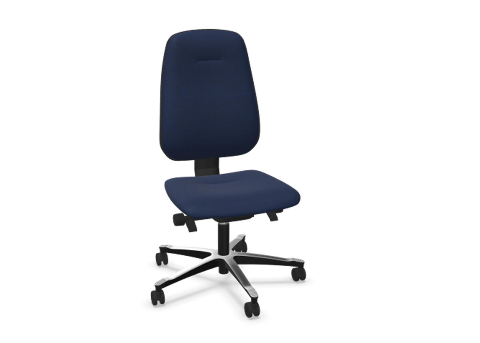 Ergonomisk kontorstol med delvis polstret høy rygg og synkronmekanisme samt justering av setedybde, utformet for å gi støtte ved aktiv sitting gjennom hele arbeidsdagen. Den synkroniserte vinklingen mellom ryggstøtte og sete muliggjør en aktiv og komfortabel sittestilling. Ryggstøttens helningsvinkel er 20°, synkronisert med setets helningsvinkel på 11°. Ryggstøtten kan låses i 5 ulike posisjoner for individuell tilpasning, og motstanden justeres enkelt med et dreiehjul. Ryggstøtten er høydejusterbar innenfor et område på 70 mm med 13 låsbare trinn. Setedybden kan justeres innenfor et område på 50 mm. Stolen har også Anti-Shock-funksjon som forhindrer at ryggstøtten slår tilbake når helningen låses opp. Velg mellom kryss i svart polyamid eller polert aluminium, samt selvbremsende hjul for myke eller harde gulv. Armlener i 2D, 3D eller 4D selges separat.