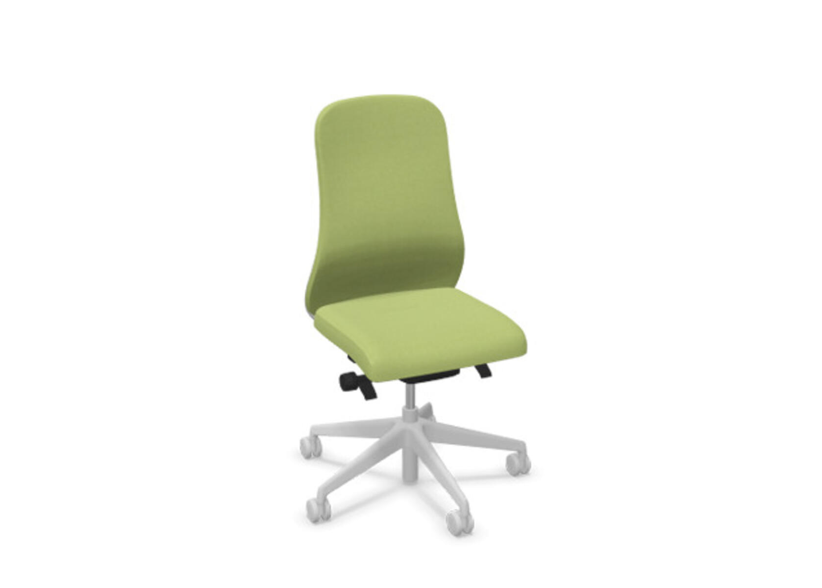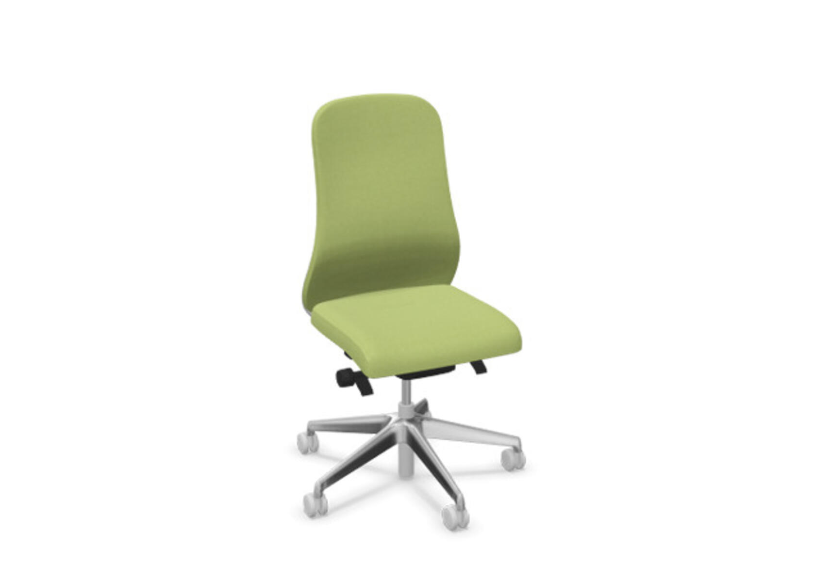 Moderne og ergonomisk kontorstol med delvis polstret rygg og avansert synkronmekanisme samt justering av sittedybde, utformet for å gi støtte ved aktiv sitting gjennom hele arbeidsdagen. Trukket i polyesterstoff. Den synkroniserte bevegelsen mellom rygg og sete gir en aktiv og komfortabel sittestilling. Ryggens vippevinkel er 23° synkronisert med setets vippevinkel på 10°. Ryggstøtten kan låses i 5 ulike posisjoner for individuell tilpasning, og motstanden i ryggstøtten justeres enkelt med et dreiehjul, 7 nivåer. Ryggstøtten er ikke høydejusterbar. Sittedybden kan justeres innenfor et område på 60 mm, med 7 låsbare posisjoner. Stolen har også Anti-Shock-funksjon som hindrer at ryggstøtten slår tilbake når låsen frigjøres. Velg mellom kryss i lysgrå polyamid eller polert aluminium samt selvbremsende hjul for myke eller harde gulv. Som tilvalg finnes også korsryggstøtte, manuelt høydejusterbar (55 mm). Armlener i 2D, 3D eller 4D selges separat.