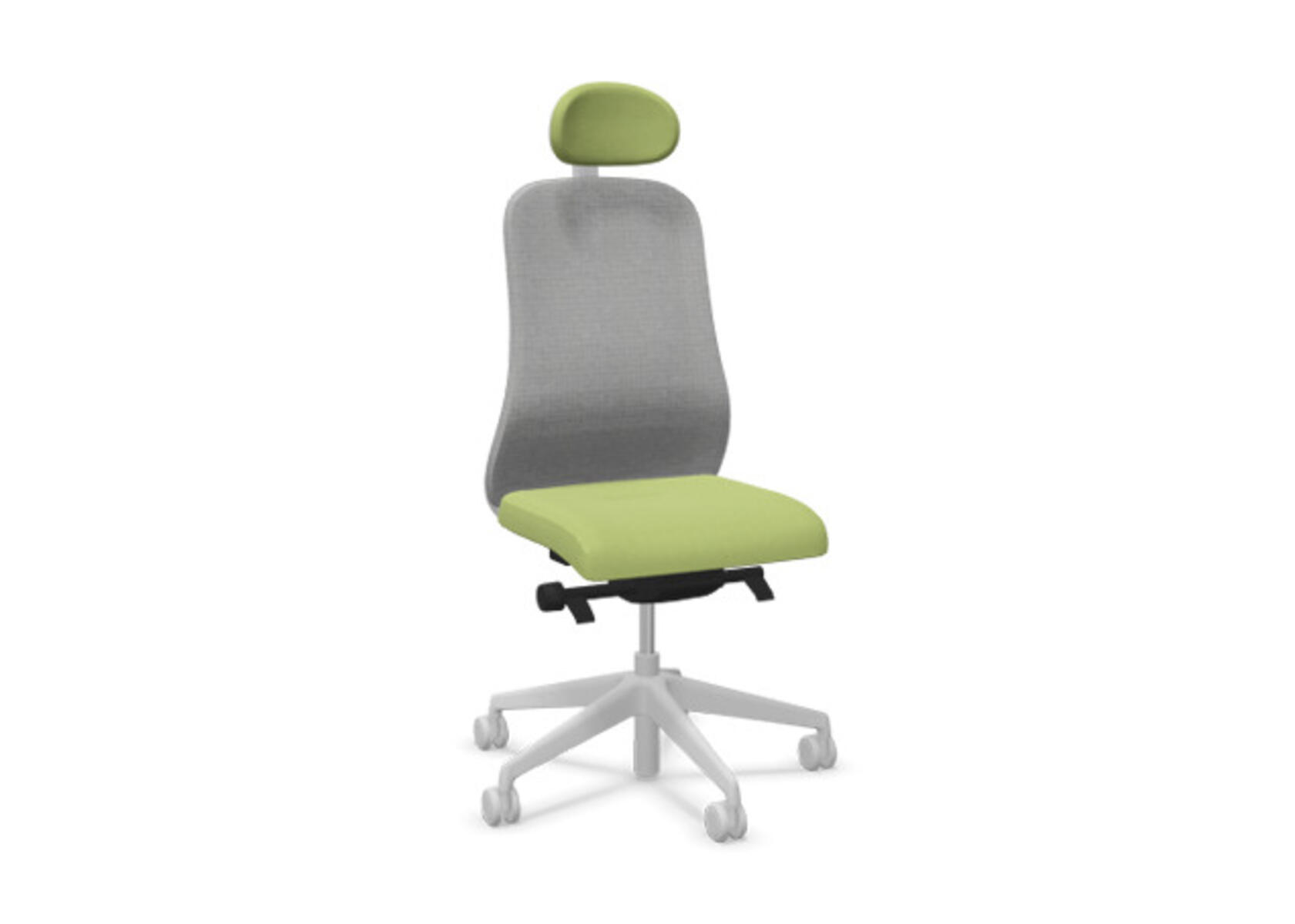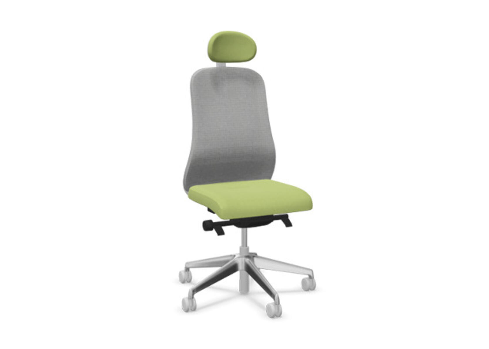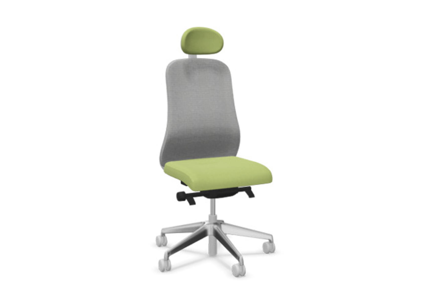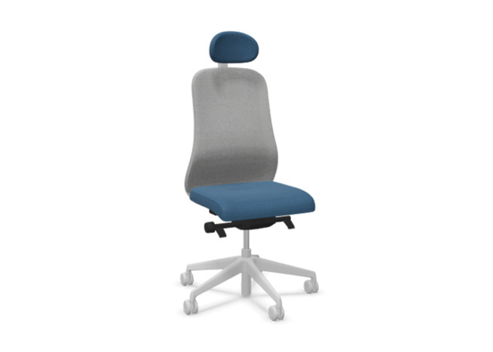 Moderne og ergonomisk kontorstol med delvis polstret rygg og synkronmekanisme samt justering av sitterdybde, utformet for å gi støtte ved aktiv sitting gjennom hele arbeidsdagen. Trukket i polyesterstoff. Den synkroniserte bevegelsen mellom rygg og sete gir en aktiv og komfortabel sittestilling. Ryggens vippevinkel er 21° synkronisert med setets vippevinkel på 7°. Ryggstøtten kan låses i 4 ulike posisjoner og har en funksjon som automatisk justerer motstanden ihht brukerens vekt og gir mulighet til for ytterligere justering i 3 posisjoner. Ryggstøtten er ikke høydejusterbar. Sittedybden kan justeres innenfor et område på 60 mm, med 7 låsbare posisjoner. Stolen har også Anti-Shock-funksjon som hindrer at ryggstøtten slår tilbake når låsen frigjøres. Polstret nakkestøtte, justerbar innenfor intervaller: dybde 20 mm, vinkel 70° og høyde 100 mm. Velg mellom kryss i lysgrå polyamid eller polert aluminium samt selvbremsende hjul for myke eller harde gulv. Som tilvalg finnes også korsryggstøtte, manuelt høydejusterbar (55 mm). Armlener i 2D, 3D eller 4D selges separat.