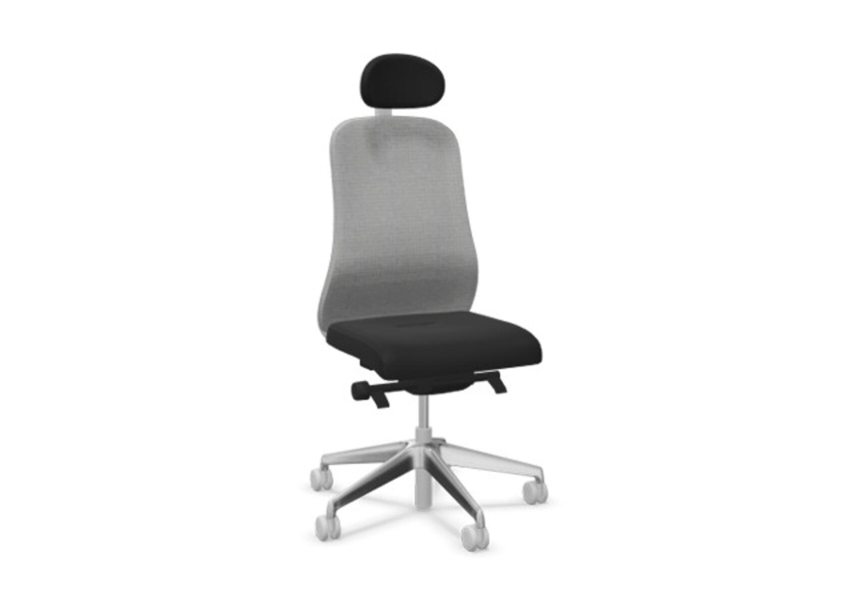 Moderne og ergonomisk kontorstol med delvis polstret rygg og synkronmekanisme samt justering av sittedybde, utformet for å gi støtte ved aktiv sitting gjennom hele arbeidsdagen. Trukket i polyesterstoff. Den synkroniserte bevegelsen mellom rygg og sete gir en aktiv og komfortabel sittestilling. Ryggens vippevinkel er 21° synkronisert med setets vippevinkel på 7°. Ryggstøtten kan låses i 4 ulike posisjoner og har en funksjon som automatisk justerer motstanden ihht brukerens vekt og gir mulighet til for ytterligere justering i 3 posisjoner. Ryggstøtten er ikke høydejusterbar. Sittedybden kan justeres innenfor et område på 60 mm, med 7 låsbare posisjoner. Stolen har også Anti-Shock-funksjon som hindrer at ryggstøtten slår tilbake når låsen frigjøres. Polstret nakkestøtte, justerbar innenfor intervaller: dybde 20 mm, vinkel 70° og høyde 100 mm. Velg mellom kryss i lysgrå polyamid eller polert aluminium samt selvbremsende hjul for myke eller harde gulv. Som tilvalg finnes også korsryggstøtte, manuelt høydejusterbar (55 mm). Armlener i 2D, 3D eller 4D selges separat.