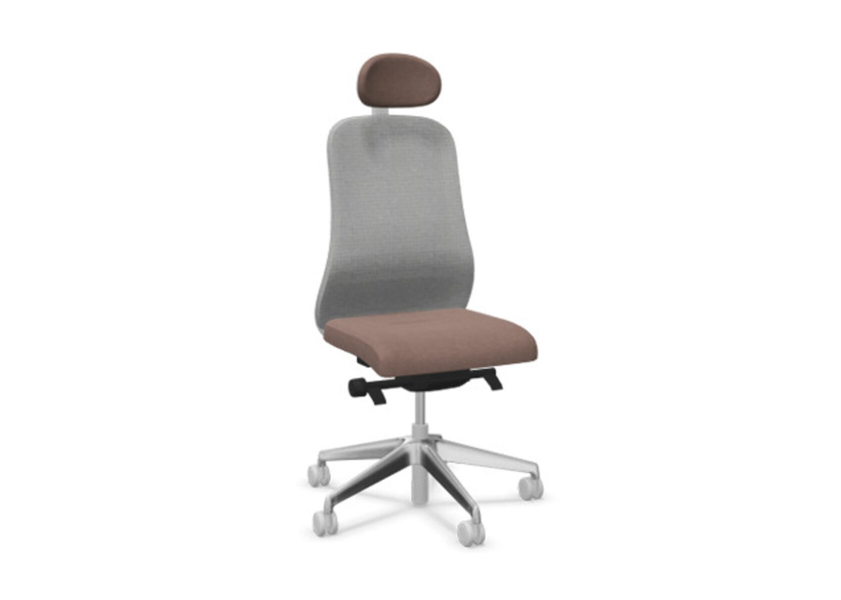 Moderne og ergonomisk kontorstol med delvis polstret rygg og synkronmekanisme samt justering av sittedybde, utformet for å gi støtte ved aktiv sitting gjennom hele arbeidsdagen. Trukket i polyesterstoff. Den synkroniserte bevegelsen mellom rygg og sete gir en aktiv og komfortabel sittestilling. Ryggens vippevinkel er 21° synkronisert med setets vippevinkel på 7°. Ryggstøtten kan låses i 4 ulike posisjoner og har en funksjon som automatisk justerer motstanden ihht brukerens vekt og gir mulighet til for ytterligere justering i 3 posisjoner. Ryggstøtten er ikke høydejusterbar. Sittedybden kan justeres innenfor et område på 60 mm, med 7 låsbare posisjoner. Stolen har også Anti-Shock-funksjon som hindrer at ryggstøtten slår tilbake når låsen frigjøres. Velg mellom kryss i lysgrå polyamid eller polert aluminium samt selvbremsende hjul for myke eller harde gulv. Som tilvalg finnes også korsryggstøtte, manuelt høydejusterbar (55 mm). Armlener i 2D, 3D eller 4D selges separat.