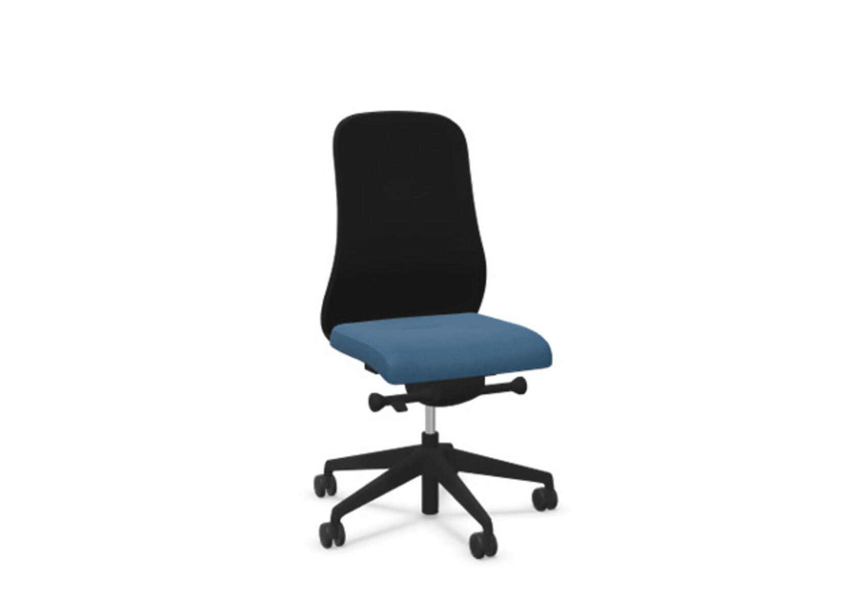Moderne og ergonomisk kontorstol med delvis polstret rygg og synkronmekanisme samt justering av sittedybde, utformet for å gi støtte ved aktiv sitting gjennom hele arbeidsdagen. Trukket i polyesterstoff. Den synkroniserte bevegelsen mellom rygg og sete gir en aktiv og komfortabel sittestilling. Ryggens vippevinkel er 21° synkronisert med setets vippevinkel på 7°. Ryggstøtten kan låses i 4 ulike posisjoner og har en funksjon som automatisk justerer motstanden ihht brukerens vekt og gir mulighet til for ytterligere justering i 3 posisjoner. Ryggstøtten er ikke høydejusterbar. Sittedybden kan justeres innenfor et område på 60 mm, med 7 låsbare posisjoner. Stolen har også Anti-Shock-funksjon som hindrer at ryggstøtten slår tilbake når låsen frigjøres. Polstret nakkestøtte, justerbar innenfor intervaller: dybde 20 mm, vinkel 70° og høyde 100 mm. Velg mellom kryss i lysgrå polyamid eller polert aluminium samt selvbremsende hjul for myke eller harde gulv. Som tilvalg finnes også korsryggstøtte, manuelt høydejusterbar (55 mm). Armlener i 2D, 3D eller 4D selges separat.