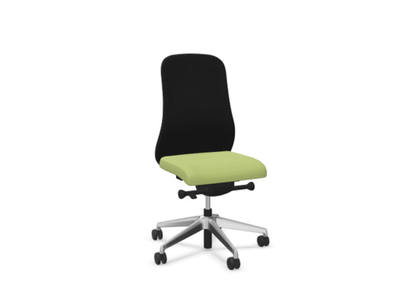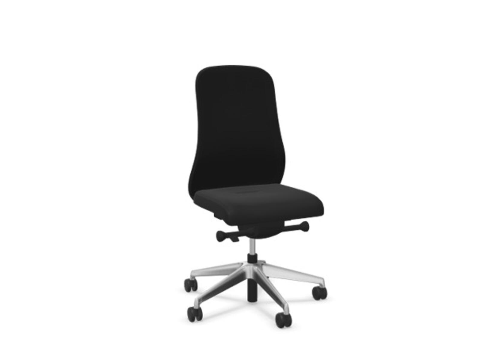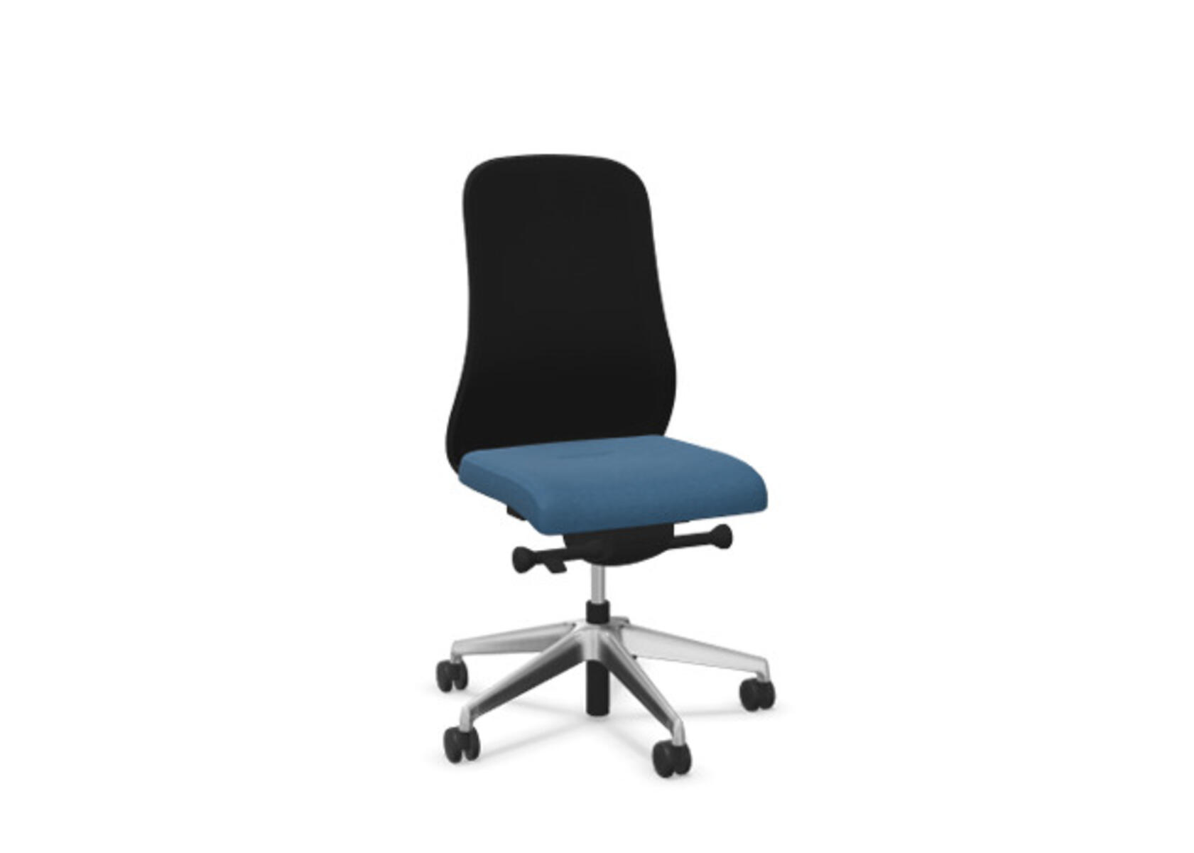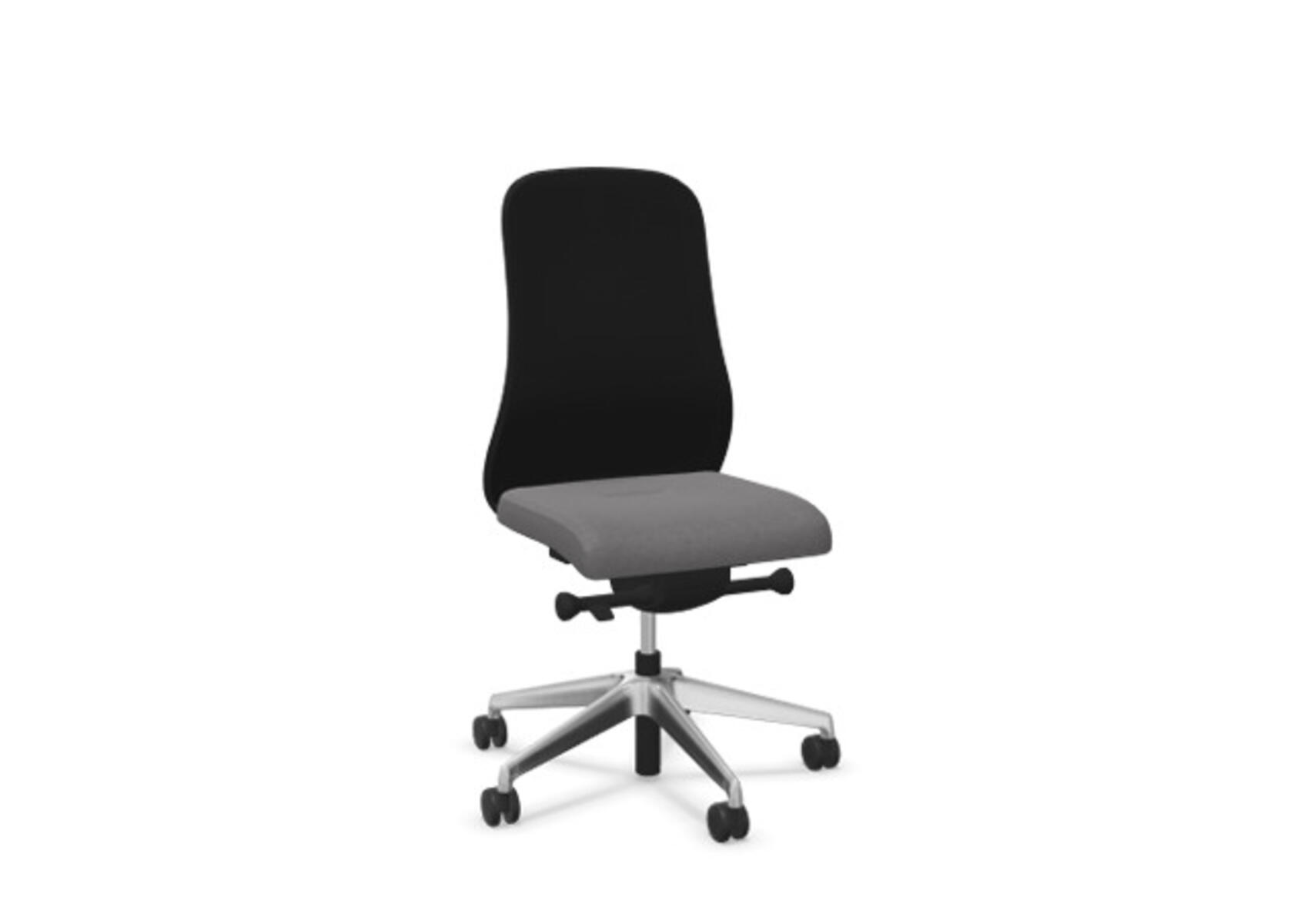 Moderne og ergonomisk kontorstol med delvis polstret rygg og synkronmekanisme samt justering av sittedybde, utformet for å gi støtte ved aktiv sitting gjennom hele arbeidsdagen. Trukket i polyesterstoff. Den synkroniserte bevegelsen mellom rygg og sete gir en aktiv og komfortabel sittestilling. Ryggens vippevinkel er 21° synkronisert med setets vippevinkel på 7°. Ryggstøtten kan låses i 4 ulike posisjoner og har en funksjon som automatisk justerer motstanden ihht brukerens vekt og gir mulighet til for ytterligere justering i 3 posisjoner. Ryggstøtten er ikke høydejusterbar. Sittedybden kan justeres innenfor et område på 60 mm, med 7 låsbare posisjoner. Stolen har også Anti-Shock-funksjon som hindrer at ryggstøtten slår tilbake når låsen frigjøres. Velg mellom kryss i lysgrå polyamid eller polert aluminium samt selvbremsende hjul for myke eller harde gulv. Som tilvalg finnes også korsryggstøtte, manuelt høydejusterbar (55 mm). Armlener i 2D, 3D eller 4D selges separat.