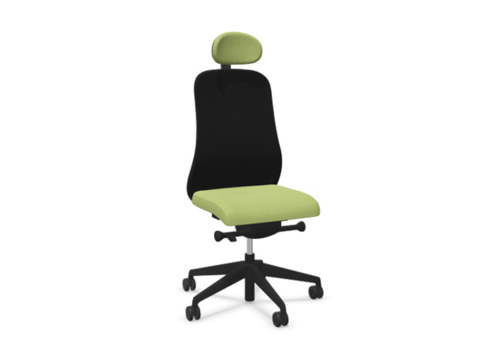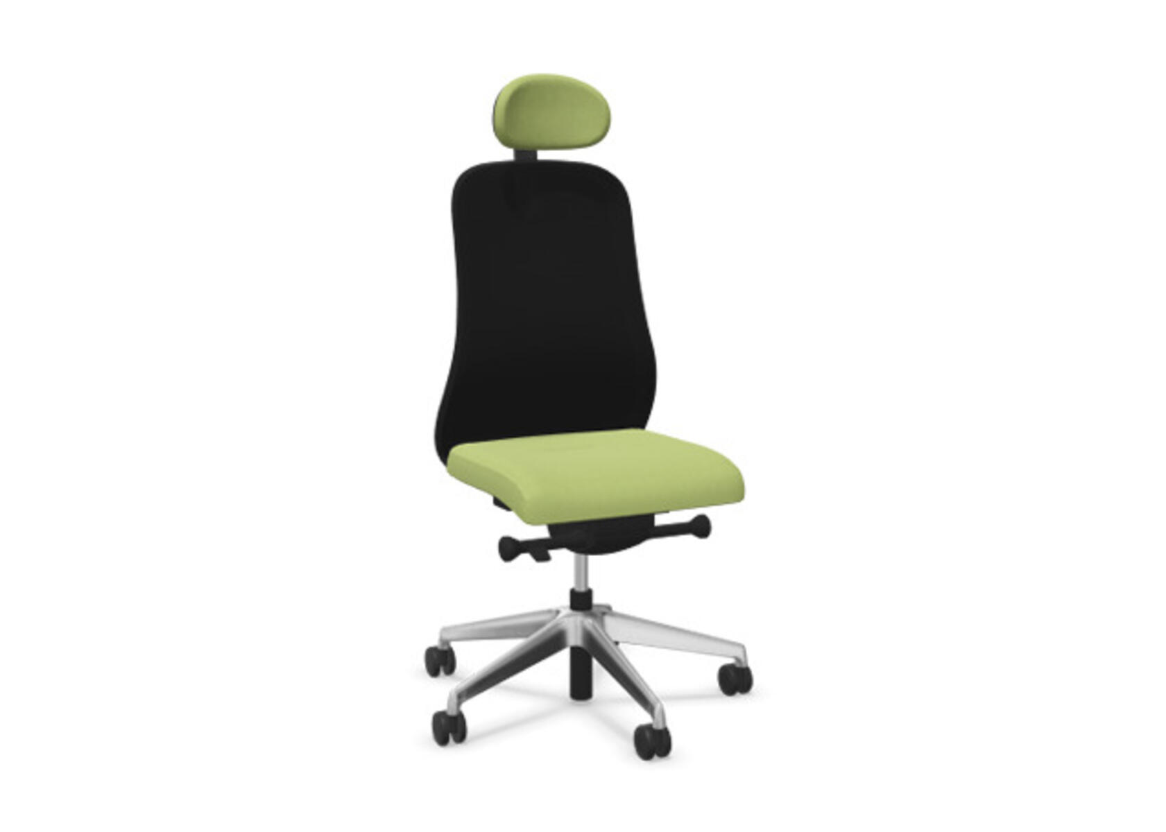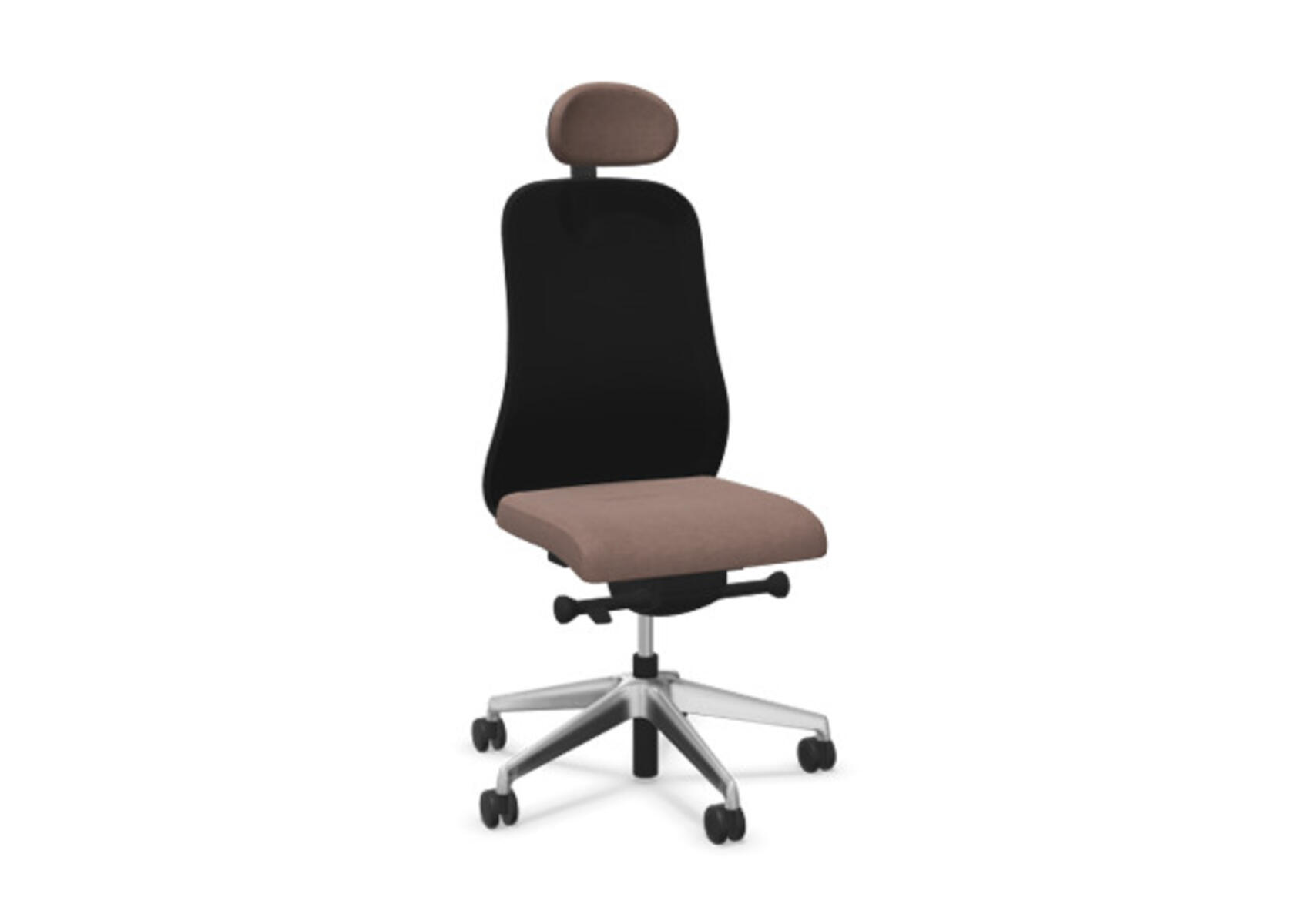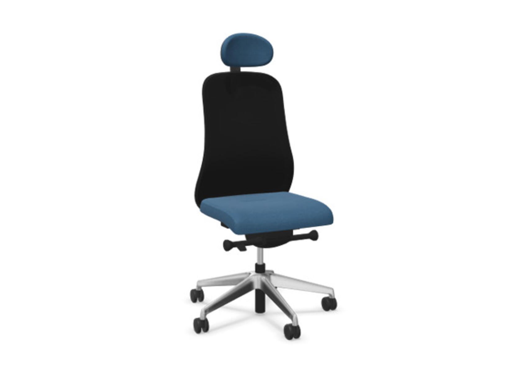 Moderne og ergonomisk kontorstol med delvis polstret rygg og avansert synkronmekanisme samt justering av sittedybde, utformet for å gi støtte ved aktiv sitting gjennom hele arbeidsdagen. Trukket i polyesterstoff. Den synkroniserte bevegelsen mellom rygg og sete gir en aktiv og komfortabel sittestilling. Ryggens vippevinkel er 23° synkronisert med setets vippevinkel på 10°. Ryggstøtten kan låses i 5 ulike posisjoner for individuell tilpasning, og motstanden i ryggstøtten justeres enkelt med et dreiehjul, 7 nivåer. Ryggstøtten er ikke høydejusterbar. Sittedybden kan justeres innenfor et område på 60 mm, med 7 låsbare posisjoner. Stolen har også Anti-Shock-funksjon som hindrer at ryggstøtten slår tilbake når låsen frigjøres. Polstret nakkestøtte, justerbar innenfor intervaller: dybde 20 mm, vinkel 70° og høyde 100 mm. Velg mellom kryss i lysgrå polyamid eller polert aluminium samt selvbremsende hjul for myke eller harde gulv. Som tilvalg finnes også korsryggstøtte, manuelt høydejusterbar (55 mm). Armlener i 2D, 3D eller 4D selges separat.
