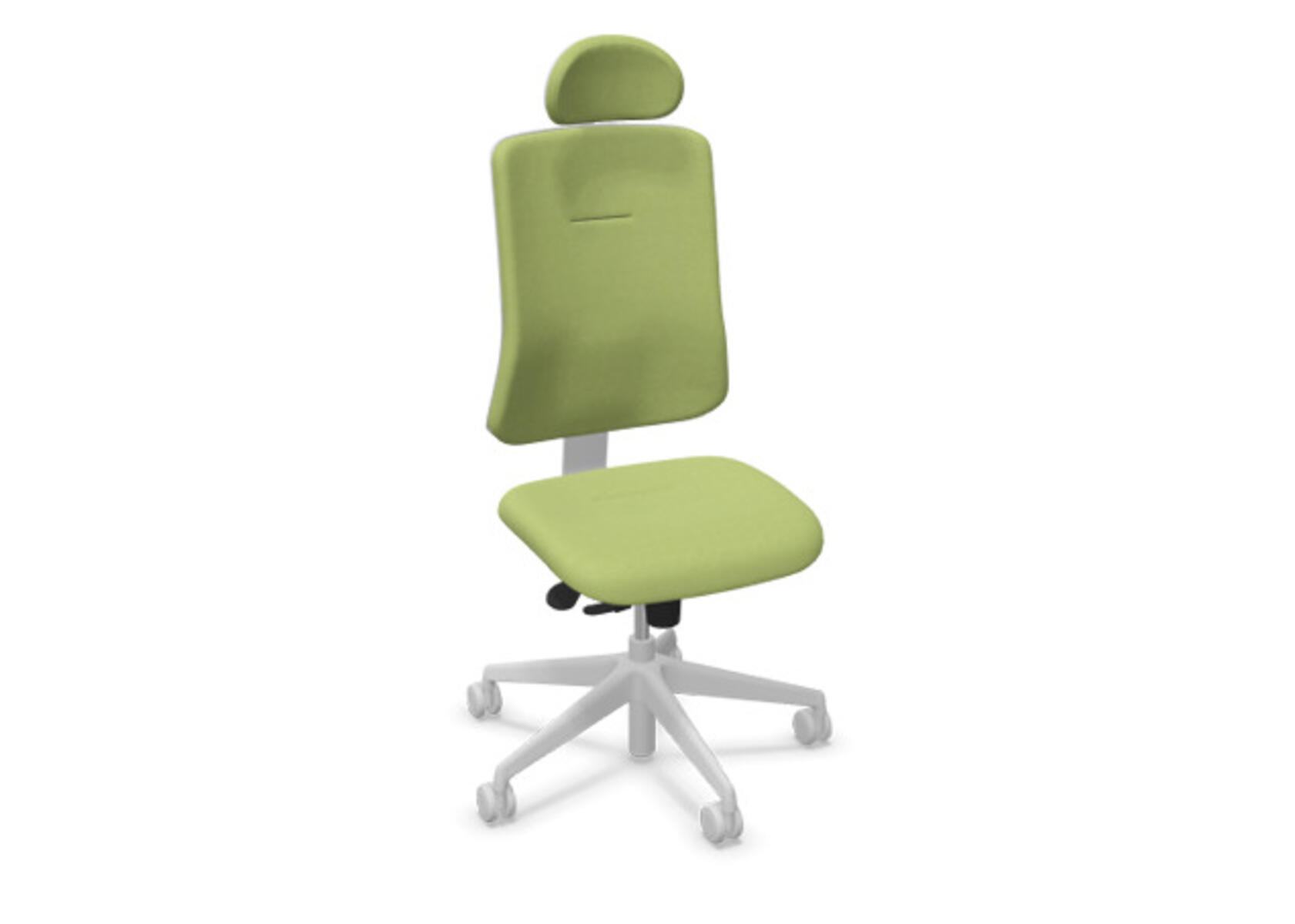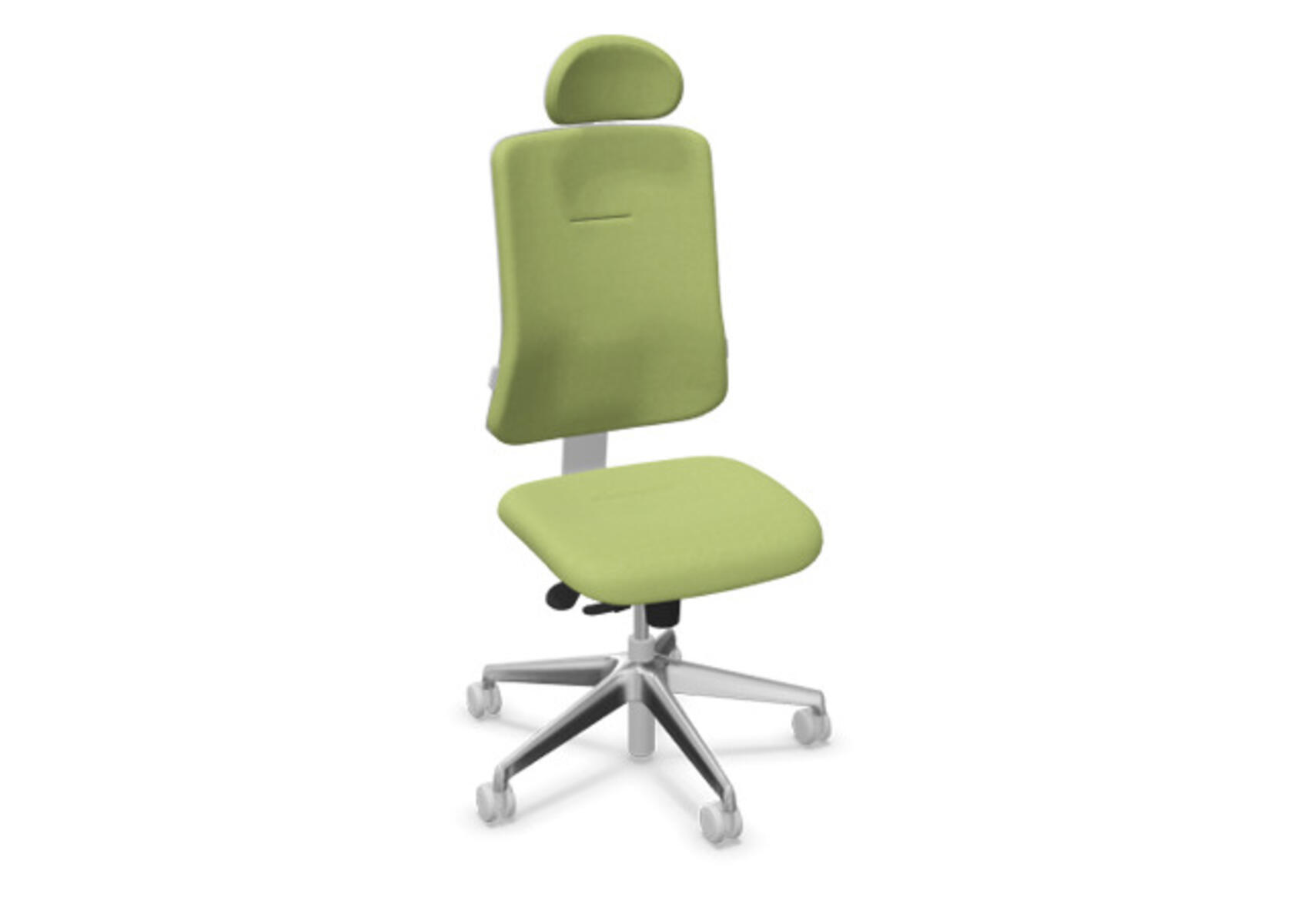 Ergonomisk kontorstol med delvis polstret rygg og synkronmekanisme, utformet for å gi støtte ved aktiv sitting gjennom hele arbeidsdagen. Polyesterstoff. Den synkroniserte bevegelsen mellom ryggstøtte og sete gir en aktiv og komfortabel sittestilling. Ryggstøttens vippevinkel er 20° synkronisert med setets vippevinkel på 11°. Ryggstøtten kan låses i 5 ulike posisjoner for individuell tilpasning, og motstanden i ryggstøtten justeres enkelt med et dreiehjul. Polstret nakkestøtte, justerbar innenfor intervallene: dybde 20 mm, vinkel 70° og høyde 100 mm. Stolen har også Anti-Shock-funksjon som hindrer ryggstøtten i å slå tilbake når vippen låses opp. Velg mellom kryss i lysgrå polyamid eller polert aluminium samt selvbremsende hjul for myke eller harde gulv. Som tilvalg finnes også regulerbart korsryggstøtte, manuelt justerbart i dybde (15 mm) og høyde (20 mm). Armlener i 2D, 3D eller 4D selges separat.
