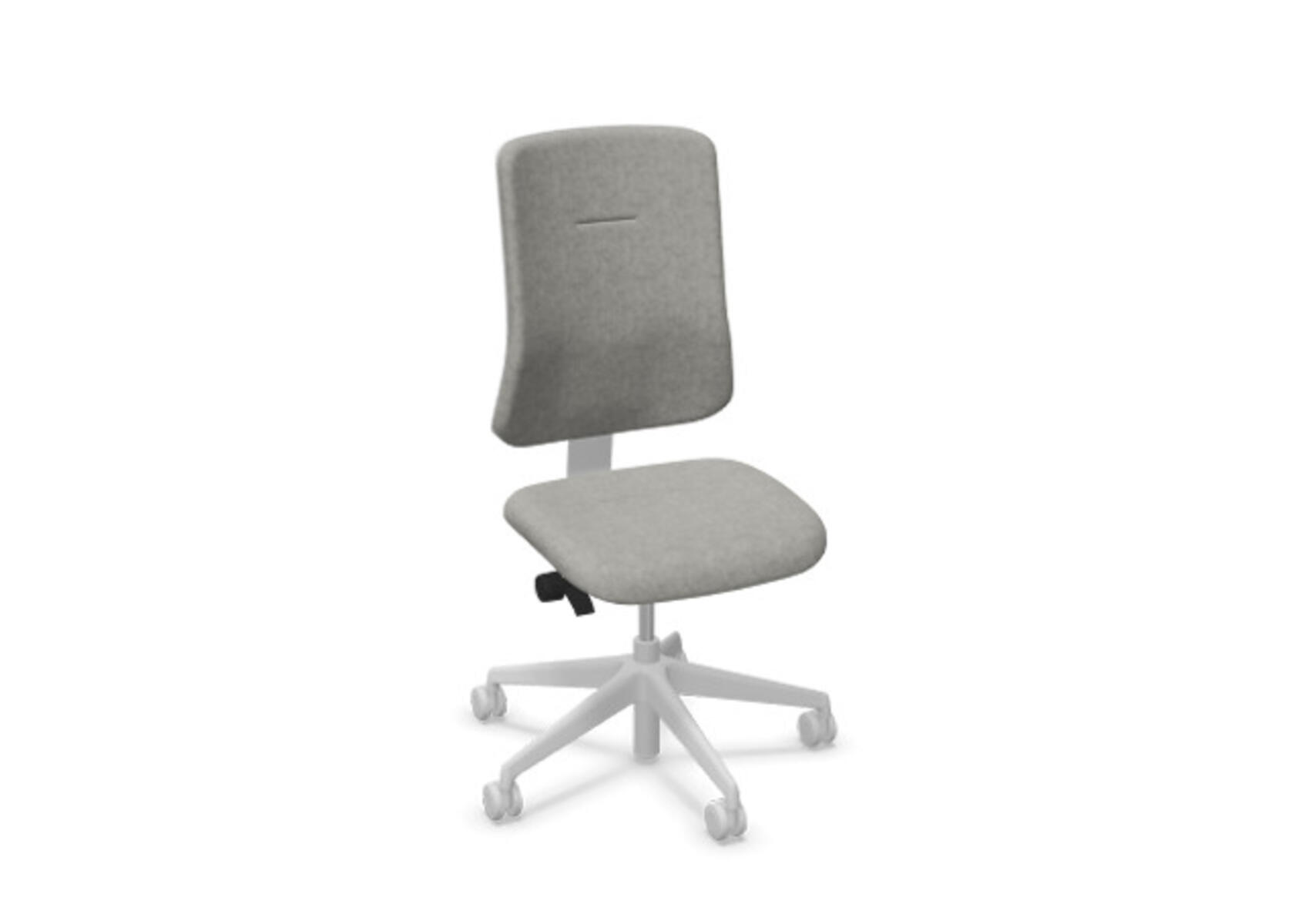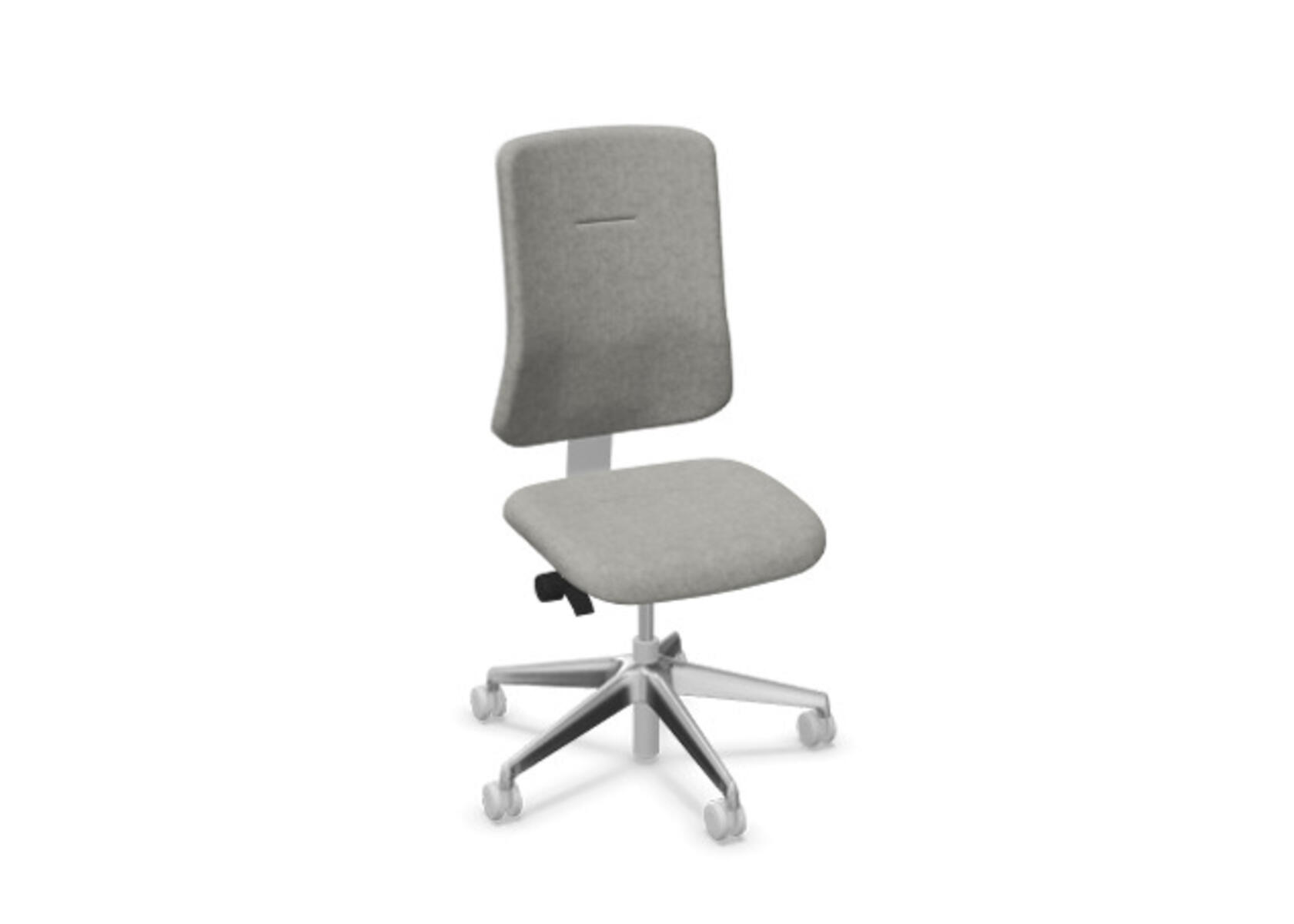 Ergonomisk kontorstol med delvis polstret rygg og synkronmekanisme, utformet for å gi støtte ved aktiv sitting gjennom hele arbeidsdagen. Polyesterstoff. Den synkroniserte bevegelsen mellom ryggstøtte og sete gir en aktiv og komfortabel sittestilling. Ryggstøttens vippevinkel er 20° synkronisert med setets vippevinkel på 11°. Ryggstøtten kan låses i 5 ulike posisjoner for individuell tilpasning, og motstanden i ryggstøtten justeres enkelt med et dreiehjul. Stolen har også Anti-Shock-funksjon som hindrer ryggstøtten i å slå tilbake når vippen låses opp. Velg mellom kryss i lysgrå polyamid eller polert aluminium samt selvbremsende hjul for myke eller harde gulv. Som tilvalg finnes også regulerbart korsryggstøtte, manuelt justerbart i dybde (15 mm) og høyde (20 mm). Armlener i 2D, 3D eller 4D selges separat.