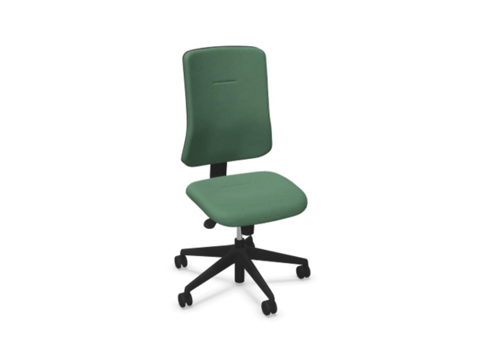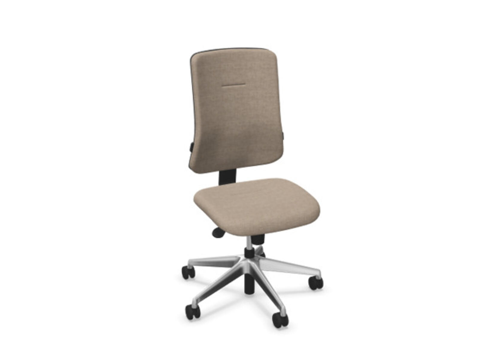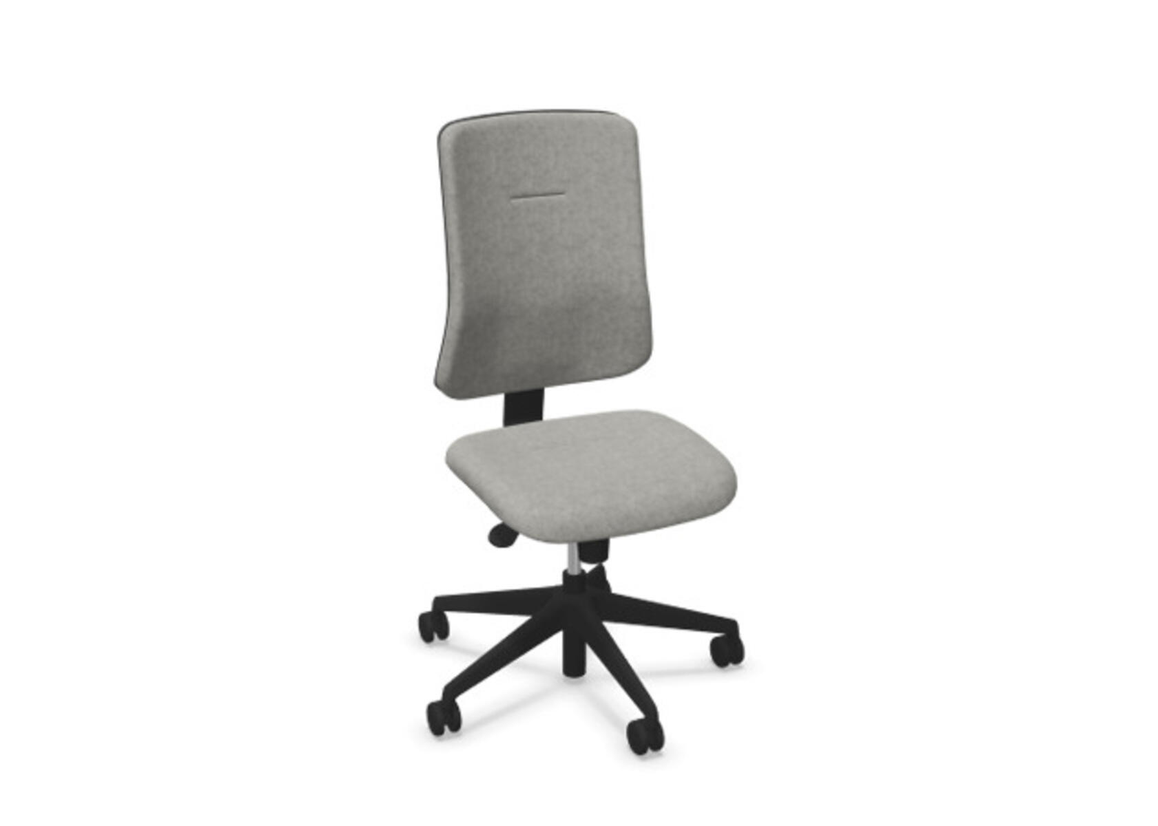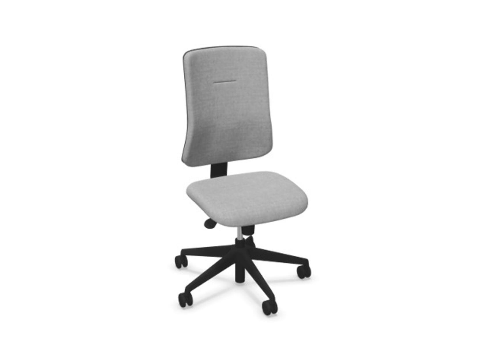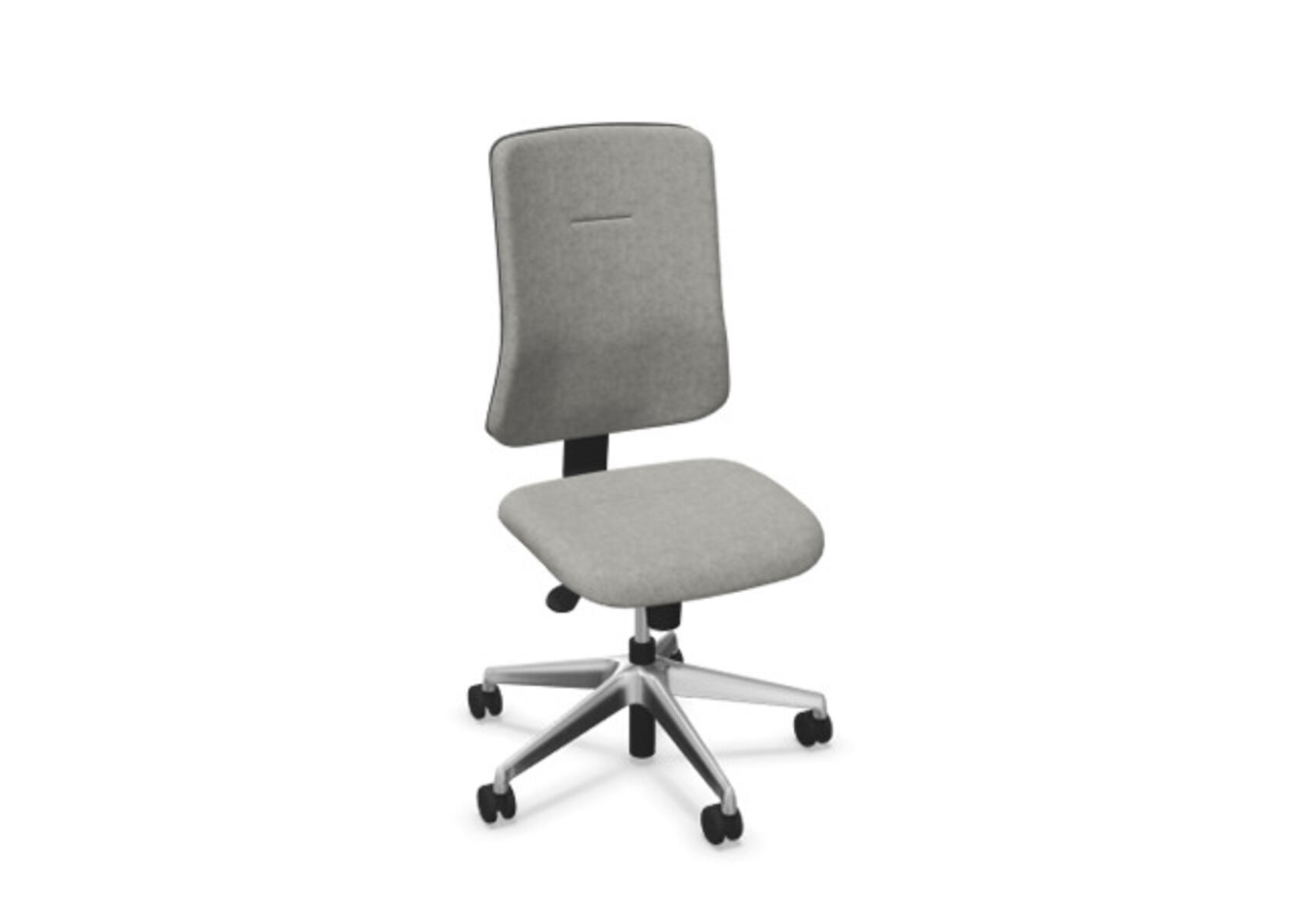 Ergonomisk kontorstol med delvis polstret rygg og synkronmekanisme, utformet for å gi støtte ved aktiv sitting gjennom hele arbeidsdagen. Polyesterstoff. Den synkroniserte bevegelsen mellom ryggstøtte og sete gir en aktiv og komfortabel sittestilling. Ryggstøttens vippevinkel er 20° synkronisert med setets vippevinkel på 11°. Ryggstøtten kan låses i 5 ulike posisjoner for individuell tilpasning, og motstanden i ryggstøtten justeres enkelt med et dreiehjul. Stolen har også Anti-Shock-funksjon som hindrer ryggstøtten i å slå tilbake når vippen låses opp. Velg mellom kryss i lysgrå polyamid eller polert aluminium samt selvbremsende hjul for myke eller harde gulv. Som tilvalg finnes også regulerbart korsryggstøtte, manuelt justerbart i dybde (15 mm) og høyde (20 mm). Armlener i 2D, 3D eller 4D selges separat.