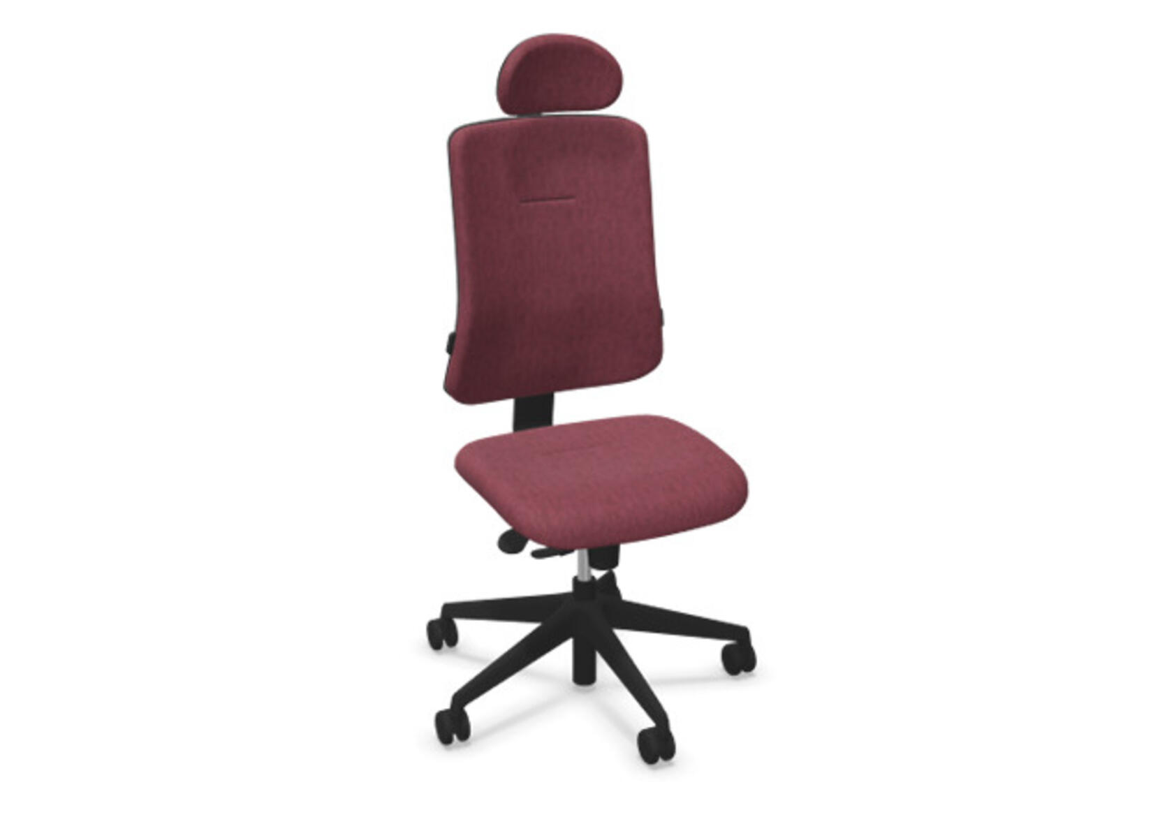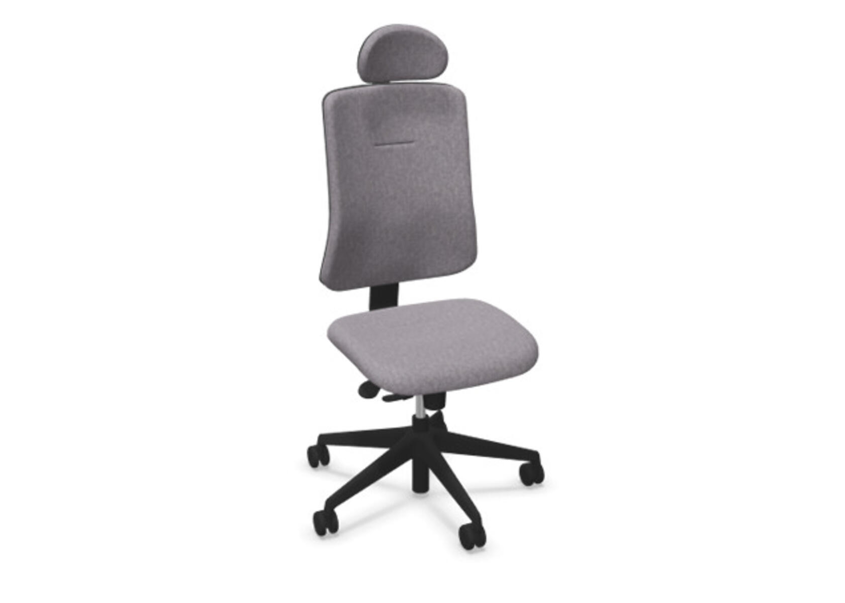 Ergonomisk kontorstol med delvis polstret rygg og synkronmekanisme, utformet for å gi støtte ved aktiv sitting gjennom hele arbeidsdagen. Polyesterstoff. Den synkroniserte bevegelsen mellom ryggstøtte og sete gir en aktiv og komfortabel sittestilling. Ryggstøttens vippevinkel er 20° synkronisert med setets vippevinkel på 11°. Ryggstøtten kan låses i 5 ulike posisjoner for individuell tilpasning, og motstanden i ryggstøtten justeres enkelt med et dreiehjul. Stolen har også Anti-Shock-funksjon som hindrer ryggstøtten i å slå tilbake når vippen låses opp. Velg mellom kryss i lysgrå polyamid eller polert aluminium samt selvbremsende hjul for myke eller harde gulv. Som tilvalg finnes også regulerbart korsryggstøtte, manuelt justerbart i dybde (15 mm) og høyde (20 mm). Armlener i 2D, 3D eller 4D selges separat.