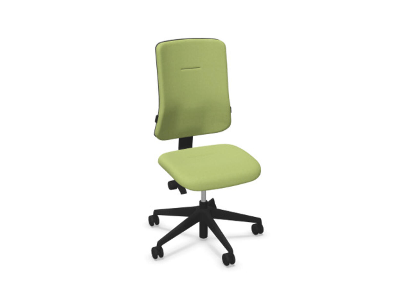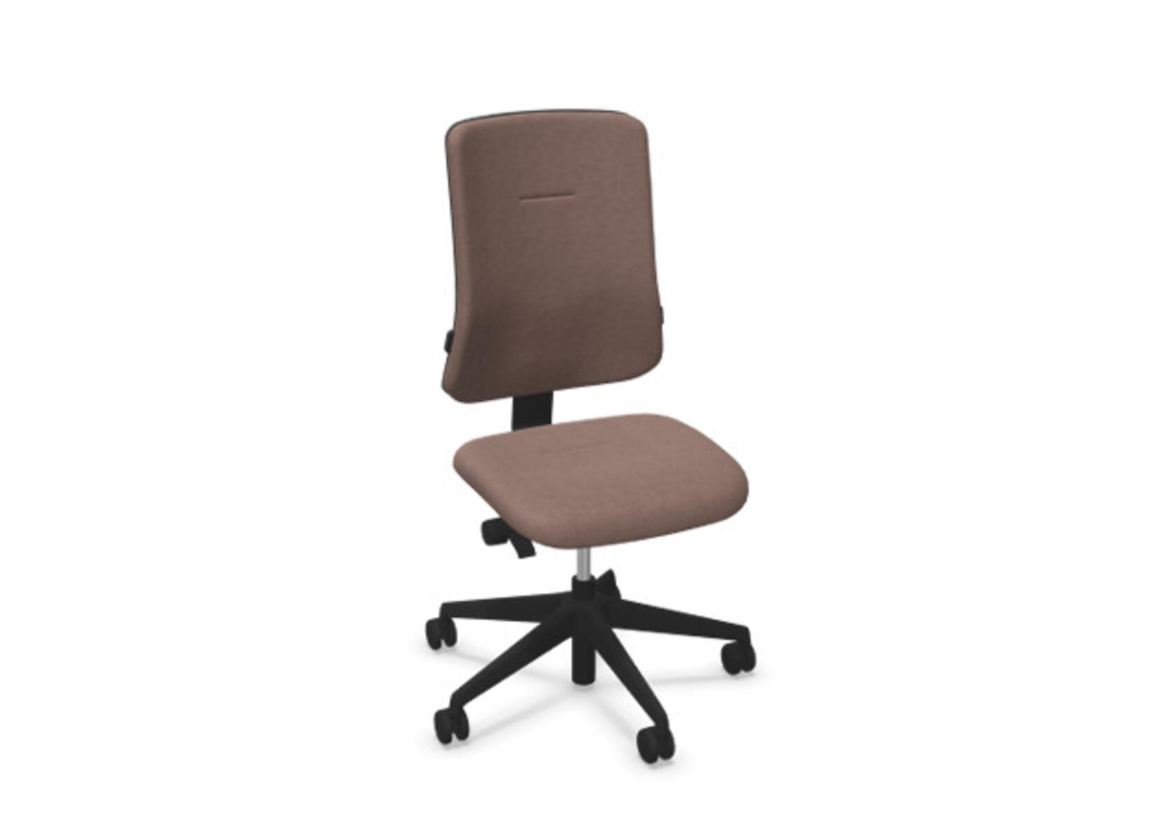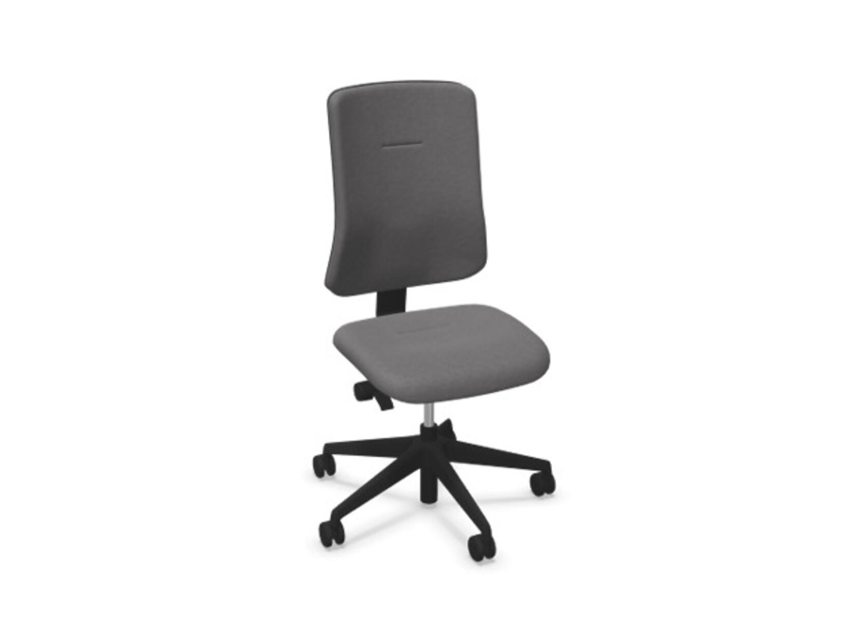 Ergonomisk kontorstol med delvis polstret rygg og synkronmekanisme, utformet for å gi støtte ved aktiv sitting gjennom hele arbeidsdagen. Polyesterstoff. Den synkroniserte bevegelsen mellom ryggstøtte og sete gir en aktiv og komfortabel sittestilling. Ryggstøttens vippevinkel er 20° synkronisert med setets vippevinkel på 11°. Ryggstøtten kan låses i 5 ulike posisjoner for individuell tilpasning, og motstanden i ryggstøtten justeres enkelt med et dreiehjul. Stolen har også Anti-Shock-funksjon som hindrer ryggstøtten i å slå tilbake når vippen låses opp. Velg mellom kryss i lysgrå polyamid eller polert aluminium samt selvbremsende hjul for myke eller harde gulv. Som tilvalg finnes også regulerbart korsryggstøtte, manuelt justerbart i dybde (15 mm) og høyde (20 mm). Armlener i 2D, 3D eller 4D selges separat.