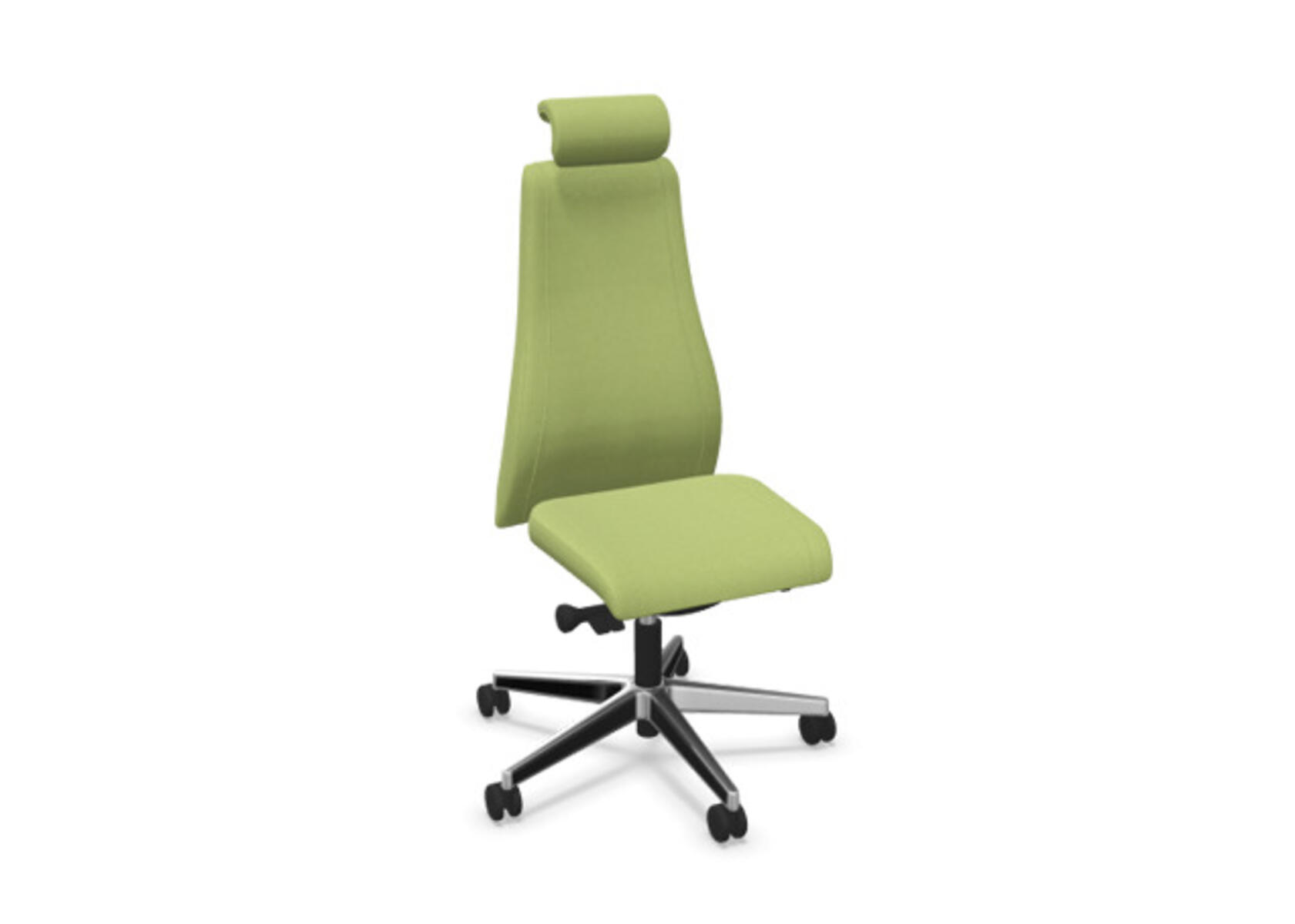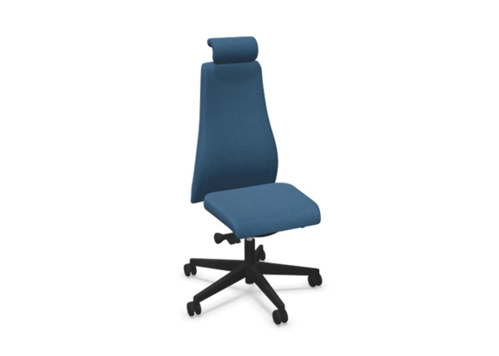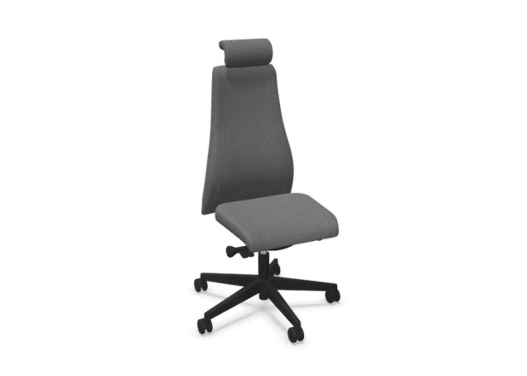 En stilren og ergonomisk kontorstol med heltrukket høy rygg og synkronmekanisme samt justering av sittedybde, utformet for å gi støtte ved aktiv sitting gjennom hele arbeidsdagen. Trukket i polyesterstoff. Den synkroniserte vippen mellom ryggstøtte og sete gir en aktiv og komfortabel sittestilling. Ryggstøttens vippevinkel er 23° synkronisert med setets vippevinkel på 10°. Ryggstøtten kan låses i 5 ulike posisjoner for individuell tilpasning, og motstanden i ryggstøtten justeres enkelt med et dreiehjul i 7 trinn. Ryggstøtten er høydejusterbar innenfor et område på 70 mm med 13 låseposisjoner. Sittedybden kan justeres innenfor et område på 60 mm. Negativ setevinkel på –2° synkronisert med ryggstøtte ved 5°, noe som sikrer optimalt ryggstøtte i alle vippeposisjoner. Justerbart, polstret nakkestøtte med vinkel- og høydejustering innenfor et område på 75 mm. Stolen har også Anti-Shock-funksjon som hindrer ryggstøtten i å slå tilbake når vippen låses opp. Velg mellom kryss i svart polyamid eller polert aluminium samt selvbremsende hjul for myke eller harde gulv. Som tilvalg finnes også korsryggstøtte, manuelt justerbar i dybden (20 mm) med et dreiehjul. Armlener i 2D, 3D eller 4D selges separat.