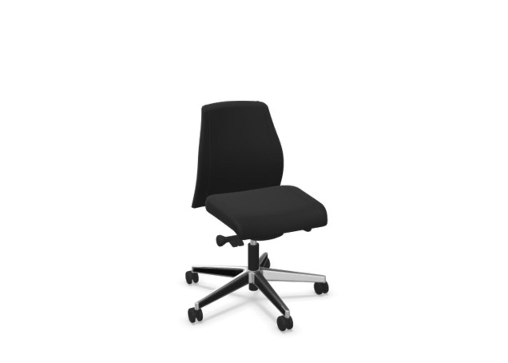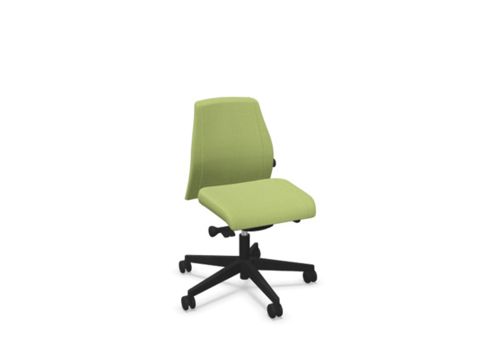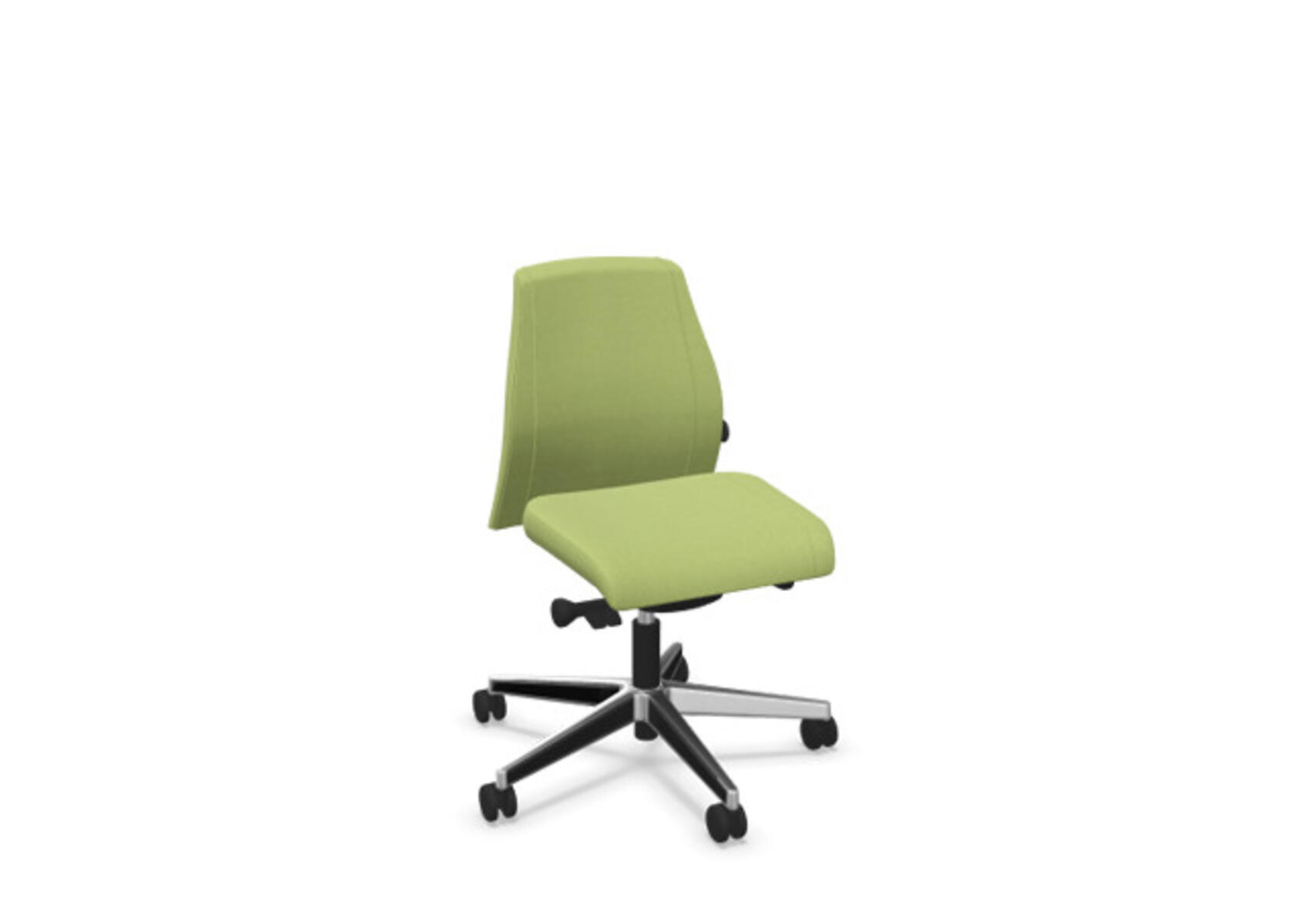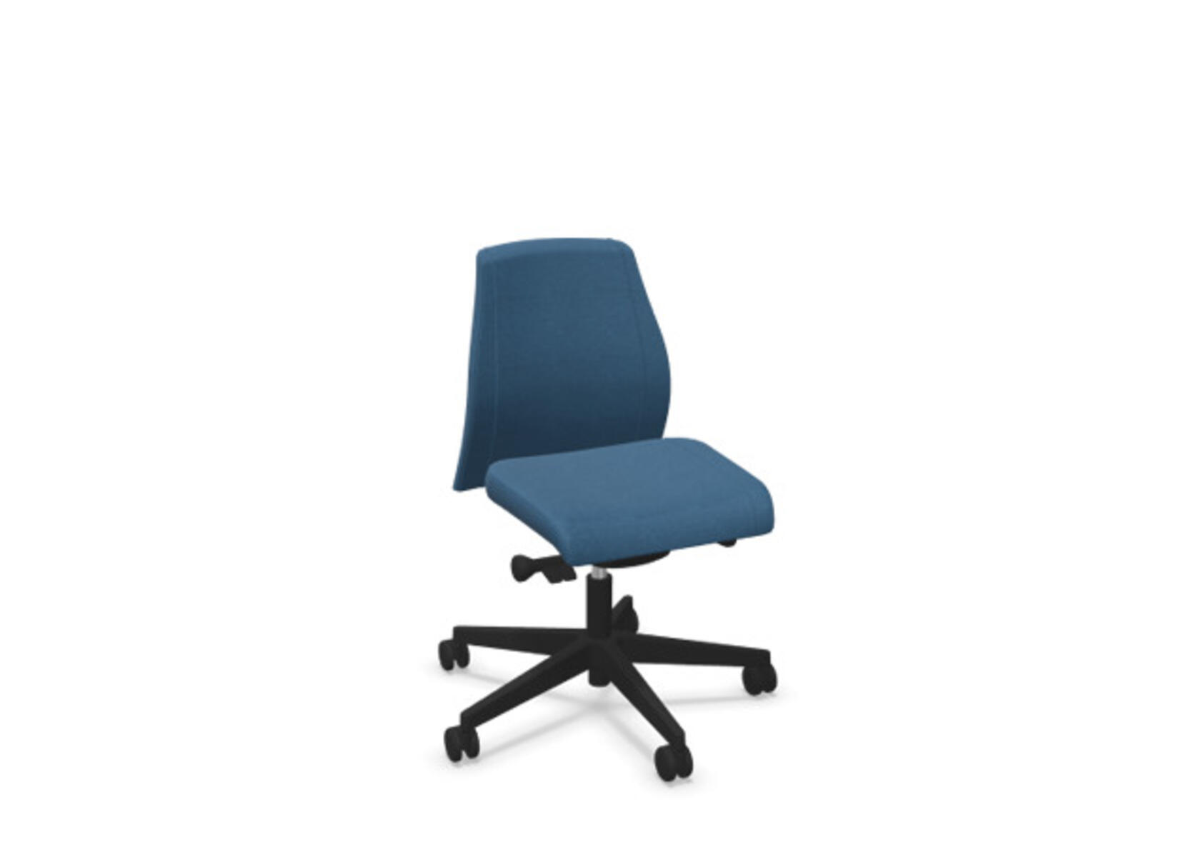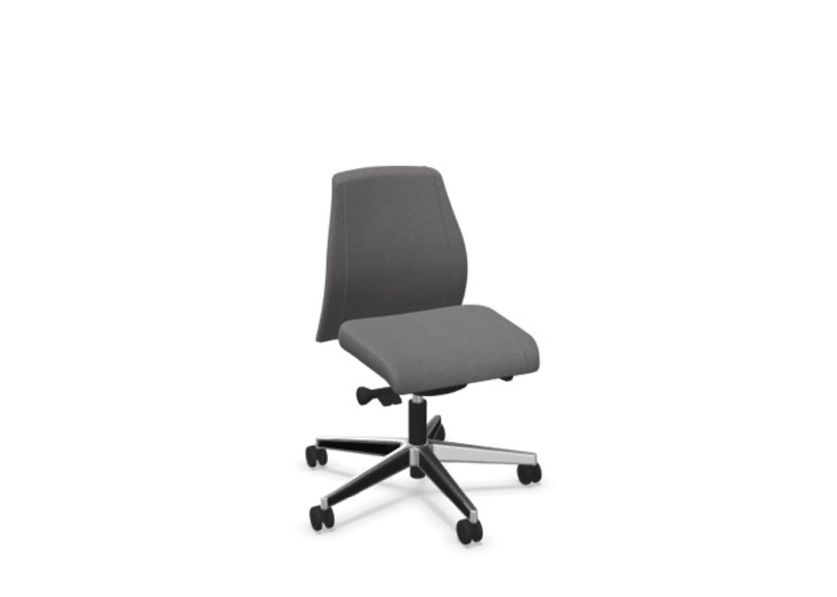 En stilren og ergonomisk kontorstol med heltrukket lav rygg og synkronmekanisme samt justering av sittedybde, utformet for å gi støtte ved aktiv sitting gjennom hele arbeidsdagen. Trukket i polyesterstoff. Den synkroniserte vippen mellom ryggstøtte og sete gir en aktiv og komfortabel sittestilling. Ryggstøttens vippevinkel er 23° synkronisert med setets vippevinkel på 10°. Ryggstøtten kan låses i 5 ulike posisjoner for individuell tilpasning, og motstanden i ryggstøtten justeres enkelt med et dreiehjul i 7 trinn. Ryggstøtten er høydejusterbar innenfor et område på 70 mm med 13 låseposisjoner. Sittedybden kan justeres innenfor et område på 60 mm. Negativ setevinkel på –2° synkronisert med ryggstøtte ved 5°, noe som sikrer optimalt ryggstøtte i alle vippeposisjoner. Stolen har også Anti-Shock-funksjon som hindrer ryggstøtten i å slå tilbake når vippen låses opp. Velg mellom kryss i svart polyamid eller polert aluminium samt selvbremsende hjul for myke eller harde gulv. Som tilvalg finnes også korsryggstøtte, manuelt justerbar i dybden (20 mm) med et dreiehjul. Armlener i 2D, 3D eller 4D selges separat.