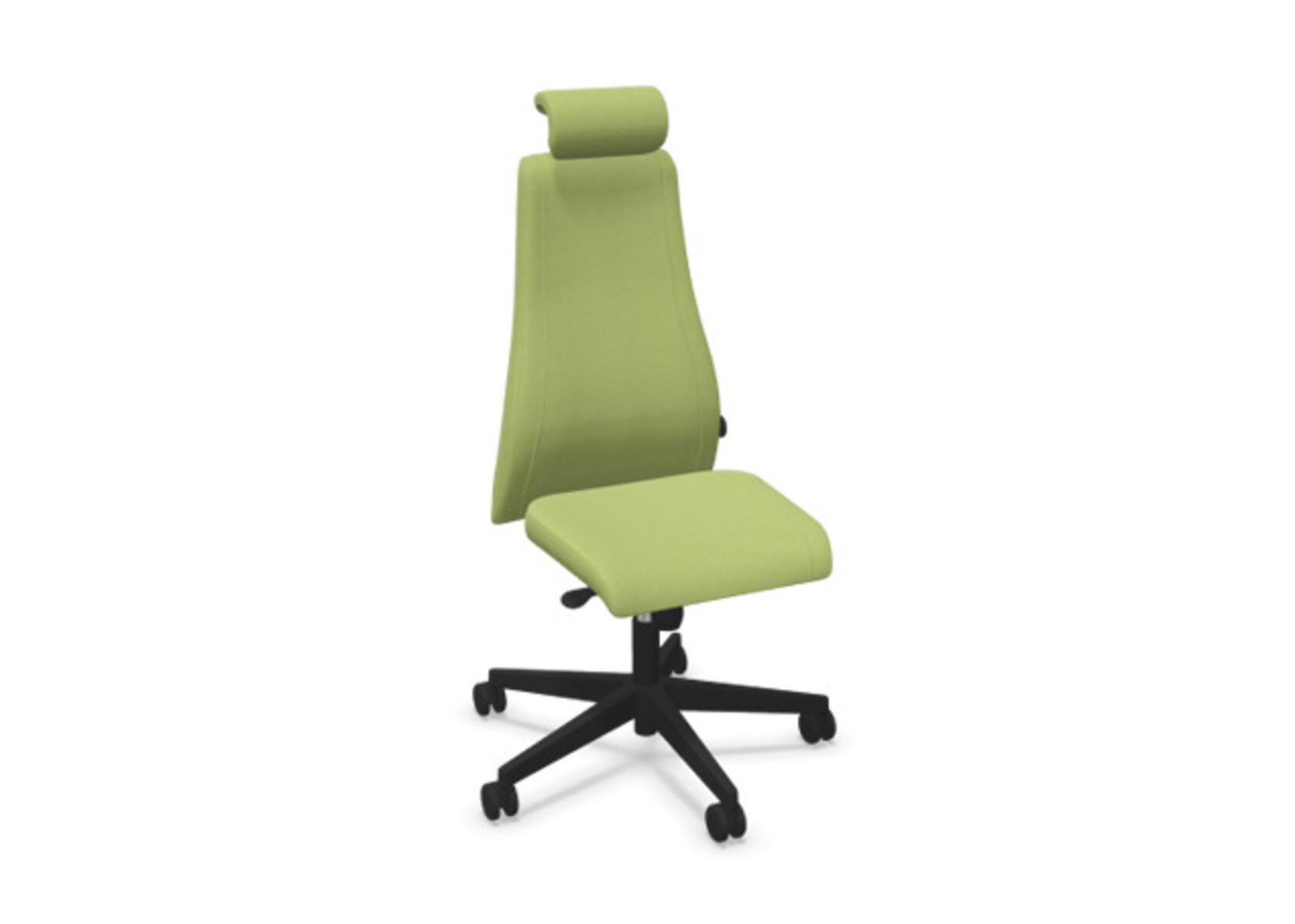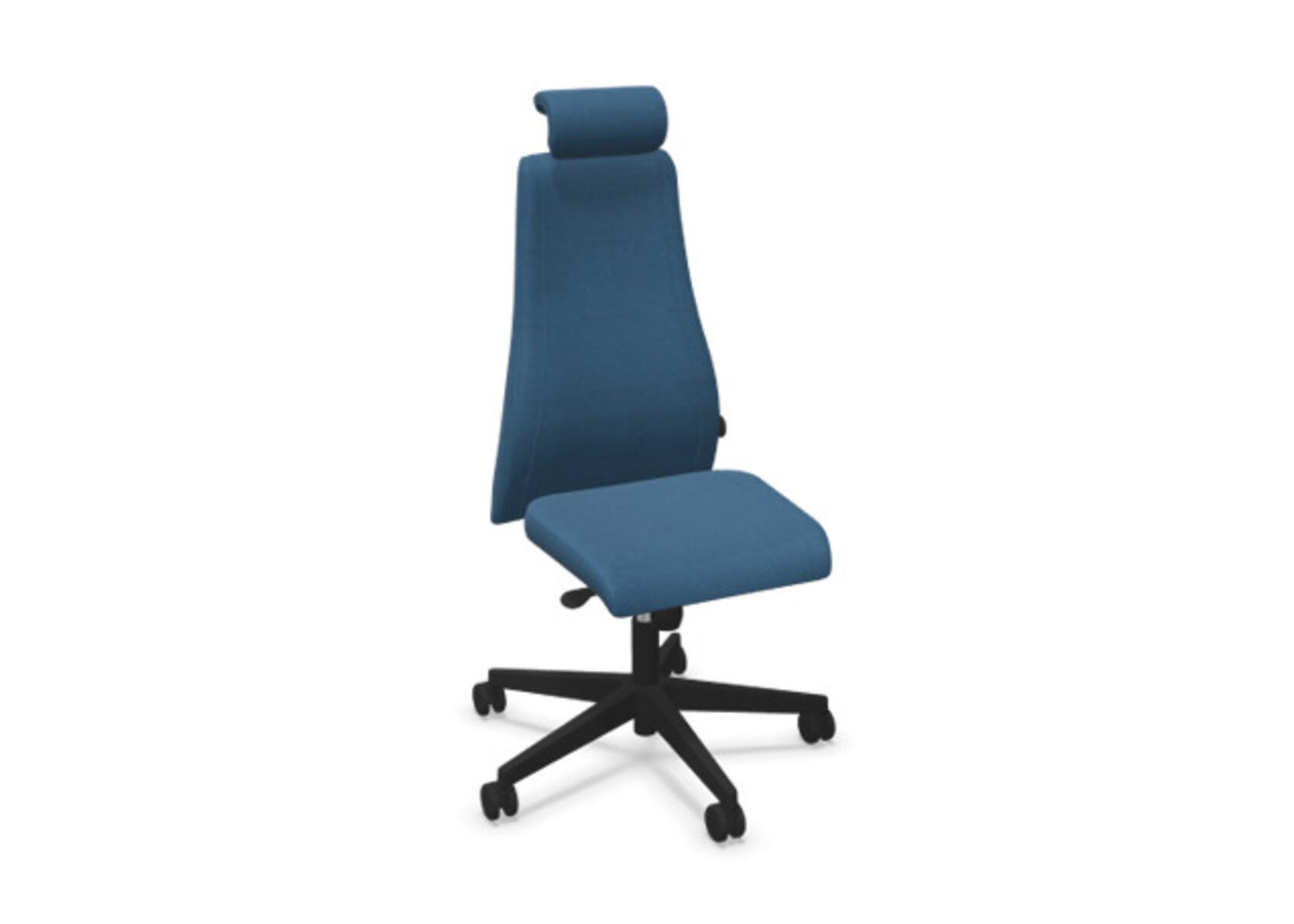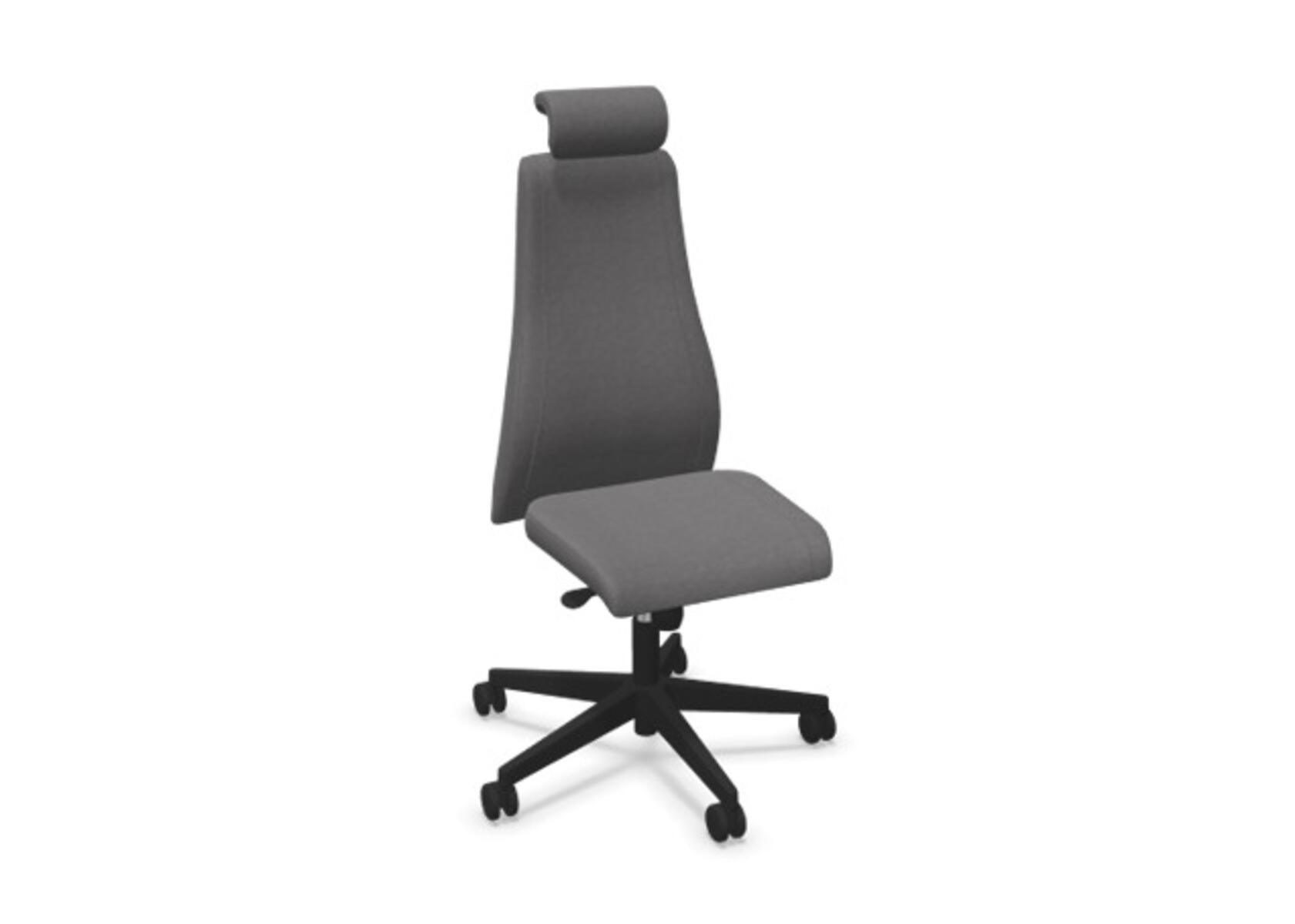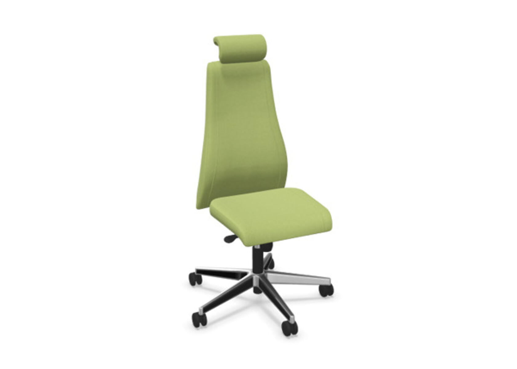 En stilren og ergonomisk kontorstol med heltrukket høy rygg og synkronmekanisme samt justering av sittedybde, utformet for å gi støtte ved aktiv sitting gjennom hele arbeidsdagen. Trukket i polyesterstoff. Den synkroniserte vippen mellom ryggstøtte og sete gir en aktiv og komfortabel sittestilling. Ryggstøttens vippevinkel er 23° synkronisert med setets vippevinkel på 10°. Ryggstøtten kan låses i 5 ulike posisjoner for individuell tilpasning, og motstanden i ryggstøtten justeres enkelt med et dreiehjul i 7 trinn. Ryggstøtten er høydejusterbar innenfor et område på 70 mm med 13 låseposisjoner. Sittedybden kan justeres innenfor et område på 60 mm. Negativ setevinkel på –2° synkronisert med ryggstøtte ved 5°, noe som sikrer optimalt ryggstøtte i alle vippeposisjoner. Stolen har også Anti-Shock-funksjon som hindrer ryggstøtten i å slå tilbake når vippen låses opp. Velg mellom kryss i svart polyamid eller polert aluminium samt selvbremsende hjul for myke eller harde gulv. Som tilvalg finnes også korsryggstøtte, manuelt justerbar i dybden (20 mm) med et dreiehjul. Armlener i 2D, 3D eller 4D selges separat.