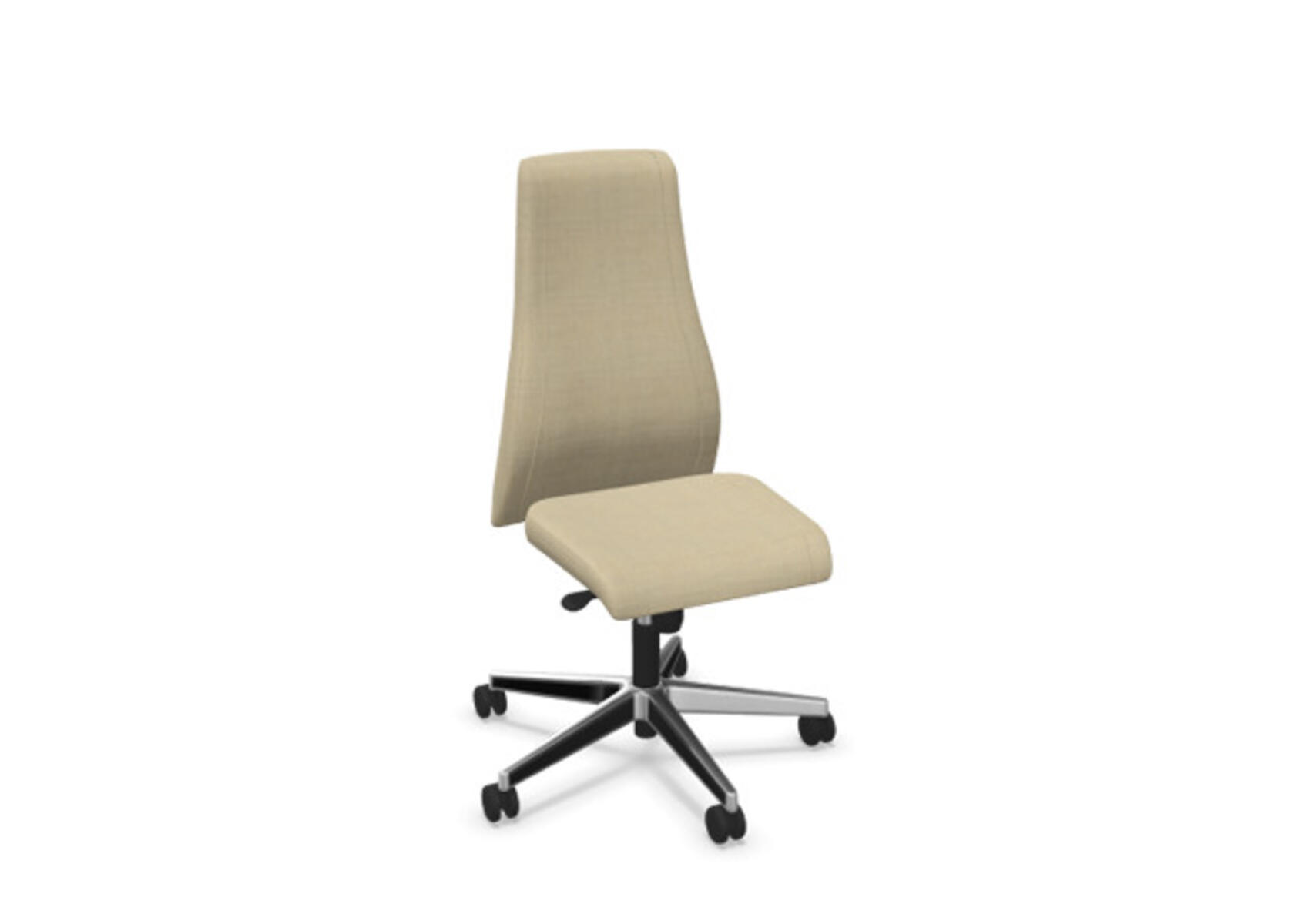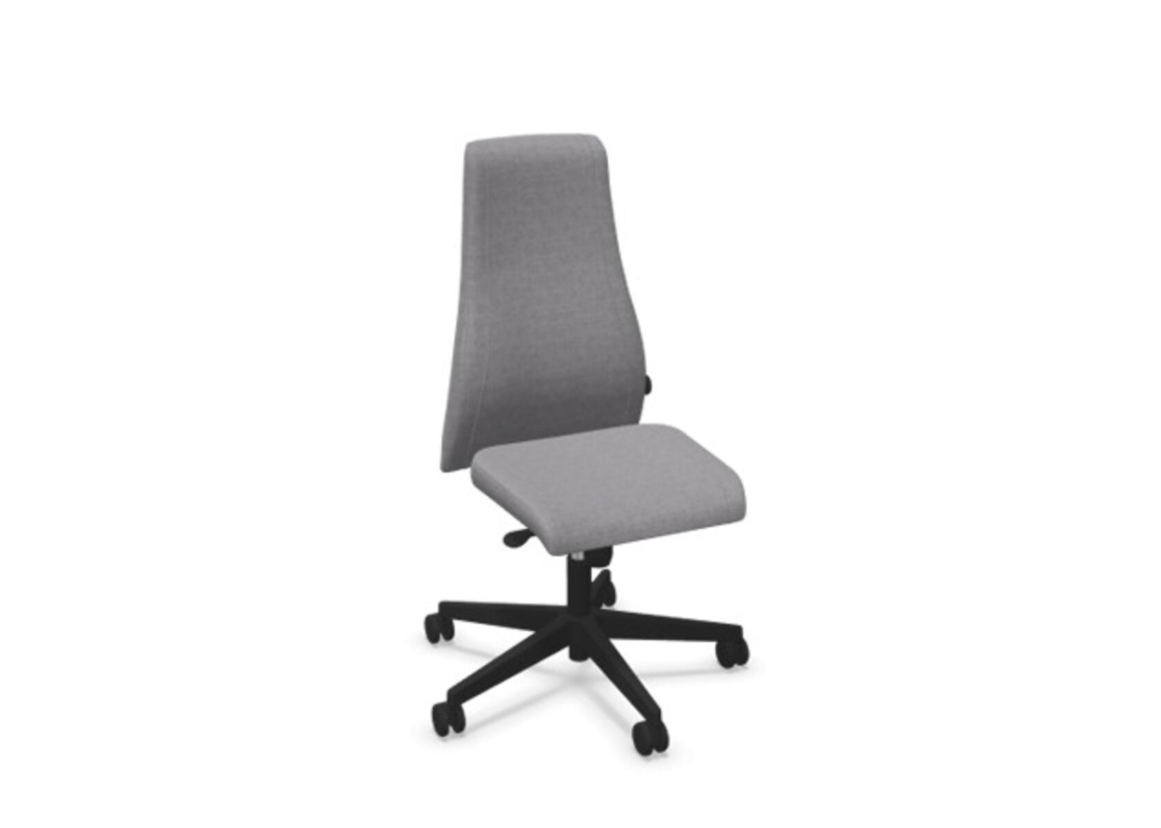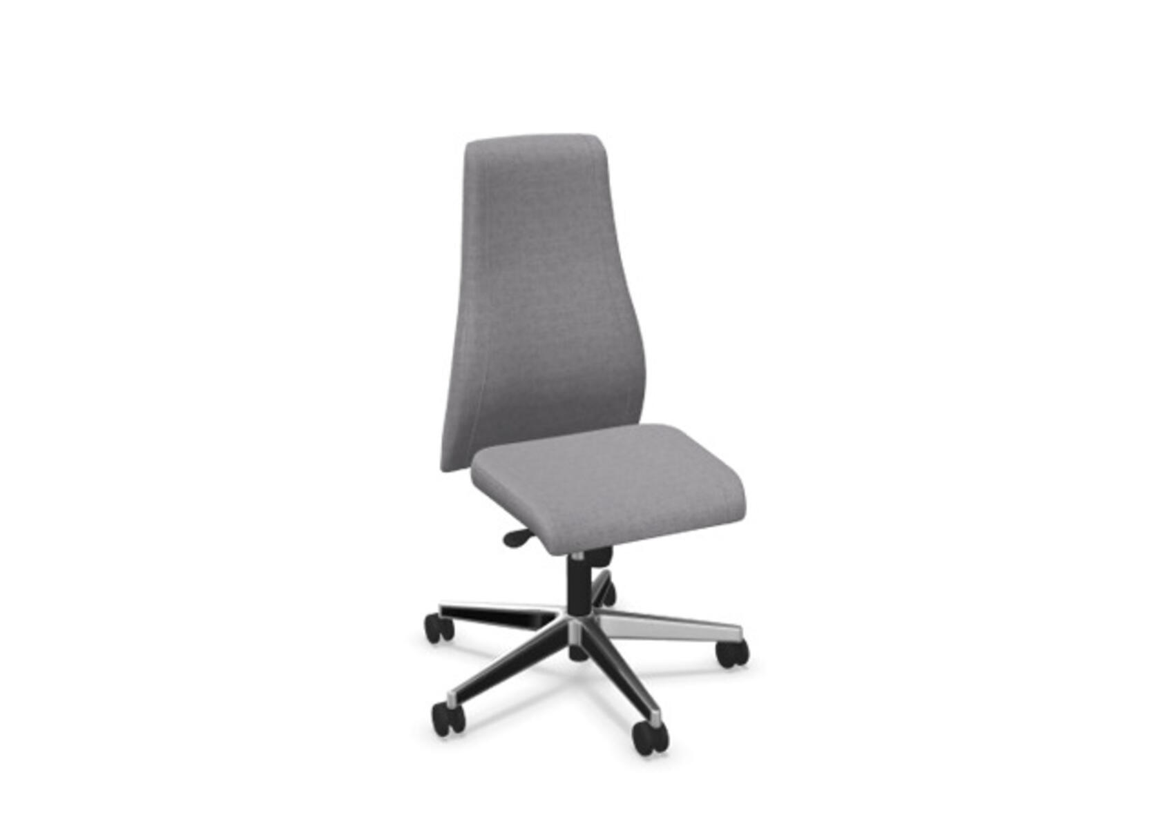 En stilren og ergonomisk kontorstol med heltrukket høy rygg og synkronmekanisme samt justering av sittedybde, utformet for å gi støtte ved aktiv sitting gjennom hele arbeidsdagen. Trukket i polyesterstoff. Den synkroniserte vippen mellom ryggstøtte og sete gir en aktiv og komfortabel sittestilling. Ryggstøttens vippevinkel er 23° synkronisert med setets vippevinkel på 10°. Ryggstøtten kan låses i 5 ulike posisjoner for individuell tilpasning, og motstanden i ryggstøtten justeres enkelt med et dreiehjul i 7 trinn. Ryggstøtten er høydejusterbar innenfor et område på 70 mm med 13 låseposisjoner. Sittedybden kan justeres innenfor et område på 60 mm. Negativ setevinkel på –2° synkronisert med ryggstøtte ved 5°, noe som sikrer optimalt ryggstøtte i alle vippeposisjoner. Stolen har også Anti-Shock-funksjon som hindrer ryggstøtten i å slå tilbake når vippen låses opp. Velg mellom kryss i svart polyamid eller polert aluminium samt selvbremsende hjul for myke eller harde gulv. Som tilvalg finnes også korsryggstøtte, manuelt justerbar i dybden (20 mm) med et dreiehjul. Armlener i 2D, 3D eller 4D selges separat.