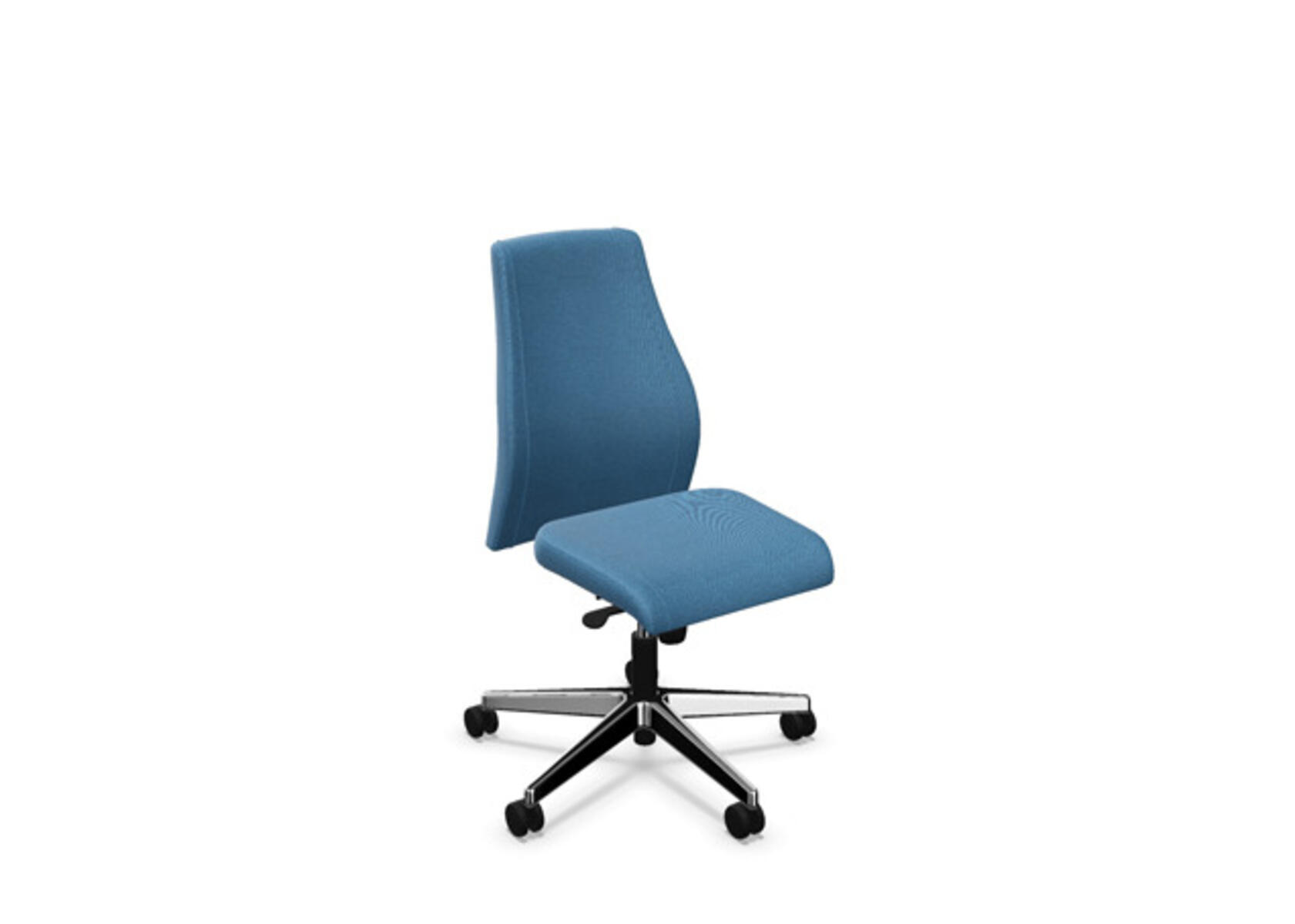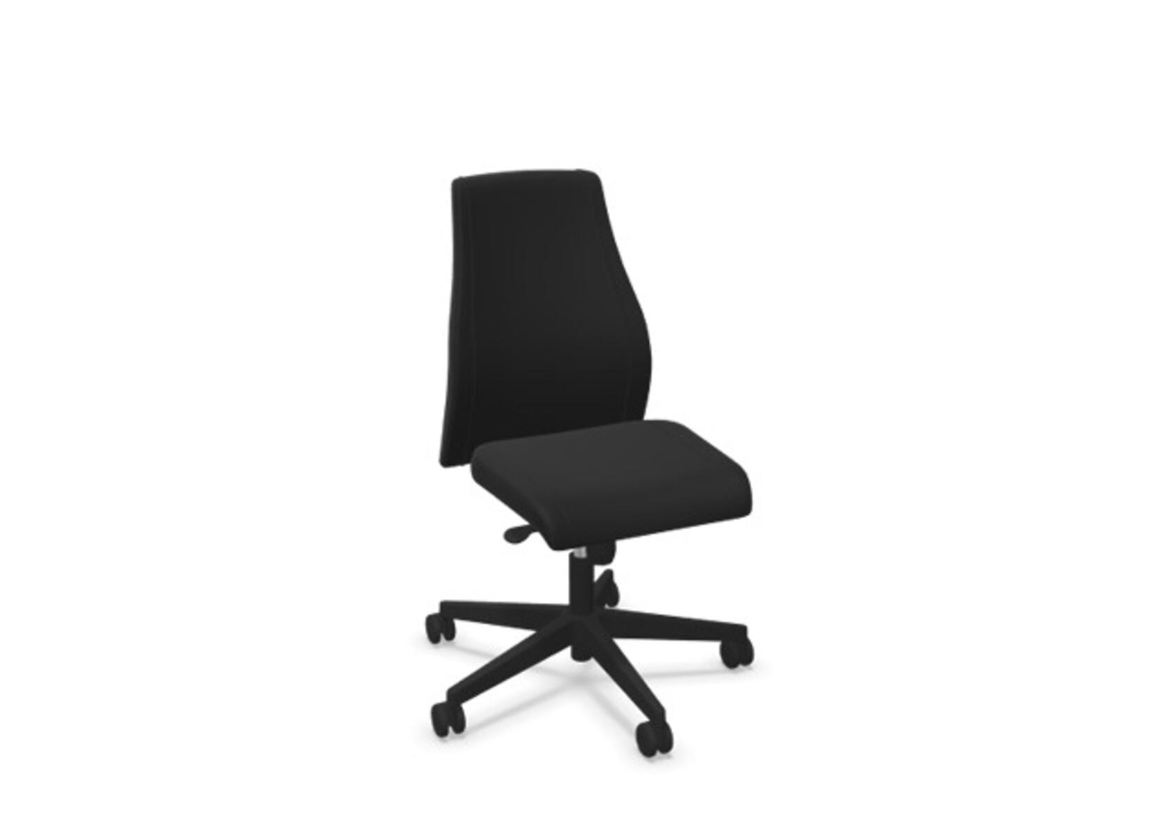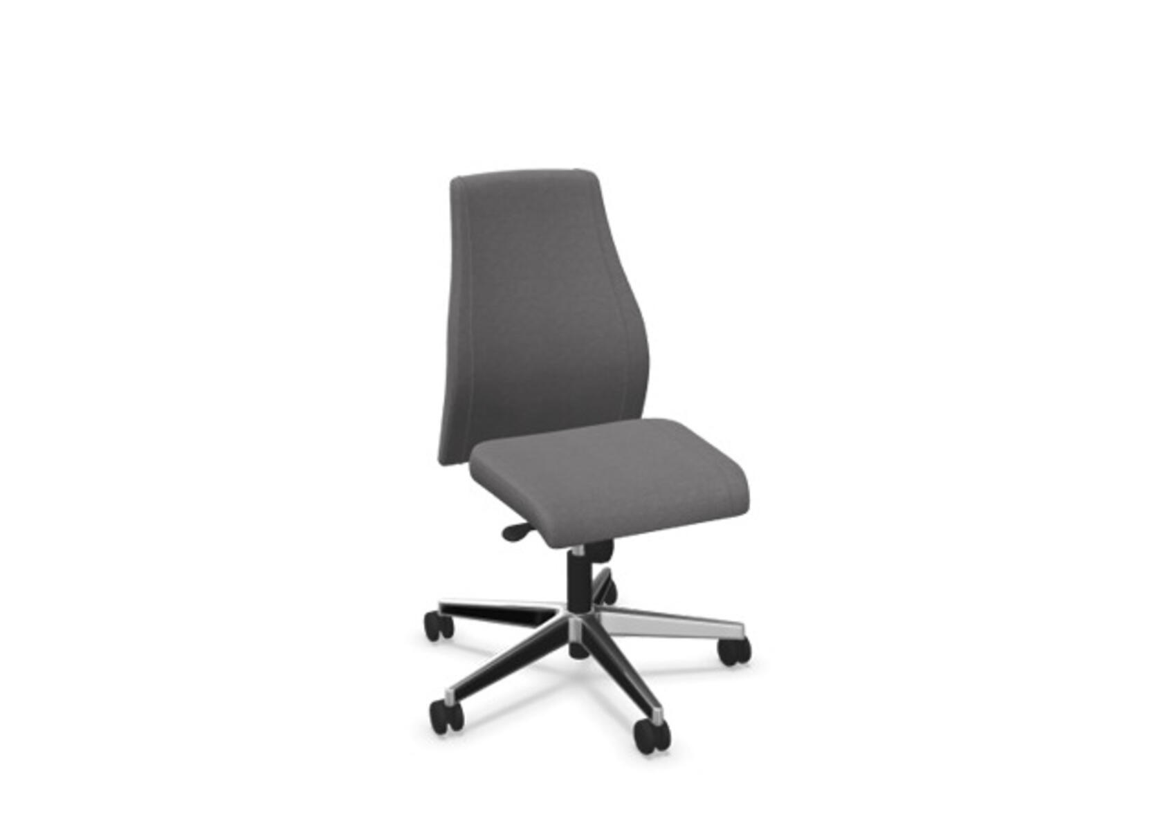 En stilren og ergonomisk kontorstol med heltrukket høy rygg og synkronmekanisme samt justering av sittedybde, utformet for å gi støtte ved aktiv sitting gjennom hele arbeidsdagen. Trukket i polyesterstoff. Den synkroniserte vippen mellom ryggstøtte og sete gir en aktiv og komfortabel sittestilling. Ryggstøttens vippevinkel er 23° synkronisert med setets vippevinkel på 10°. Ryggstøtten kan låses i 5 ulike posisjoner for individuell tilpasning, og motstanden i ryggstøtten justeres enkelt med et dreiehjul i 7 trinn. Ryggstøtten er høydejusterbar innenfor et område på 70 mm med 13 låseposisjoner. Sittedybden kan justeres innenfor et område på 60 mm. Negativ setevinkel på –2° synkronisert med ryggstøtte ved 5°, noe som sikrer optimalt ryggstøtte i alle vippeposisjoner. Stolen har også Anti-Shock-funksjon som hindrer ryggstøtten i å slå tilbake når vippen låses opp. Velg mellom kryss i svart polyamid eller polert aluminium samt selvbremsende hjul for myke eller harde gulv. Som tilvalg finnes også korsryggstøtte, manuelt justerbar i dybden (20 mm) med et dreiehjul. Armlener i 2D, 3D eller 4D selges separat.