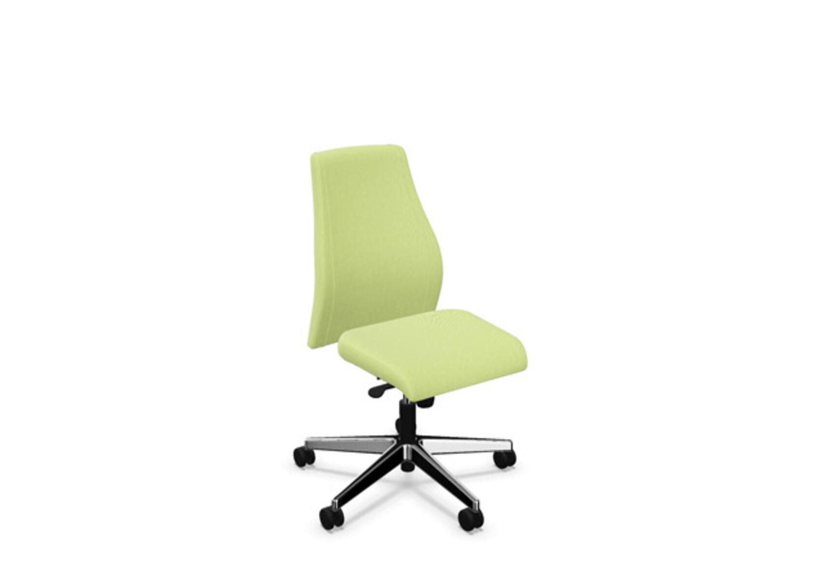 En stilren og ergonomisk kontorstol med heltrukket lav rygg og synkronmekanisme, utformet for å gi støtte ved aktiv sitting gjennom hele arbeidsdagen. Trukket i polyesterstoff. Den synkroniserte bevegelsen mellom ryggstøtte og sete gir en aktiv og komfortabel sittestilling. Ryggstøttets vippevinkel er 20° synkronisert med setets vippevinkel på 11°. Ryggstøtten kan låses i 5 ulike posisjoner for individuell tilpasning, og motstanden i ryggstøtten justeres enkelt med et dreiehjul. Ryggstøtten er høydejusterbar innenfor et område på 70 mm med 13 låseposisjoner. Stolen har også Anti-Shock-funksjon som hindrer ryggstøtten i å slå tilbake når vippen låses opp. Velg mellom kryss i svart polyamid eller polert aluminium samt selvbremsende hjul for myke eller harde gulv. Som tilvalg finnes også lumbalstøtte (Shukra-mekanisme), manuelt justerbar i dybden (20 mm) med et dreiehjul. Armlener i 1D, 2D, 3D eller 4D selges separat.