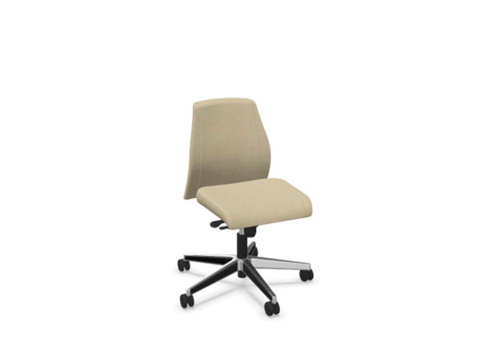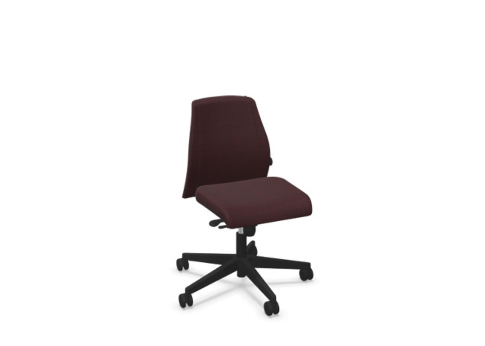 En stilren og ergonomisk kontorstol med heltrukket lav rygg og synkronmekanisme, utformet for å gi støtte ved aktiv sitting gjennom hele arbeidsdagen. Trukket i polyesterstoff. Den synkroniserte bevegelsen mellom ryggstøtte og sete gir en aktiv og komfortabel sittestilling. Ryggstøttets vippevinkel er 20° synkronisert med setets vippevinkel på 11°. Ryggstøtten kan låses i 5 ulike posisjoner for individuell tilpasning, og motstanden i ryggstøtten justeres enkelt med et dreiehjul. Ryggstøtten er høydejusterbar innenfor et område på 70 mm med 13 låseposisjoner. Stolen har også Anti-Shock-funksjon som hindrer ryggstøtten i å slå tilbake når vippen låses opp. Velg mellom kryss i svart polyamid eller polert aluminium samt selvbremsende hjul for myke eller harde gulv. Som tilvalg finnes også lumbalstøtte (Shukra-mekanisme), manuelt justerbar i dybden (20 mm) med et dreiehjul. Armlener i 1D, 2D, 3D eller 4D selges separat.