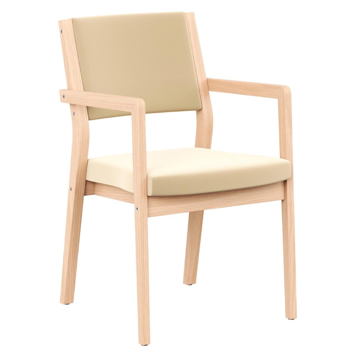 Med armlener. Fast, avtagbart setetrekk med inkontinensduk. Åpning mellom sete og rygg for enkelt renhold. Formstøpte puter med stålinnlegg og Nozag-fjærer. Trukket i stoff Kvadrat Guest