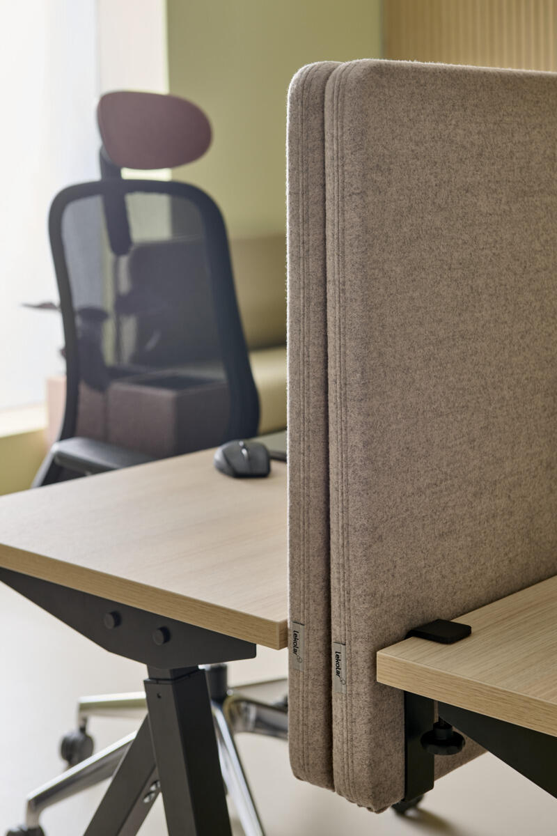Denne støydempende bordskjermen er utmerket når man trenger å være avskilt fra en større gruppe. Den er et flott hjelpemiddel for alle som trenger hjelp med å fokusere på sin egen oppgave, man skaper sitt eget stille rom i rommet. Skjermen består av tre deler som lett vinkles etter ønsket behov. Etter bruk henges skjermen på veggen og fungerer da som lydabsorbent i rommet. Borrelås holder skjermen sammenbrettet. Mål: 50x50x35 cm. Materiale: Syntetisk filt av minst 50 % resirkulert materiale. 100 % resirkulerbar.