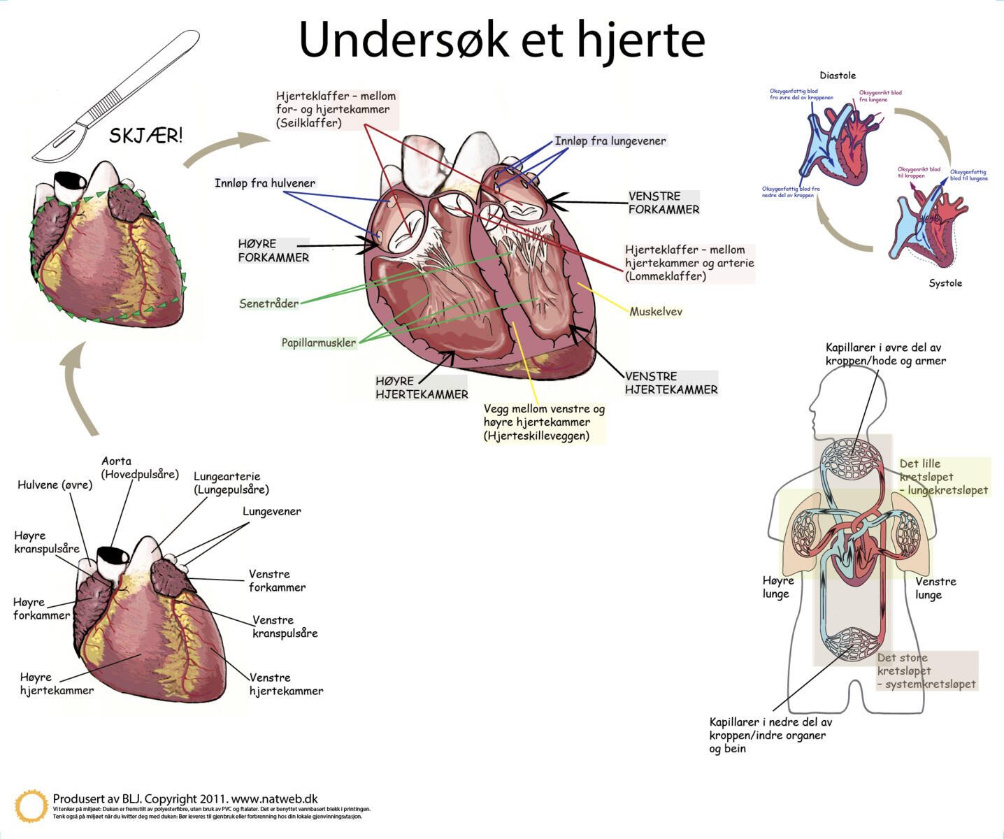 Duken viser hvordan elevene kan undersøke og dissekere et hjerte samtidig som de beskytter bordplaten. Hjertet (fra en gris, ku eller sau) plasseres midt på duken slik at instruksjonene kan følges under eksamen. Etter at eksamen er fullført, tørkes duken ren med en våt klut. Når duken er tørr, kan den legges bort og er klar til neste gang et hjerte må dissekeres. Ca 53x63 cm