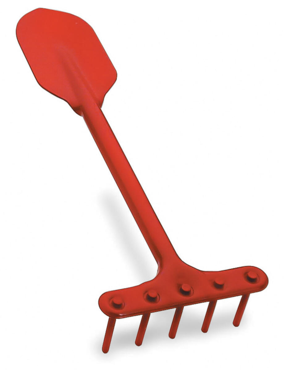 Av rødlakkert metall. Redskapen er ikke leketøy, men ordentlig hageredskap.