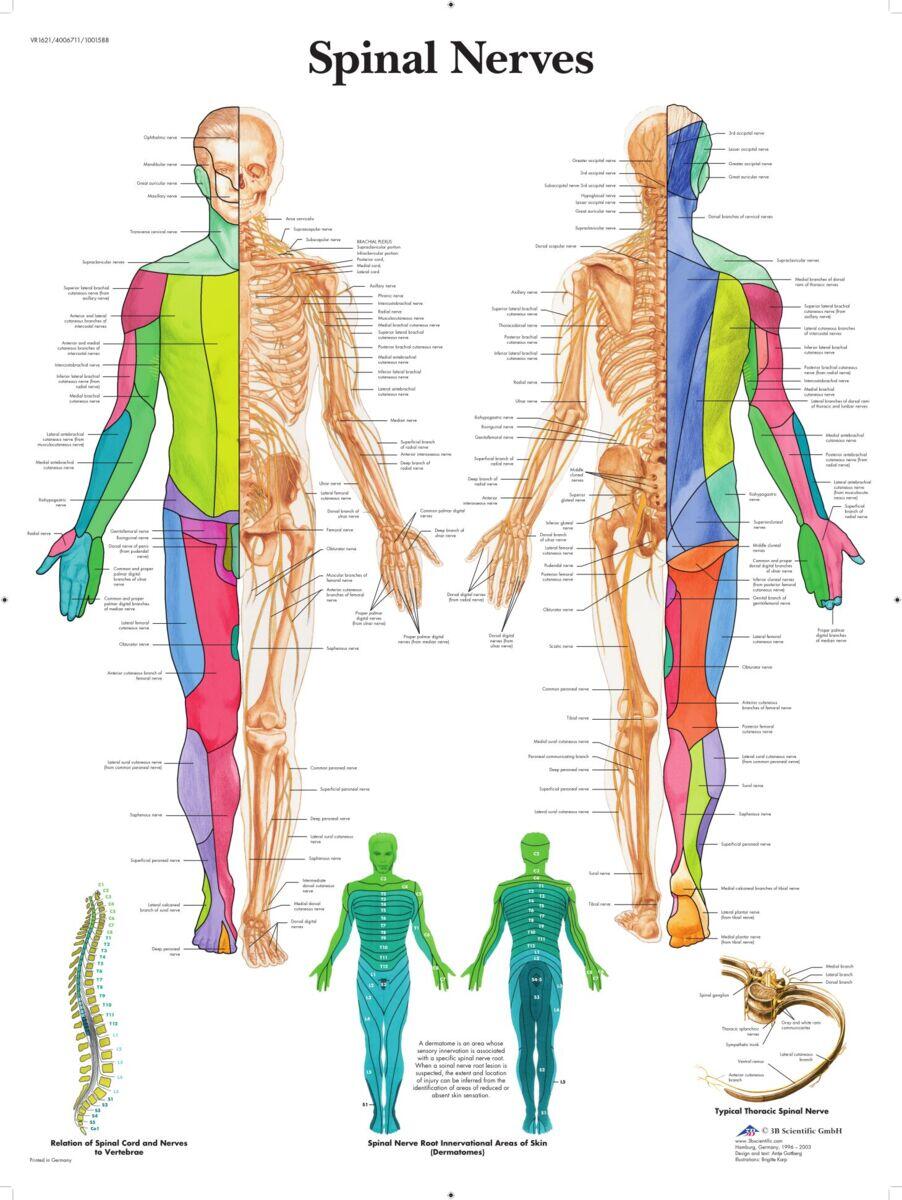 Laminert plansje som viser de perifere nervene og hvilke områder de dekker motorisk og sensorisk. Overflaten er slitesterk og kan tørkes av ved bruk av ikke‑permanent penn. Laminert i miljøvennlig plast. Teksten er på engelsk, og detaljene er angitt på latin. Mål: 50×67 cm.