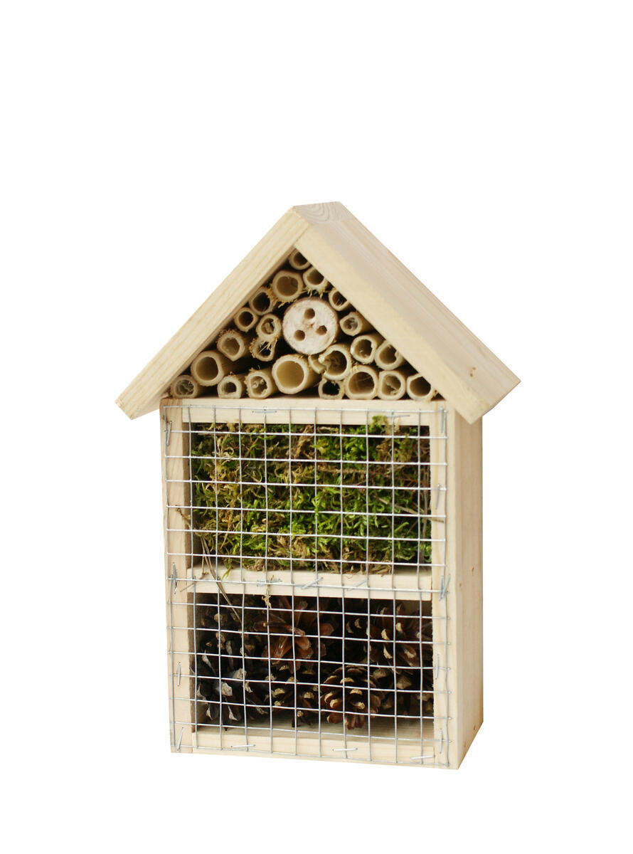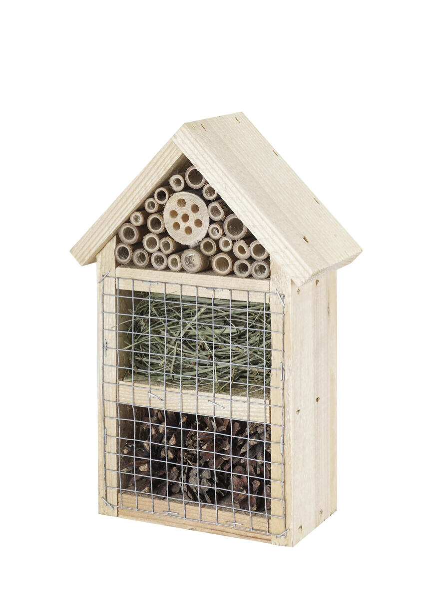 Med et insektshotell kan du gi nyttige insekter beskyttelse og overvintringsmuligheter og på den måten bidra til å øke det biologiske mangfoldet. Her er det plass til bier, sommerfugler og marihøner. Mål: 19x9x28 cm.