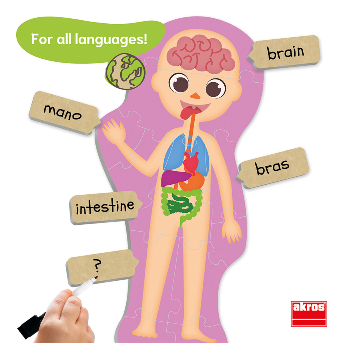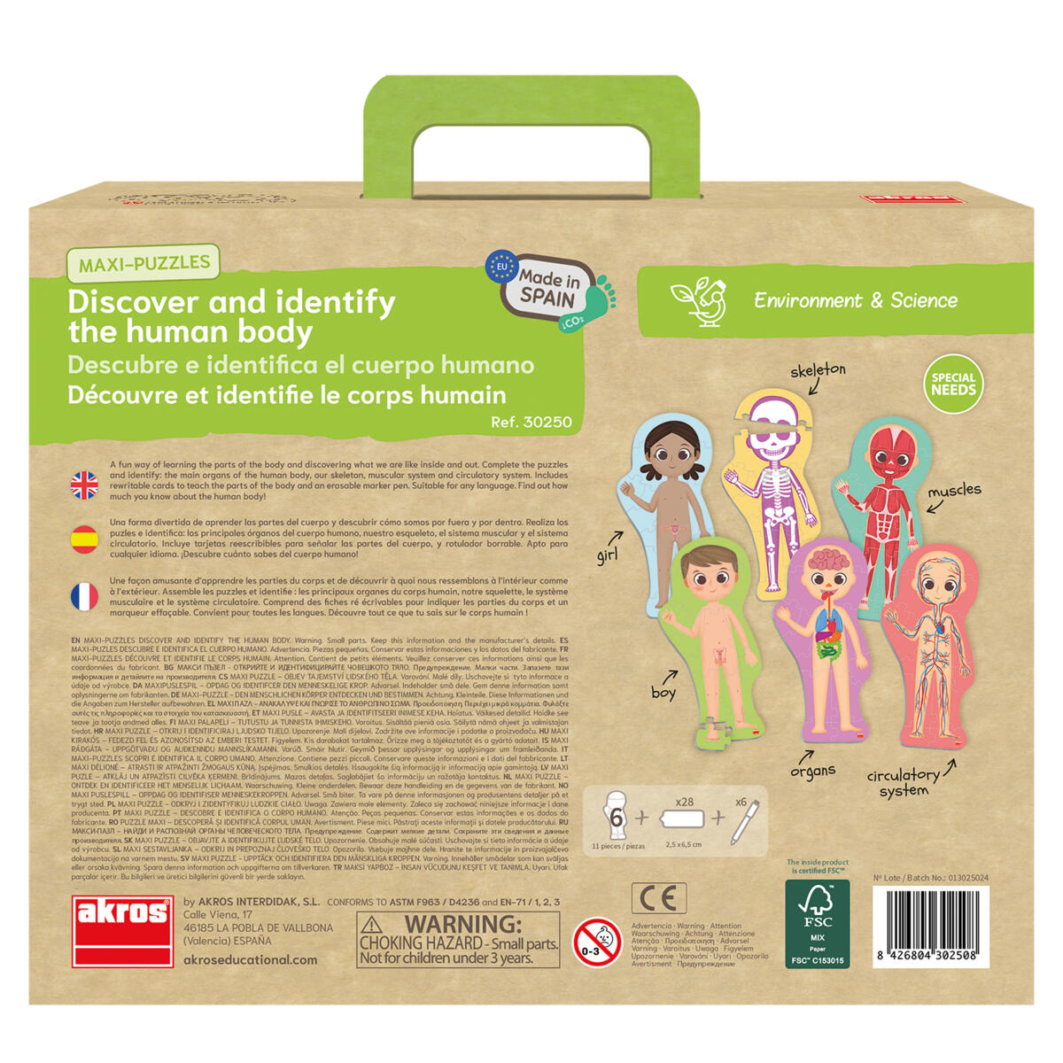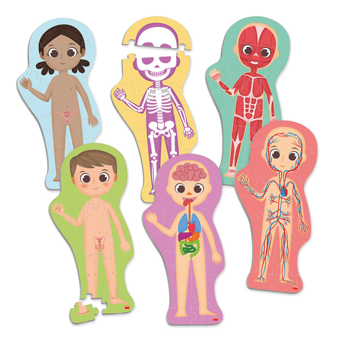 6 puslespill, 11 brikker per puslespill. En morsom måte å lære kroppens deler på. Løs puslespillene og identifiser kroppens viktigste organer, skjelett, muskelsystem og sirkulasjonssystemet. Inneholder omskrivbare kort for å lære kroppens deler, samt en tusj som kan viskes ut. Laget av FSC-merket kartong. PVC-fri. Fra 3 år.