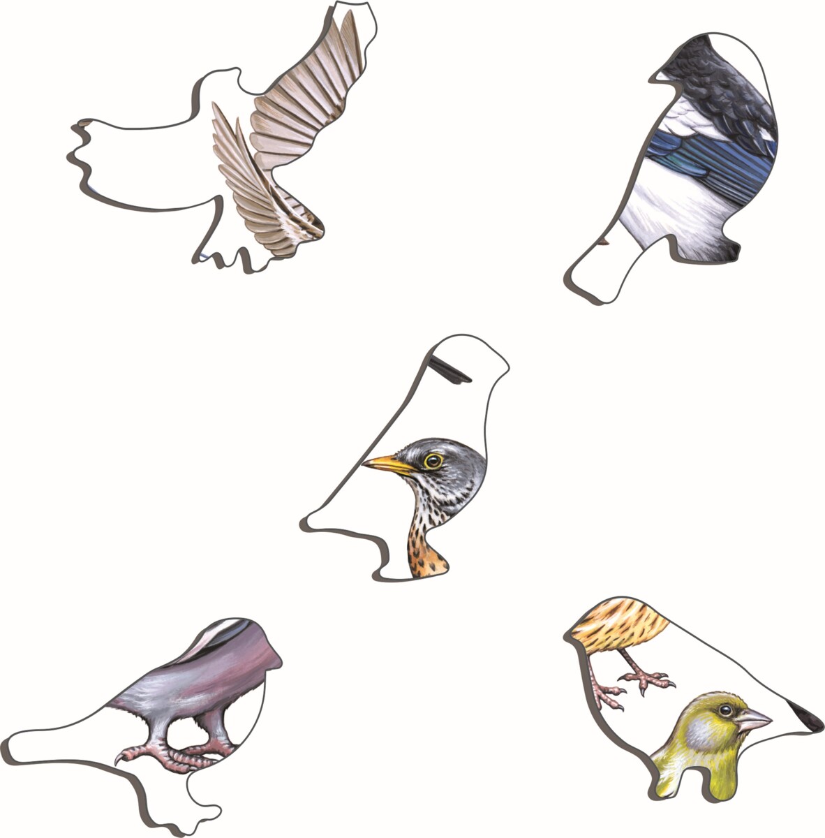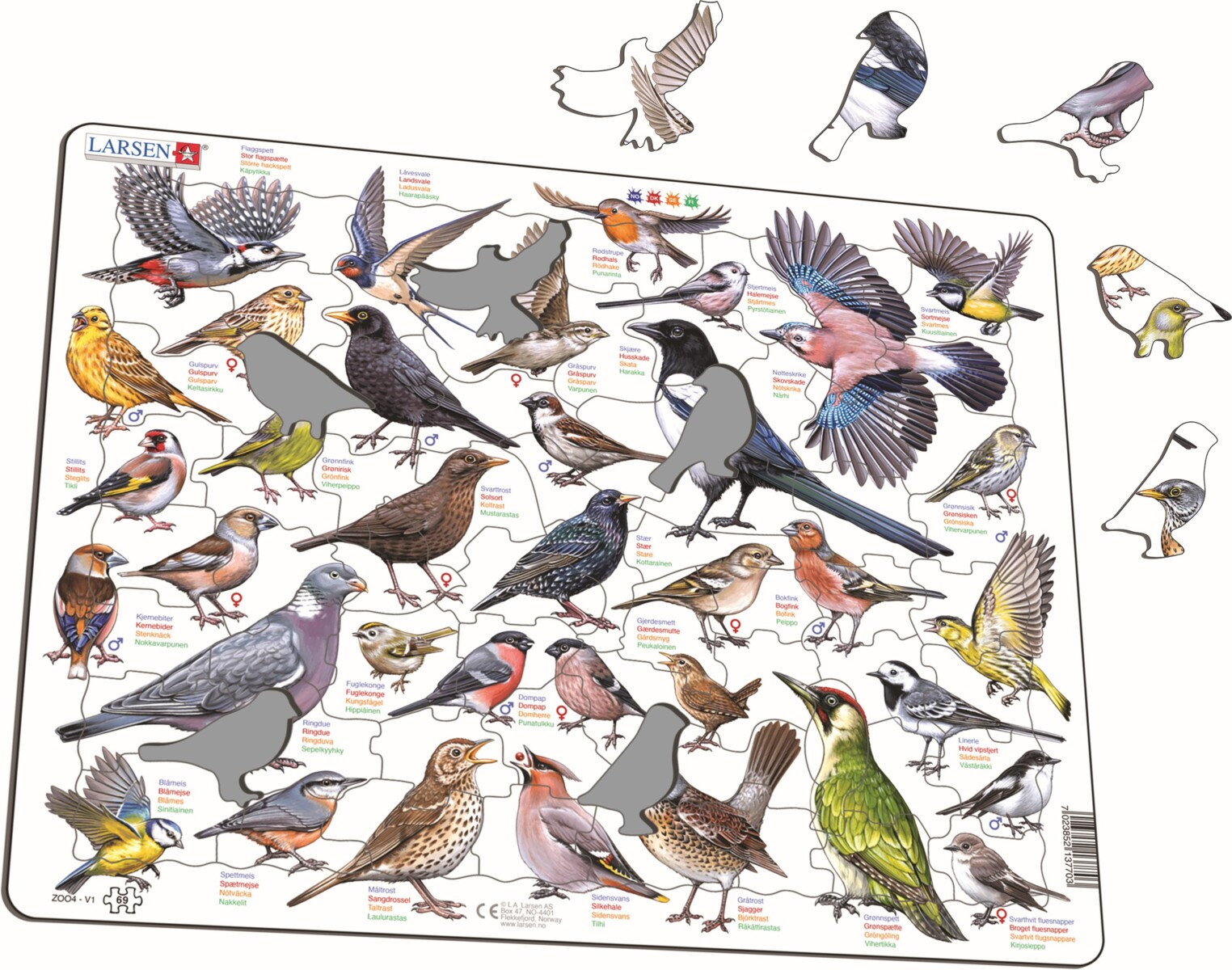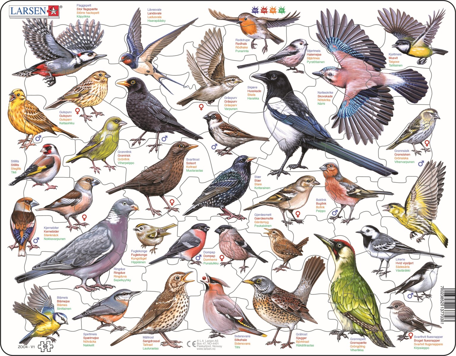 69 brikker. Pedagoisk puslespill med 36 vakre tegninger av fugler som kanskje finnes veldig nær der du bor. på de fuglene som hunn og han er ulike ut finnes det to tegninger. Navn på gulgene finnes på nors, dansk, svensk og finsk. Mål: 36x28 cm. FSC-merket og laget av resirkulert papp.