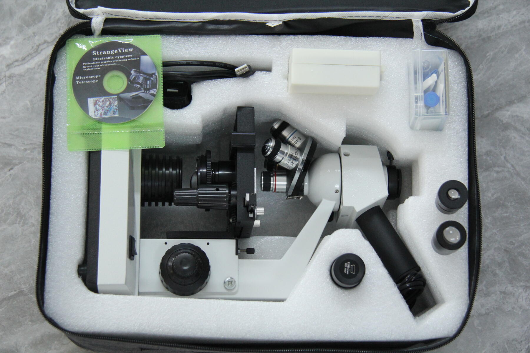 Et avansert digitalt biologisk mikroskop med innebygd kamera og flere funksjoner som gjør det egnet for undervisning, laboratoriearbeid og hobbybruk. Det har et 5,0 megapiksel digitalkamera som kan kobles til datamaskin eller mobil via USB, og et trinokulært hode med total forstørrelse 40x–1000x (4x, 10x, 40x, 100x). Øvrige spesifikasjoner: akromatisk optisk system, mekanisk dobbeltsjiktet bord 115x125 mm med Abbe NA1.25 kondensor, koaksial grov- og finfokuseringsknapp, LED-lyskilde med justerbar lysstyrke. Leveres med 10 ferdigpreparerte objektglass, eksperimentsett, strømadapter og en praktisk oppbevaringsveske.