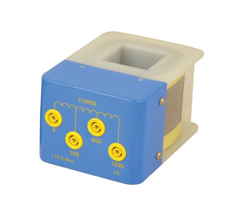 For eksperimenter i fysikk. Spolen er viklet rundt rektangulære isolerende spoler og koblet til et panelfeste. Jordpinnen kobles til frontpanelet og 4 mm stikkontakt. Alle koblinger er fullstendig omgitt av panelhuset. En separat stikkontakt med støpt støpsel følger med. Total høyde 70 mm. 2 A og 0,55 W.