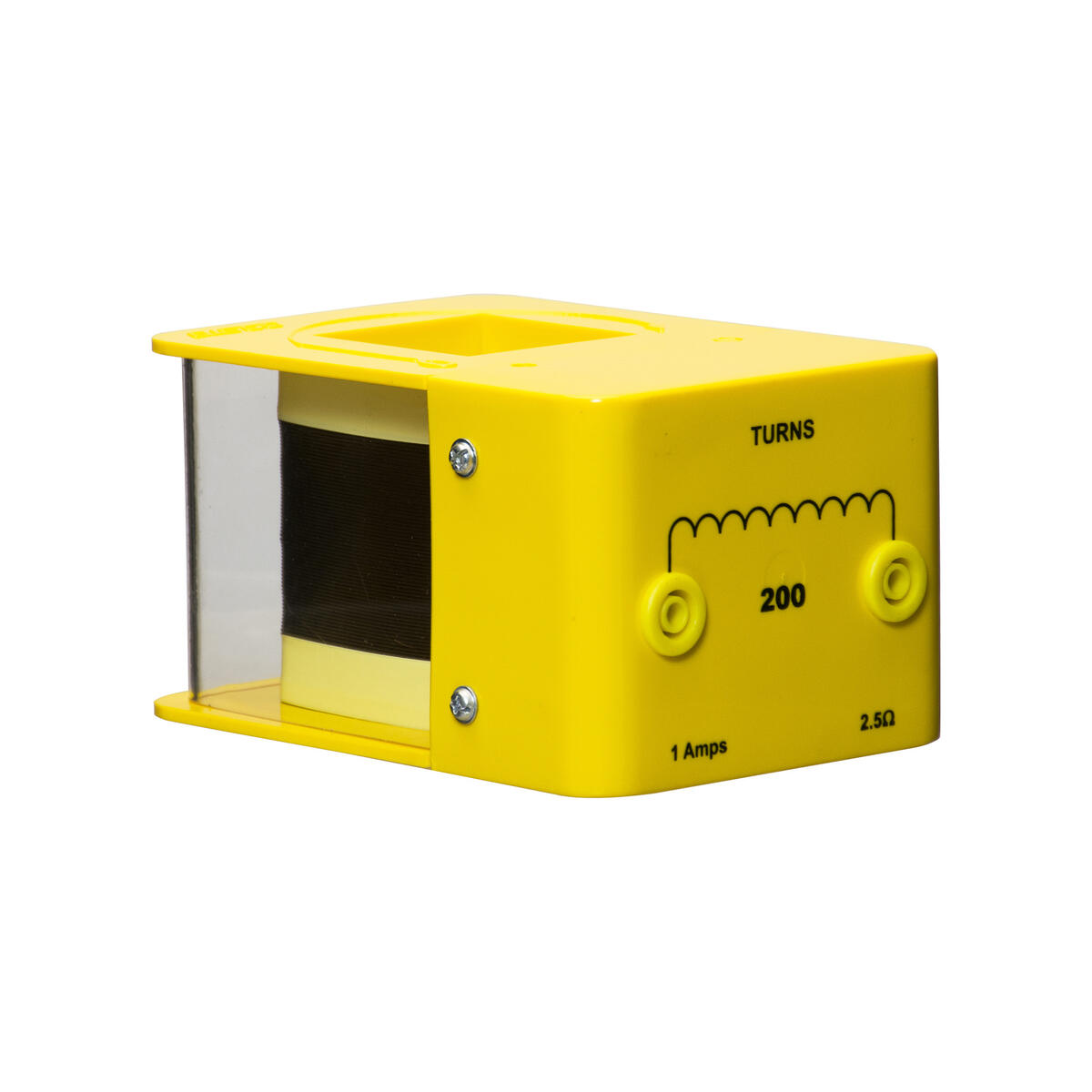 For eksperimenter i fysikk. Spolen er viklet rundt rektangulære isolerende spoler og koblet til et panelfeste. Jordpinnen kobles til frontpanelet og 4 mm stikkontakt. Alle koblinger er fullstendig omgitt av panelhuset. En separat stikkontakt med støpt støpsel følger med. Total høyde 70 mm. 1 A og 2,5 W.
