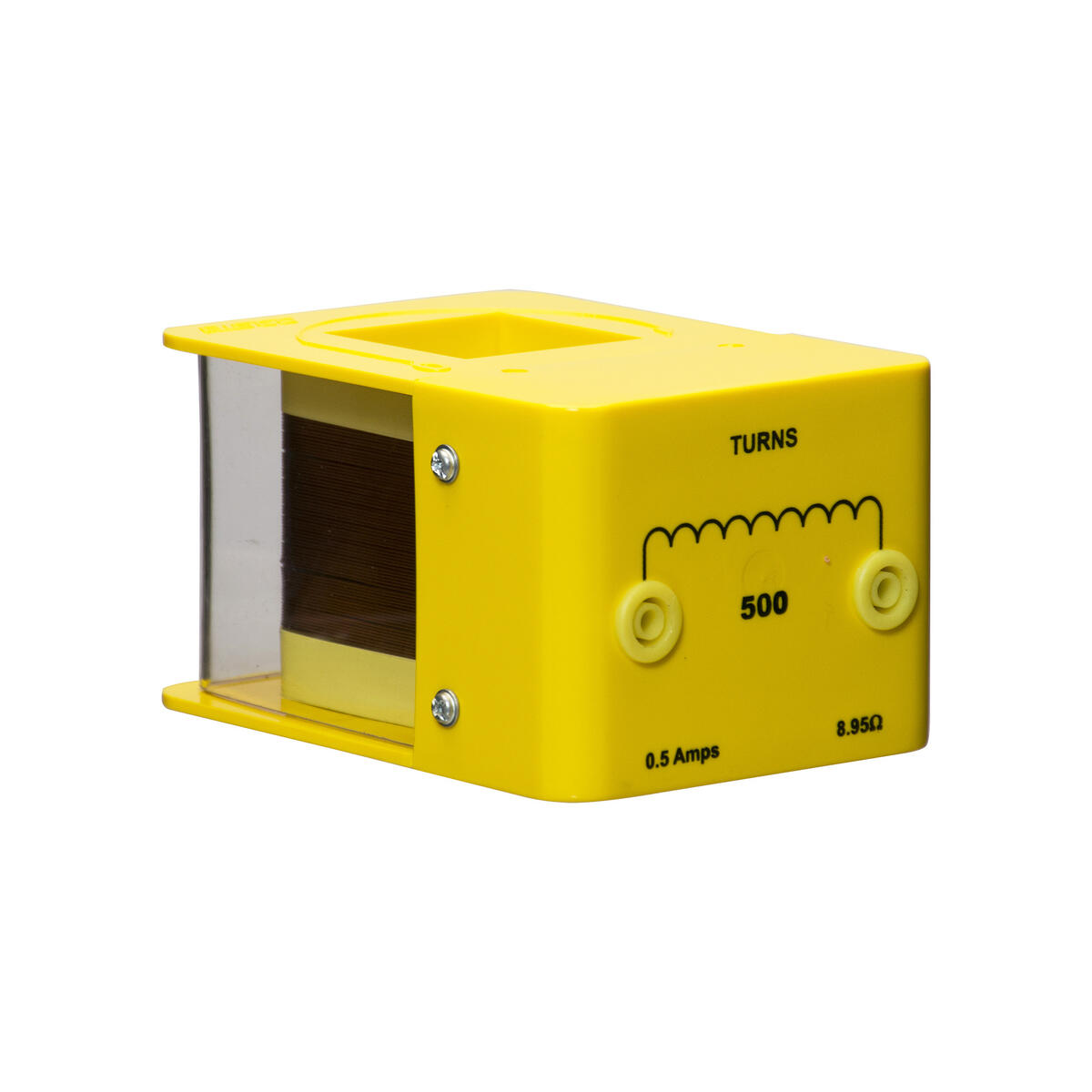 For eksperimenter i fysikk. Spolen er viklet rundt rektangulære isolerende spoler og koblet til et panelfeste. Jordpinnen kobles til frontpanelet og 4 mm stikkontakt. Alle koblinger er fullstendig omgitt av panelhuset. En separat stikkontakt med støpt støpsel følger med. Total høyde 70 mm. 0,5 A og 8,95 W.