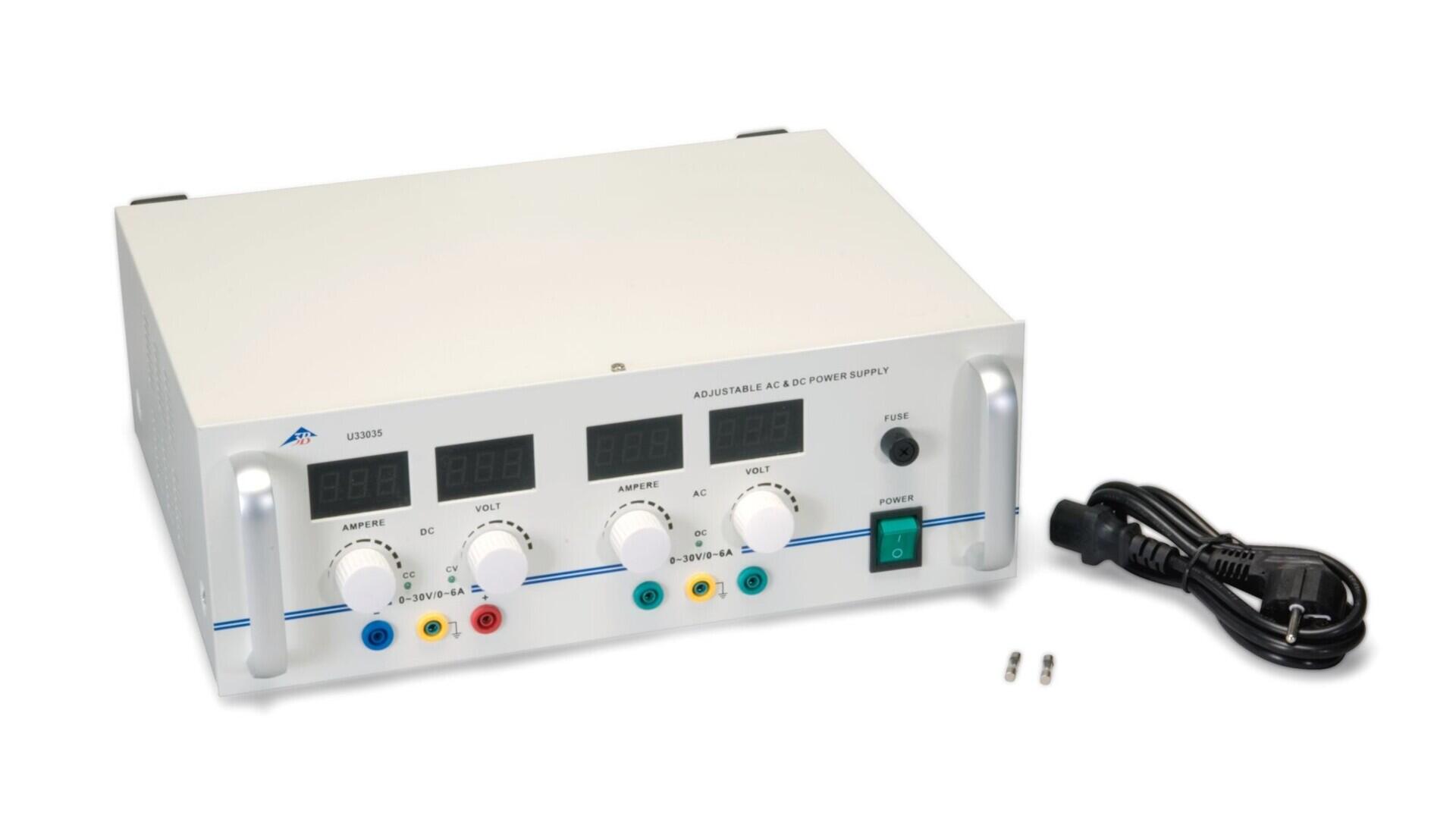 Kombinert strømforsyning med separate AC- og DC-utganger samt separate skjermer for utgangsspenning og strøm. DC-utgangen kan brukes som spenningskilde eller strømkilde og kan stilles inn til hvilken som helst verdi innenfor sitt område. AC-utgangen har strømbegrensning og er elektronisk beskyttet mot overbelastning. Tilkobling skjer med laboratoriekabler, 4 mm banankontakt. Metallhus.