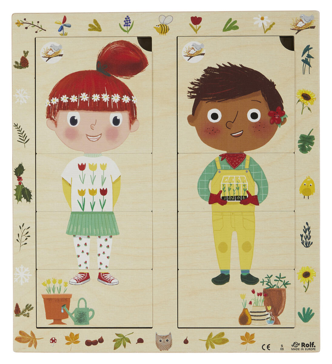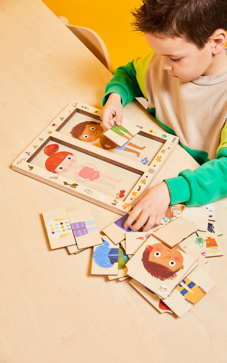 Øv på å kle seg etter årstiden. Puslespillet har 5 lag og viser ulike klær som passer til våre fire årstider. Mål: 26×29×2 cm. Laget av FSC-merket tre. Fra 3 år.