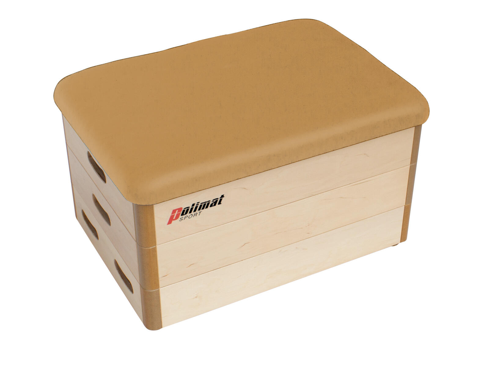 3-delt kombikasse med overdel trukket i kunstlær. Brukes til hoppøvelser og gymnastikk. Lengde: 70 cm, bredde: 50 cm, høyde: 40 cm. Laget av kryssfiner, tre og kunstlær.
