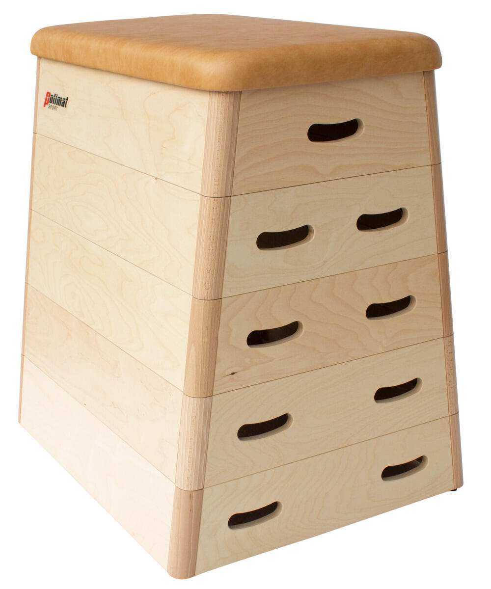 5-delt kombikasse med overdel trukket i kunstlær. Brukes til hoppøvelser og gymnastikk. Lengde: 82 cm, bredde: 64/45 cm, høyde: 87 cm. Laget av kryssfiner, tre og kunstlær.