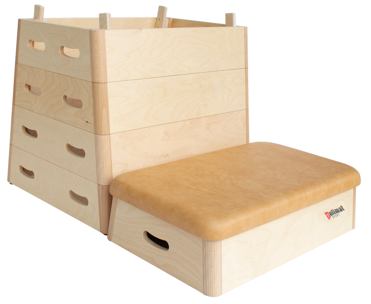Tredelt kasse i skum som gjør at barna ikke slår seg. Delene sitter sammen med borrelås. De ulike nivåene kan brukes hver for seg eller sammen., slik at høyden kan tilpasses ulike øvelser. Bærehåndtak på nederste del for enklere flytting. Sklisikker underside. Av PU-skum og trekk av PVC, uten forbudte ftalater. Mål: 130x40/77x105 cm