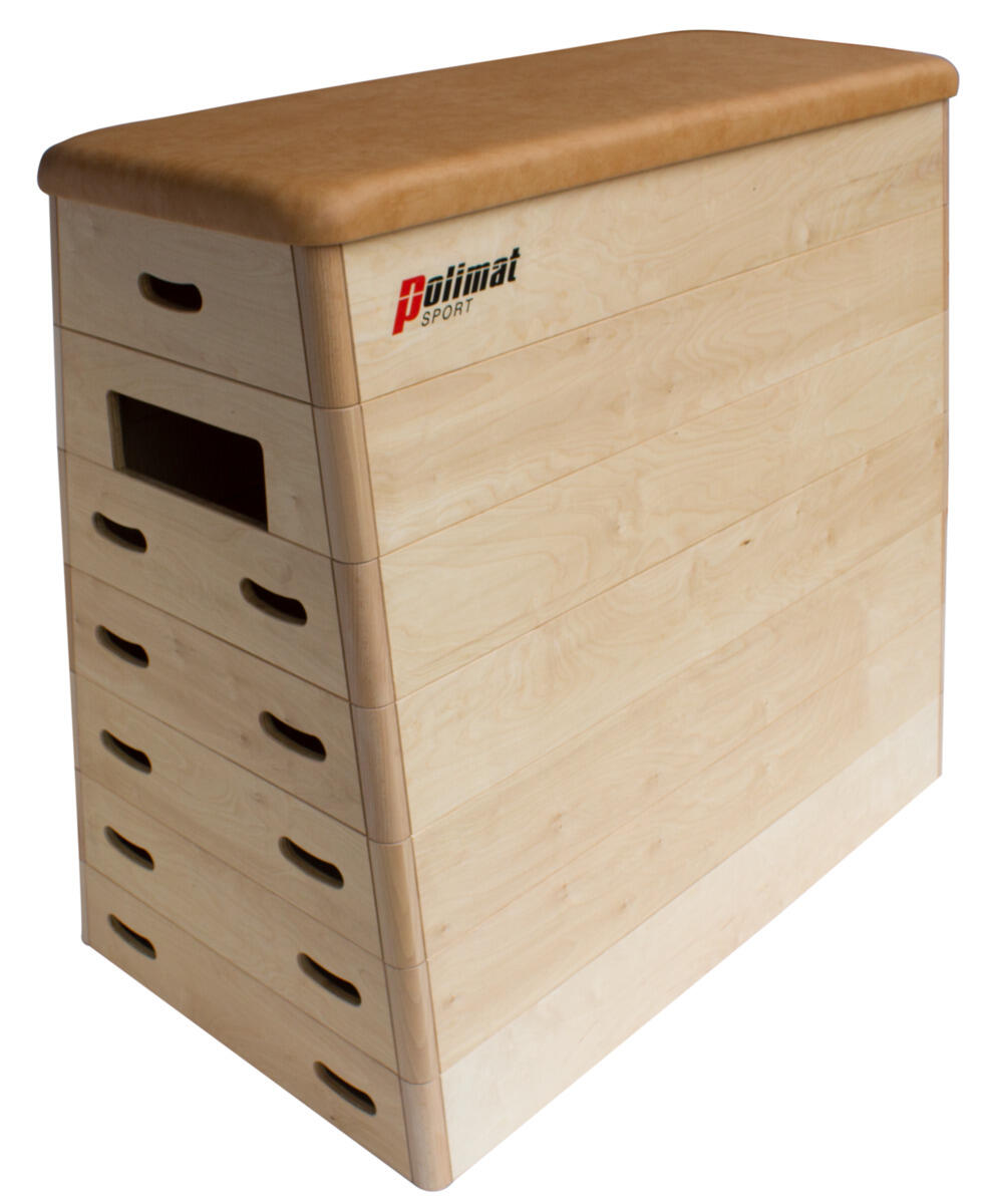 Tredelt kasse i skum som gjør at barna ikke slår seg. Delene sitter sammen med borrelås. De ulike nivåene kan brukes hver for seg eller sammen., slik at høyden kan tilpasses ulike øvelser. Bærehåndtak på nederste del for enklere flytting. Sklisikker underside. Av PU-skum og trekk av PVC, uten forbudte ftalater. Mål: 130x40/77x105 cm