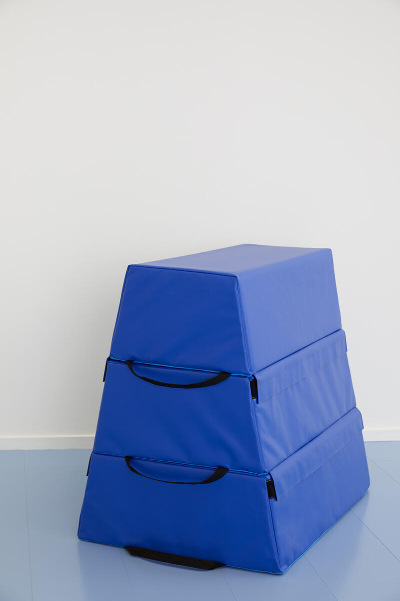 Tredelt kasse i skum som gjør at barna ikke slår seg. Delene sitter sammen med borrelås. De ulike nivåene kan brukes hver for seg eller sammen., slik at høyden kan tilpasses ulike øvelser. Bærehåndtak på nederste del for enklere flytting. Sklisikker underside. Av PU-skum og trekk av PVC, uten forbudte ftalater. Mål: 130x40/77x105 cm