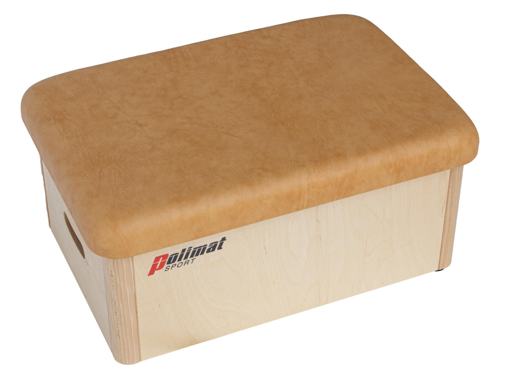 Hoppkasse med overdel trukket i kunstlær. Brukes til hoppøvelser og gymnastikk. Lengde: 50 cm, bredde: 30 cm, høyde: 30 cm. Laget av kryssfiner, tre og kunstlær.