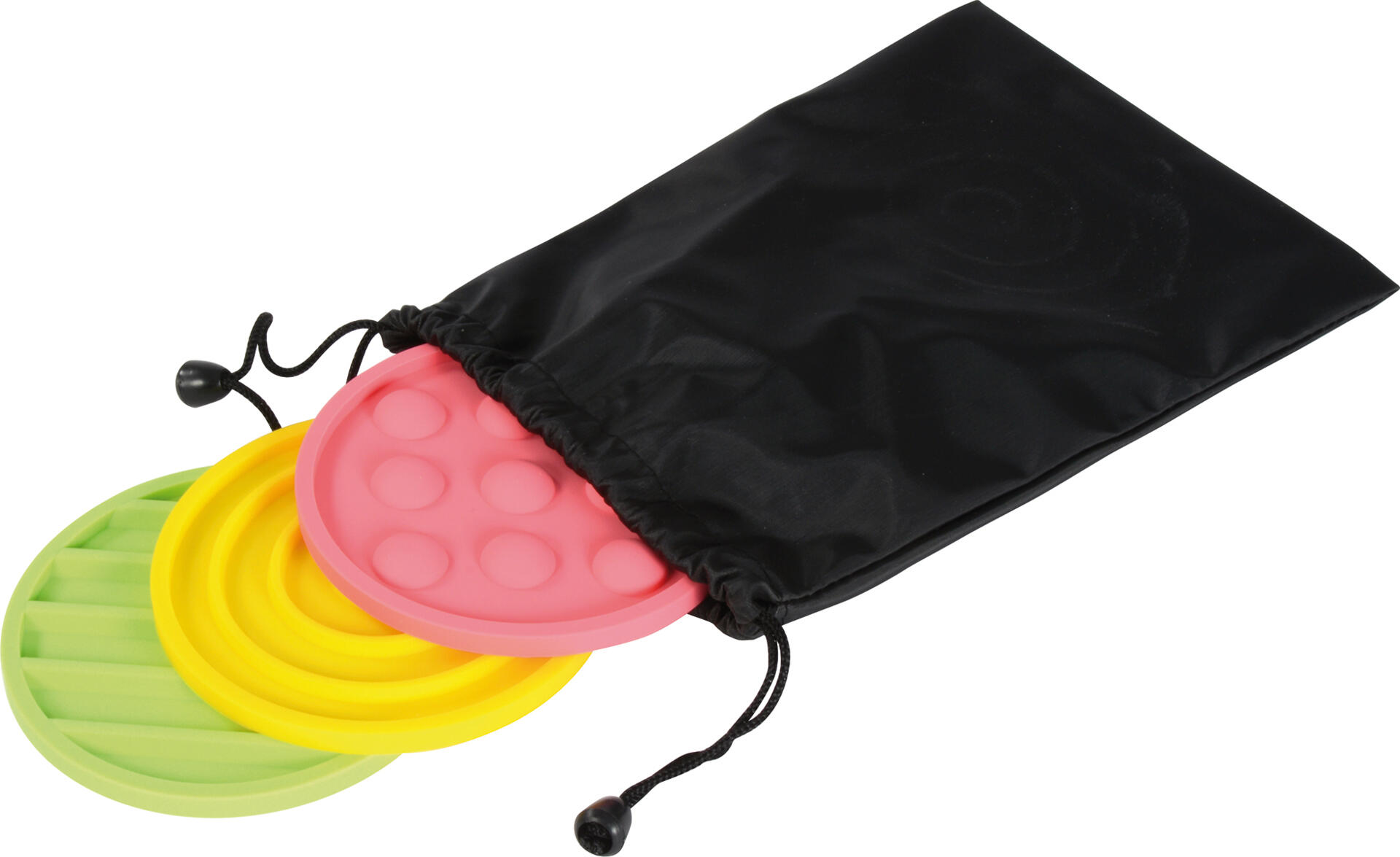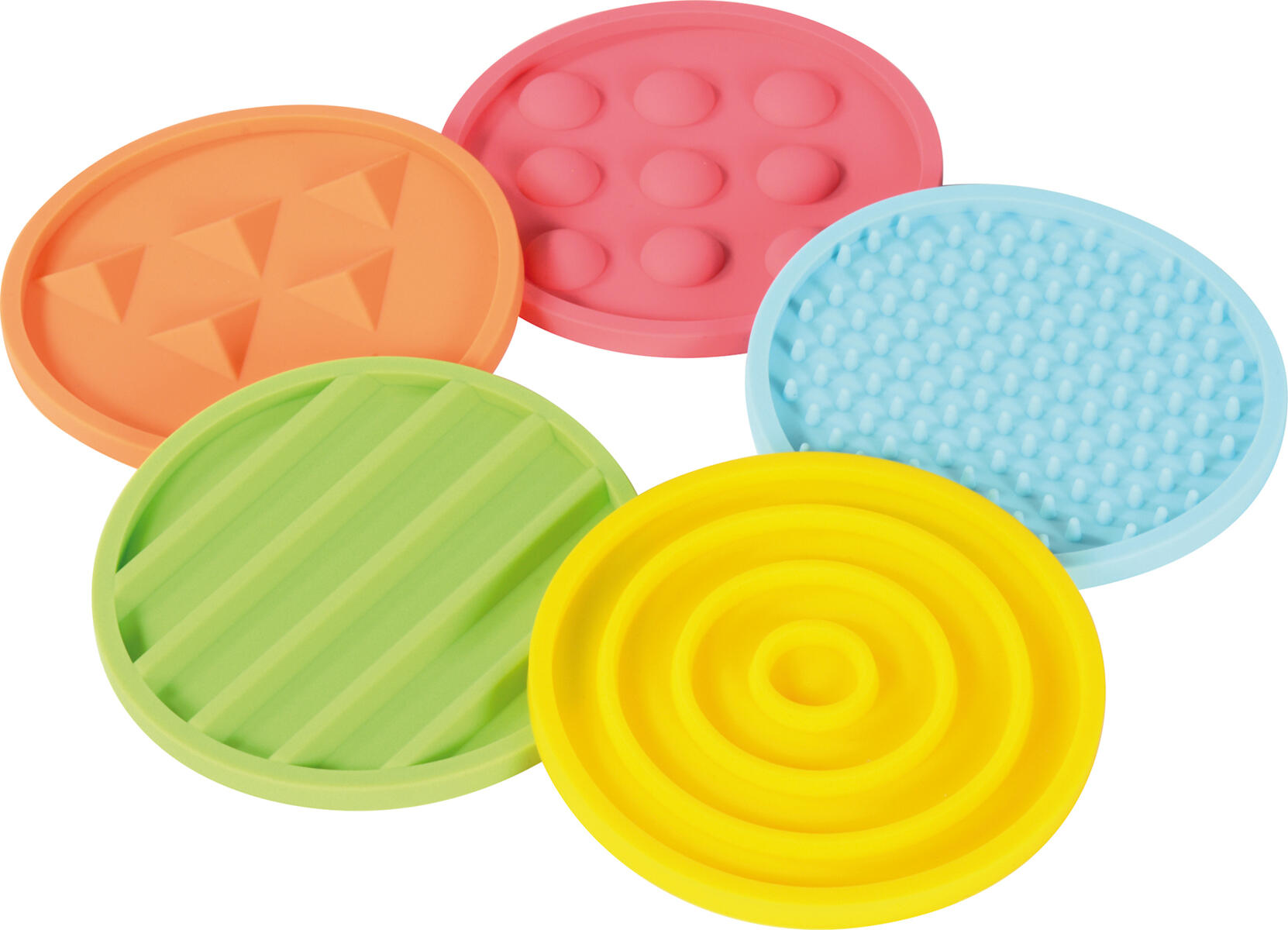 Markeringsplater i ulike former og størrelser med forskjellige strukturer. Bygg baner eller lek sanseleker der barnet trekker en silikonmatte opp av posen uten å se. Etter å ha kjent på overflaten, prøver de å finne samme struktur på en stor silikonmatte med føttene. Platene er sklisikre og kan enkelt rengjøres med vann. Sett med 5 store og 5 små plater. Posen følger med til de små platene. Laget av silikon. PVC-fri. Fra 3 år.