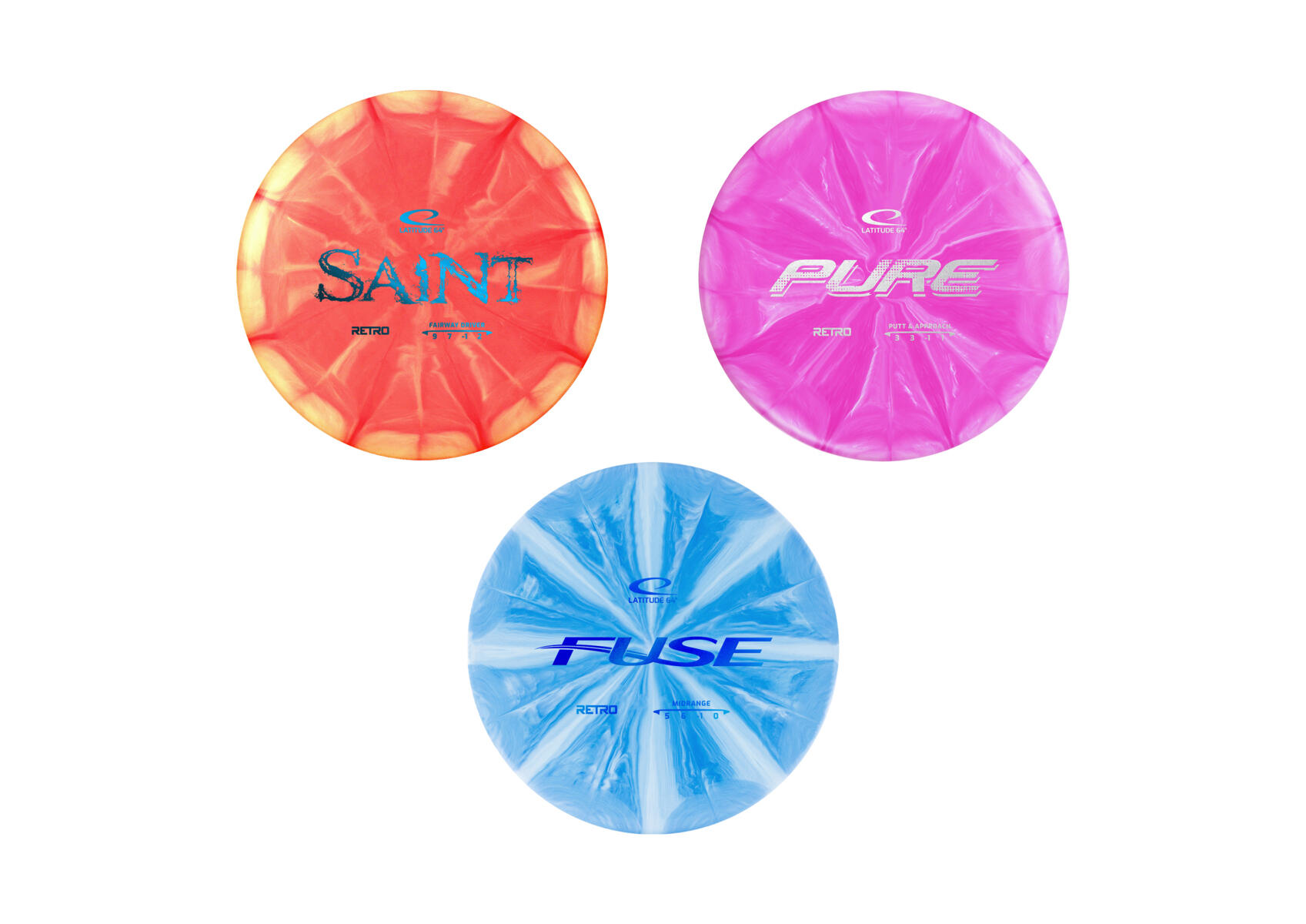 3 discer til discgolf; 1 driver, 1 putter og 1 midrange. Samtlige frisbeer er utformet for bruk på skolen og for de som vil utforske denne sporten. Blandede farger. Vekt 173-176 g. Av TPE.