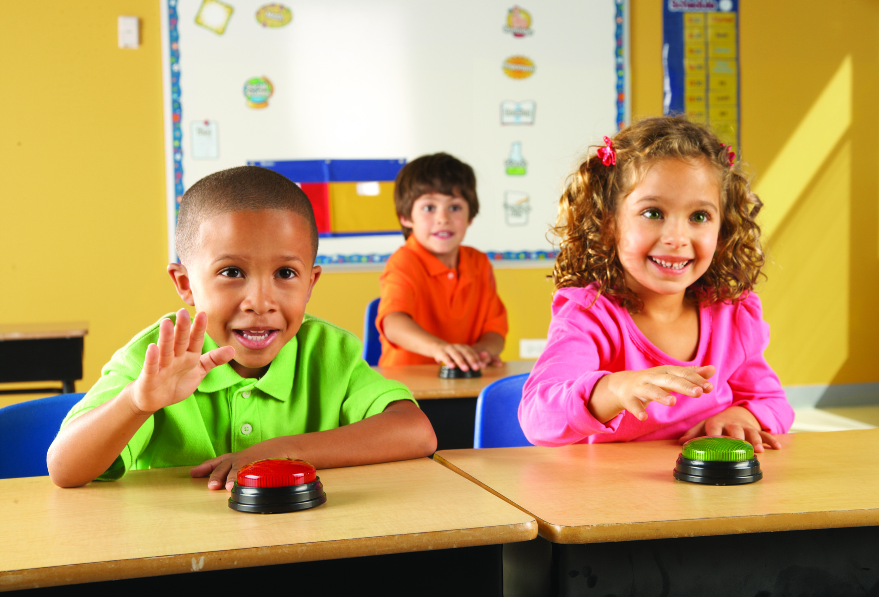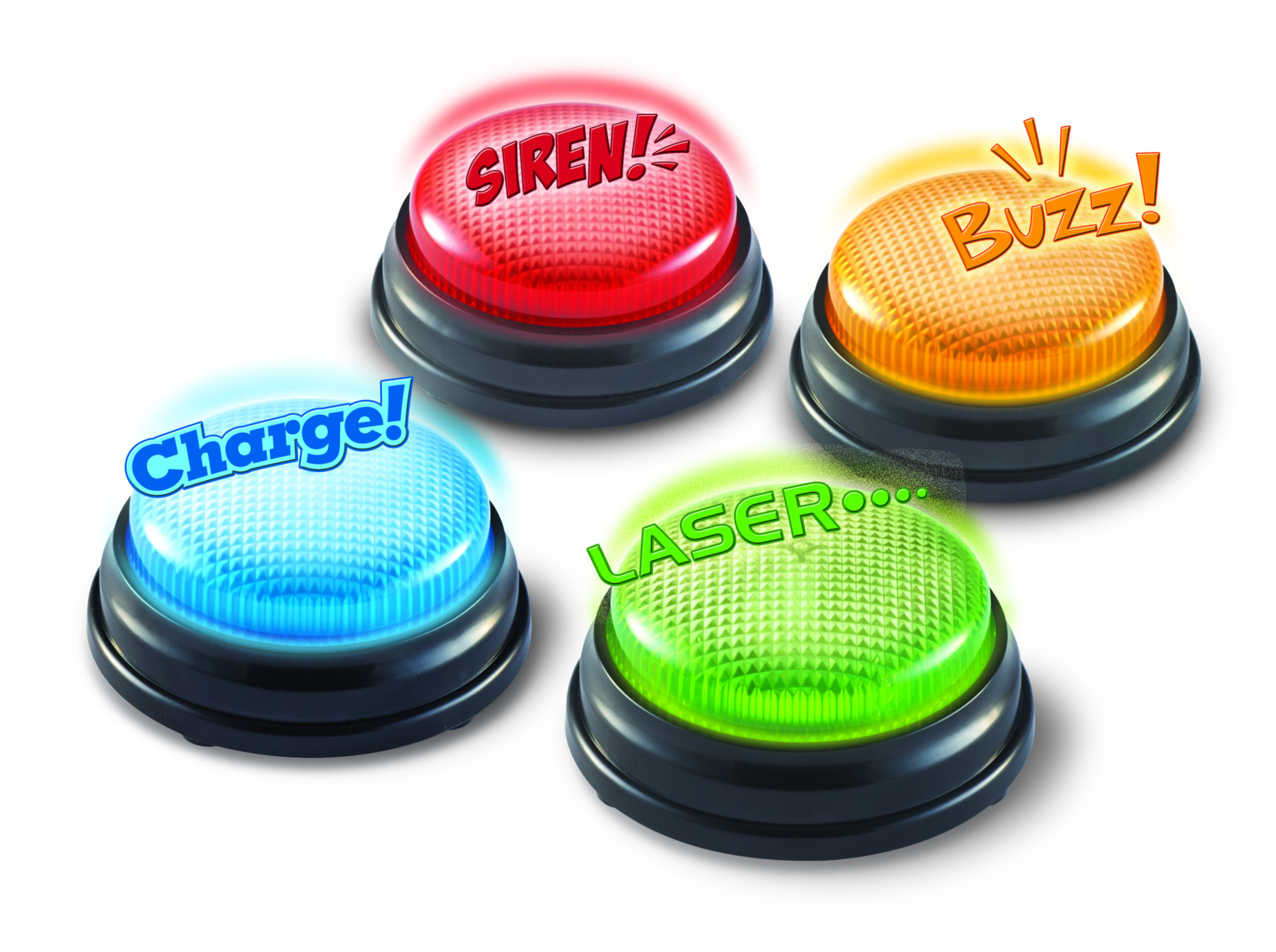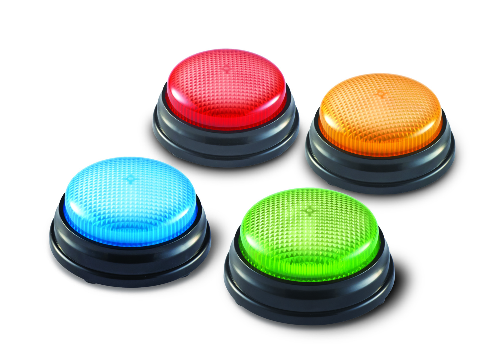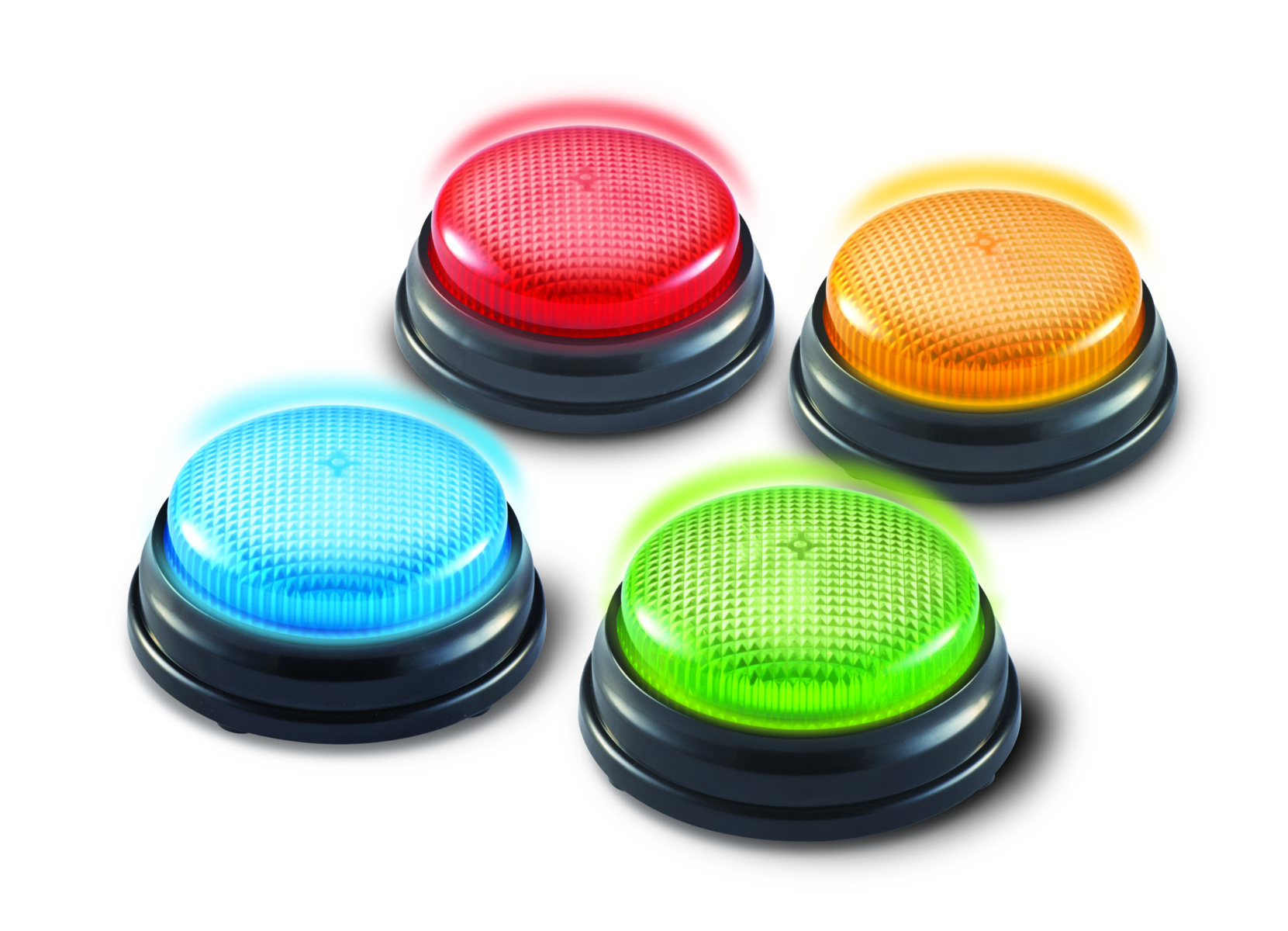 4 stk/pk. Knappene som både lyser og lager lyd gjør leksjoner og leker morsommere. Kan også brukes for å signalisere at man trenger hjelp. Hver farge har en unik lyd. Mål: ca. 9 cm. Krever 2 stk AAA-batterier (ikke inkludert). Fra 3 år.