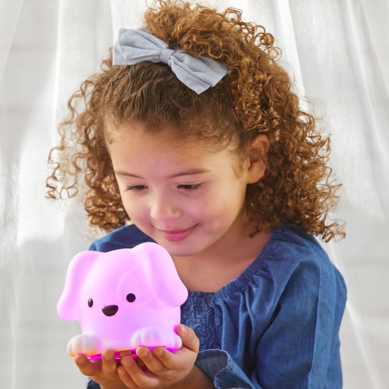 Valp som beroliger med hjelp av pusteøvelser. Sammen med den blir barna bevisste på sine tanker og følelser. Tre forskjellige pustemønstre: puste i kvadrat, 4x4 pusting og stigende pusting. Gir et mykt lys i 5 forskjellige farger. Lades med den medfølgende USB-kabelen. Materiale: Laget av HIPS og PVC, uten forbudte ftalater. Mål: 13x10x10 cm. Fra 3 år.