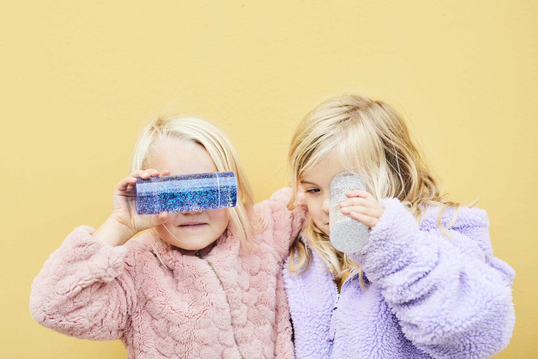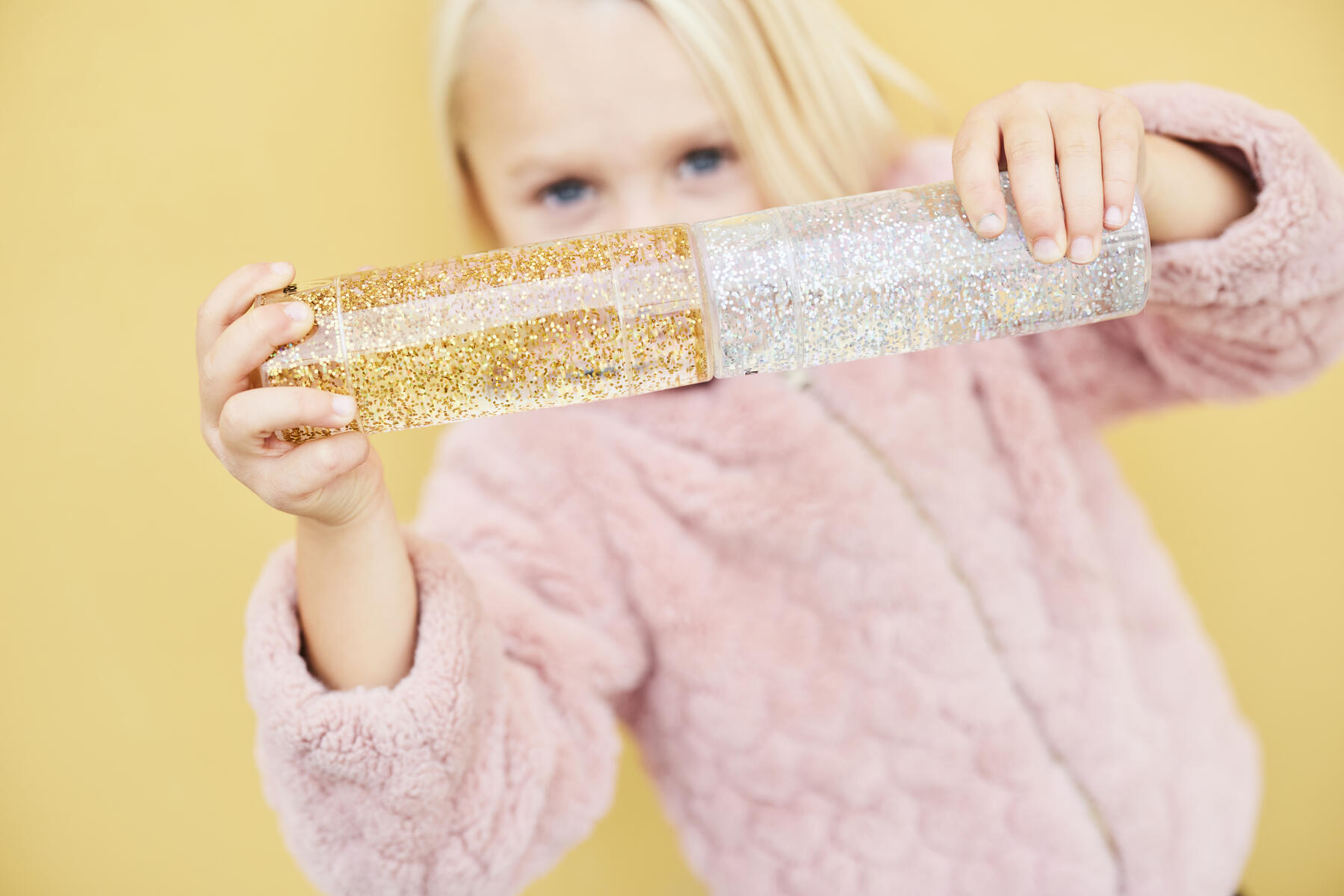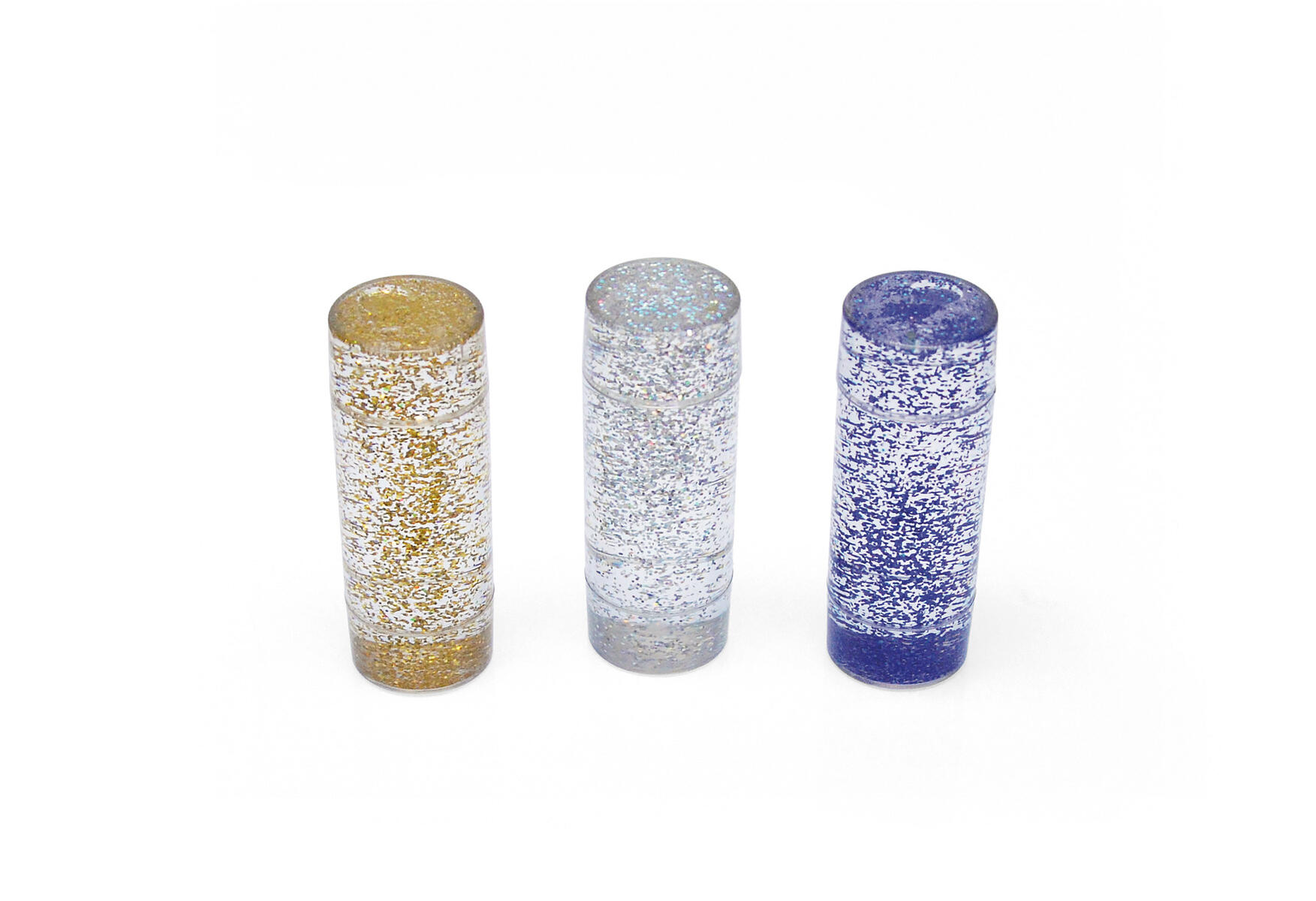 3 stk/pk. De vakre glitrende sylindrene inneholder farget mineralolje og vann. Når de snus opp-ned beveger glitteret seg på en tiltalende måte. Gir inspirasjon til sensorisk og visuell stimulering. Mål: 14x5 cm. Fra 3 år.